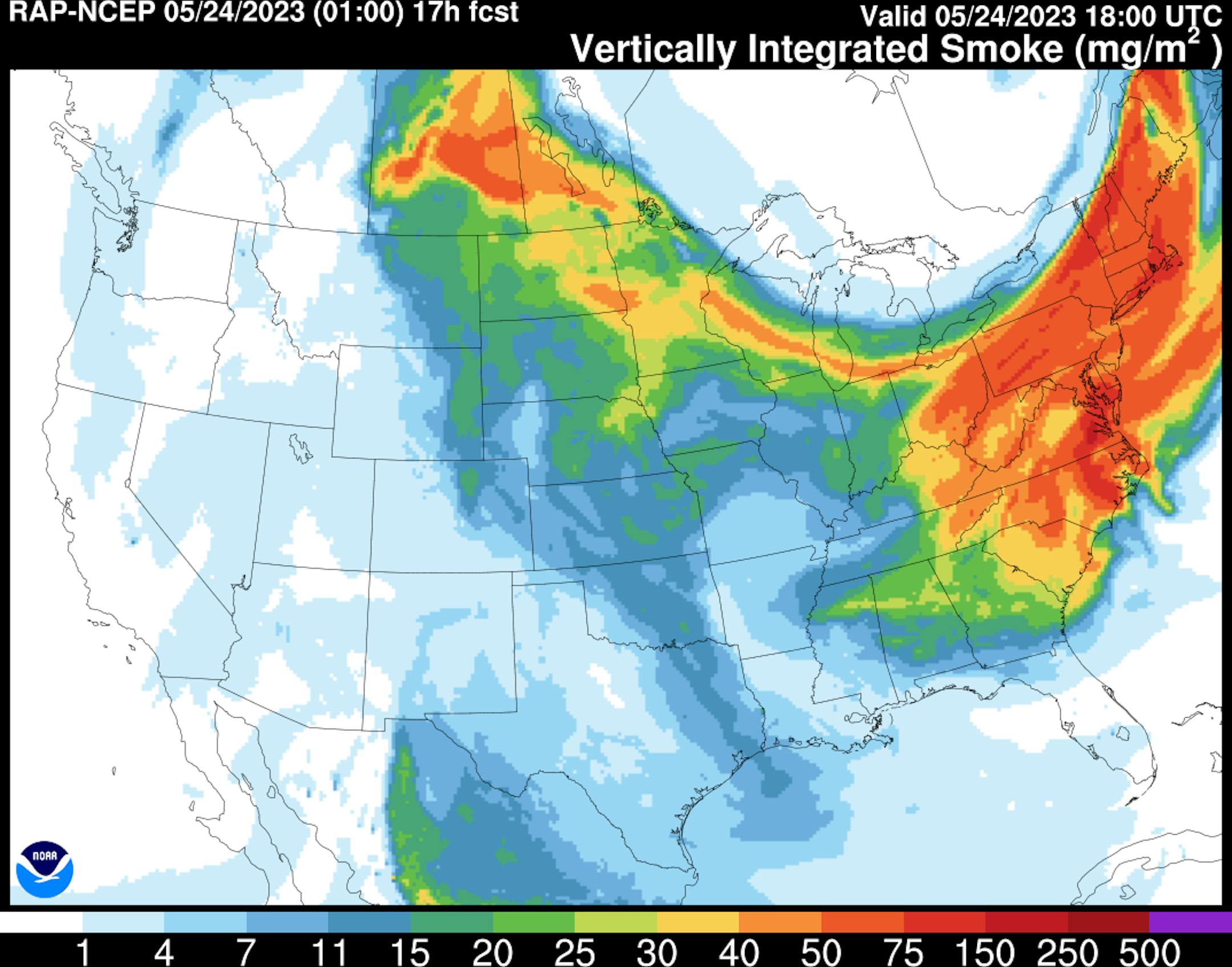 The smoke analysis by midday Tuesday shows widespread smoke overhead across the Upper Midwest and Great Lakes Region thanks to wildfires burning in Canada. This will make skies smoky and hazy through much of the day with unhealthy air qualities.