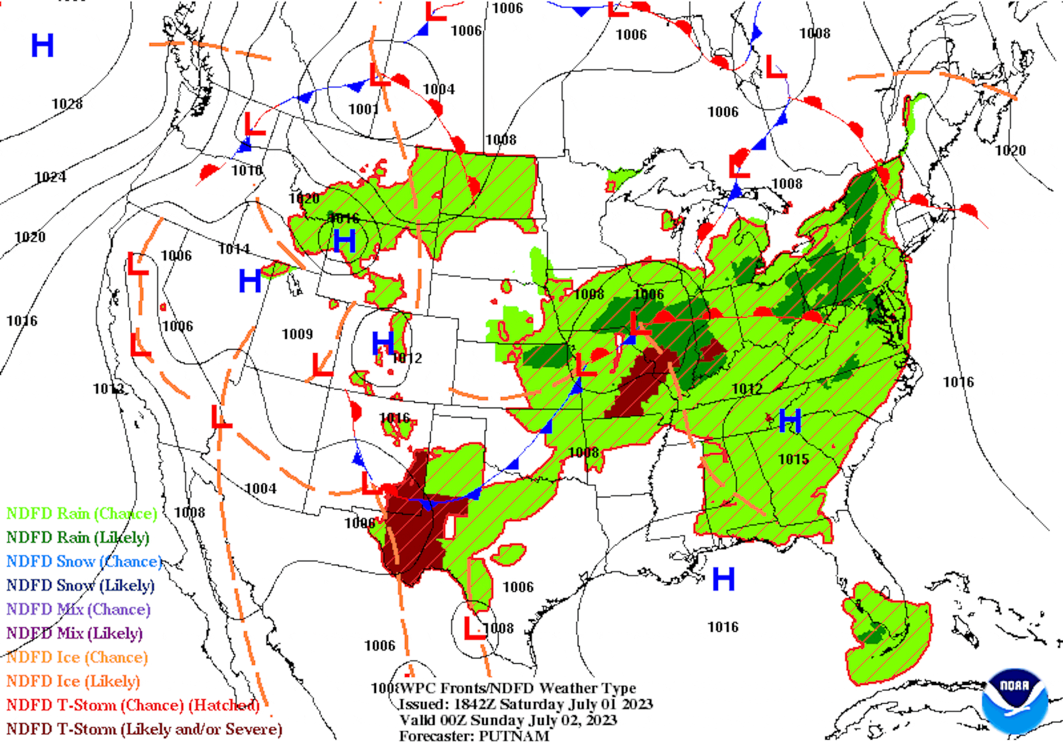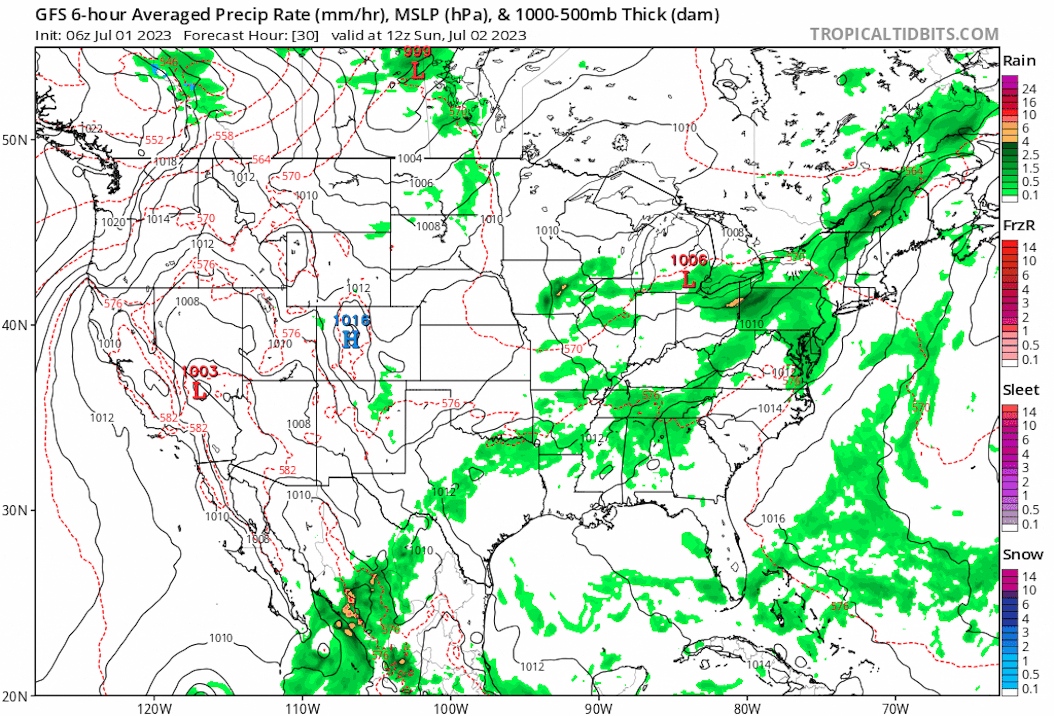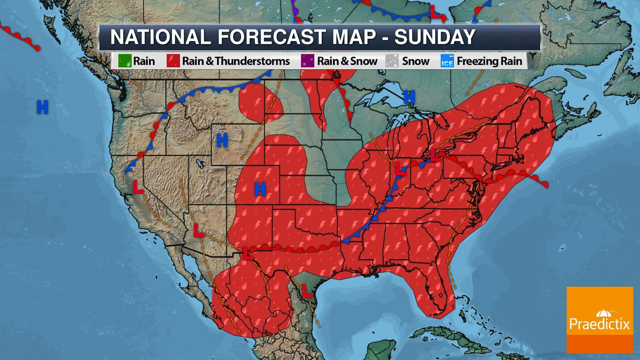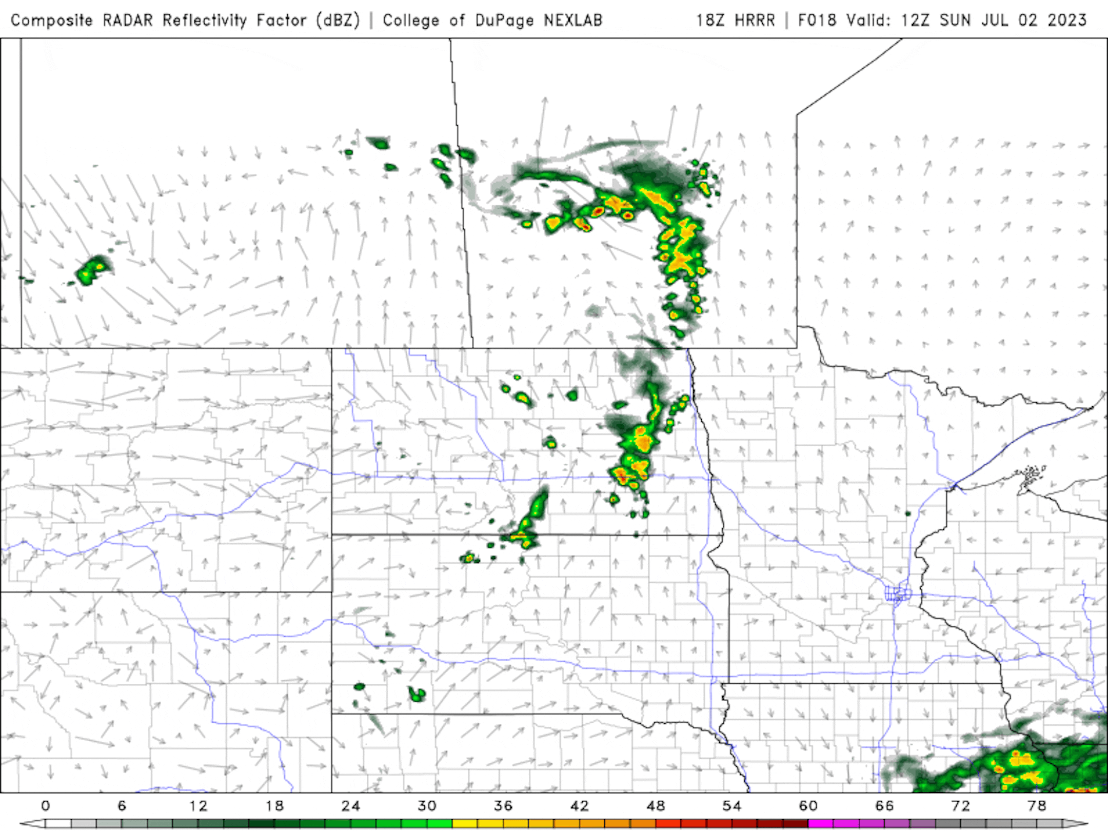 The simulated radar from AM Sunday to Midday Monday shows mostly dry and quiet weather across the state with the exception of the far NW corner of the state later into the weekend. The thunder threat will increase even more as we head into the early part of next week. Stay tuned...