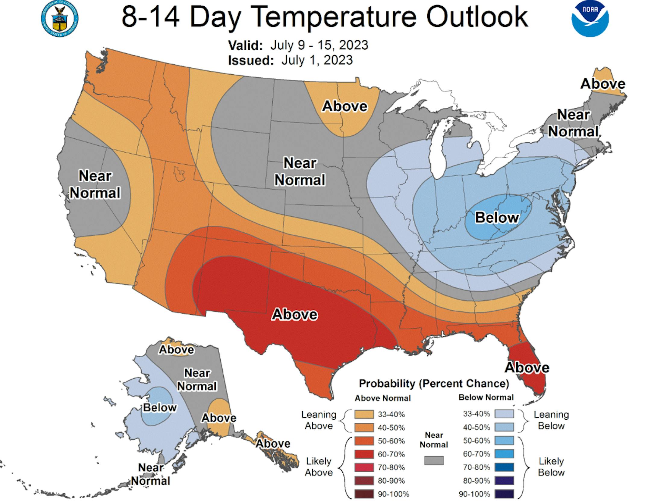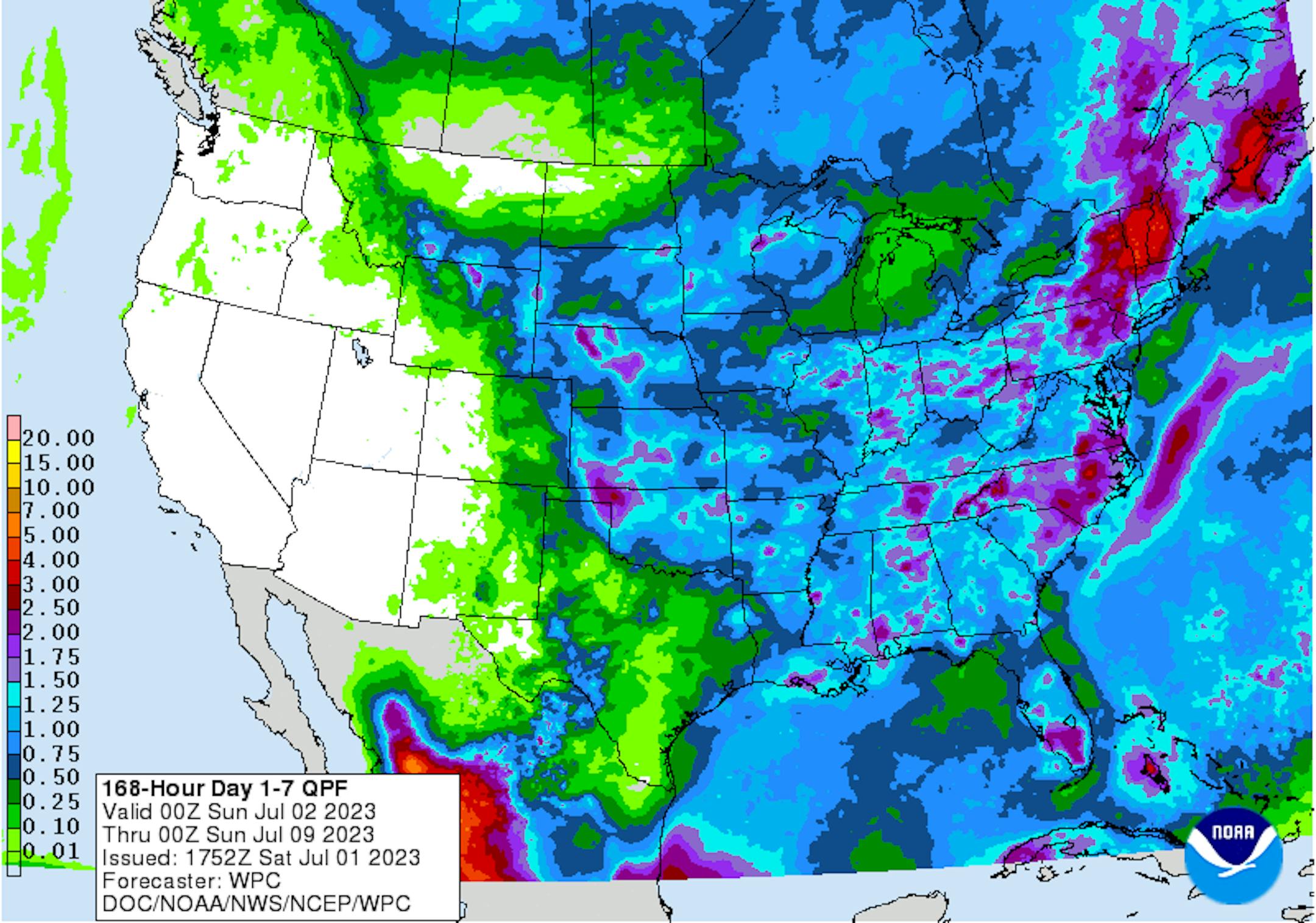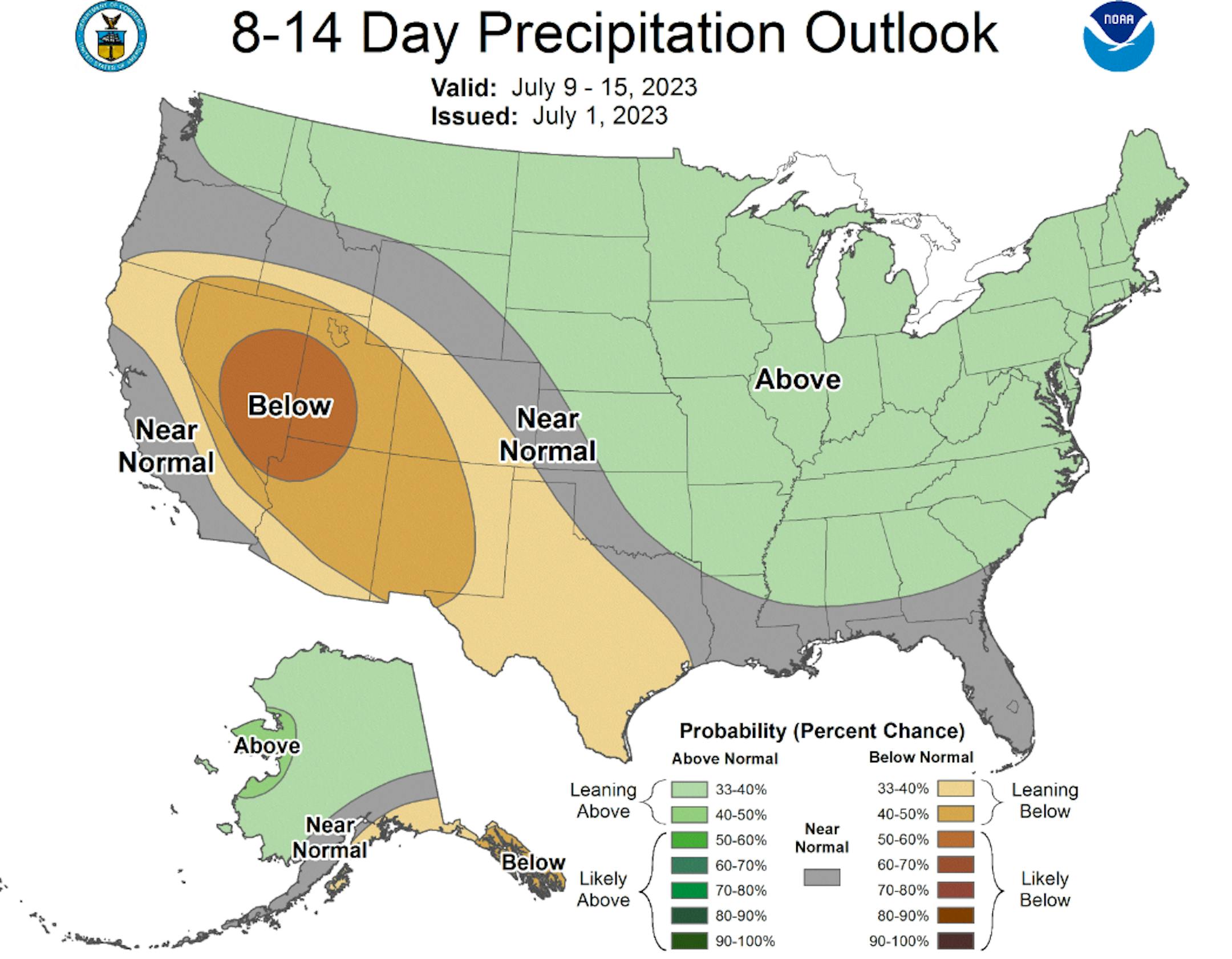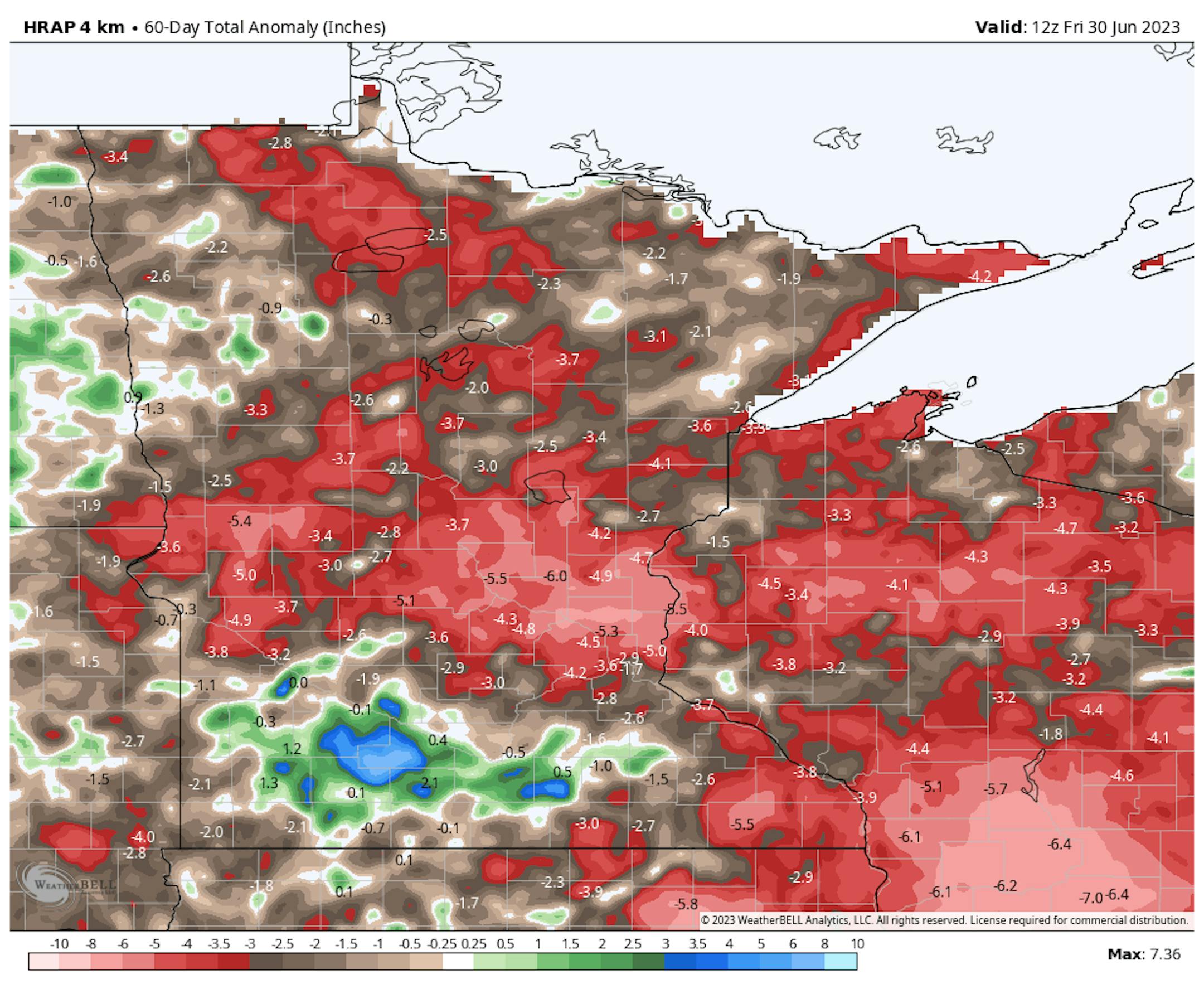 The map below shows the 60 day precipitation anomaly, which indicates that some locations are nearly -3.00" to nearly -6.00" below average (in red) since mid May. This is where drought conditions are expanding.
