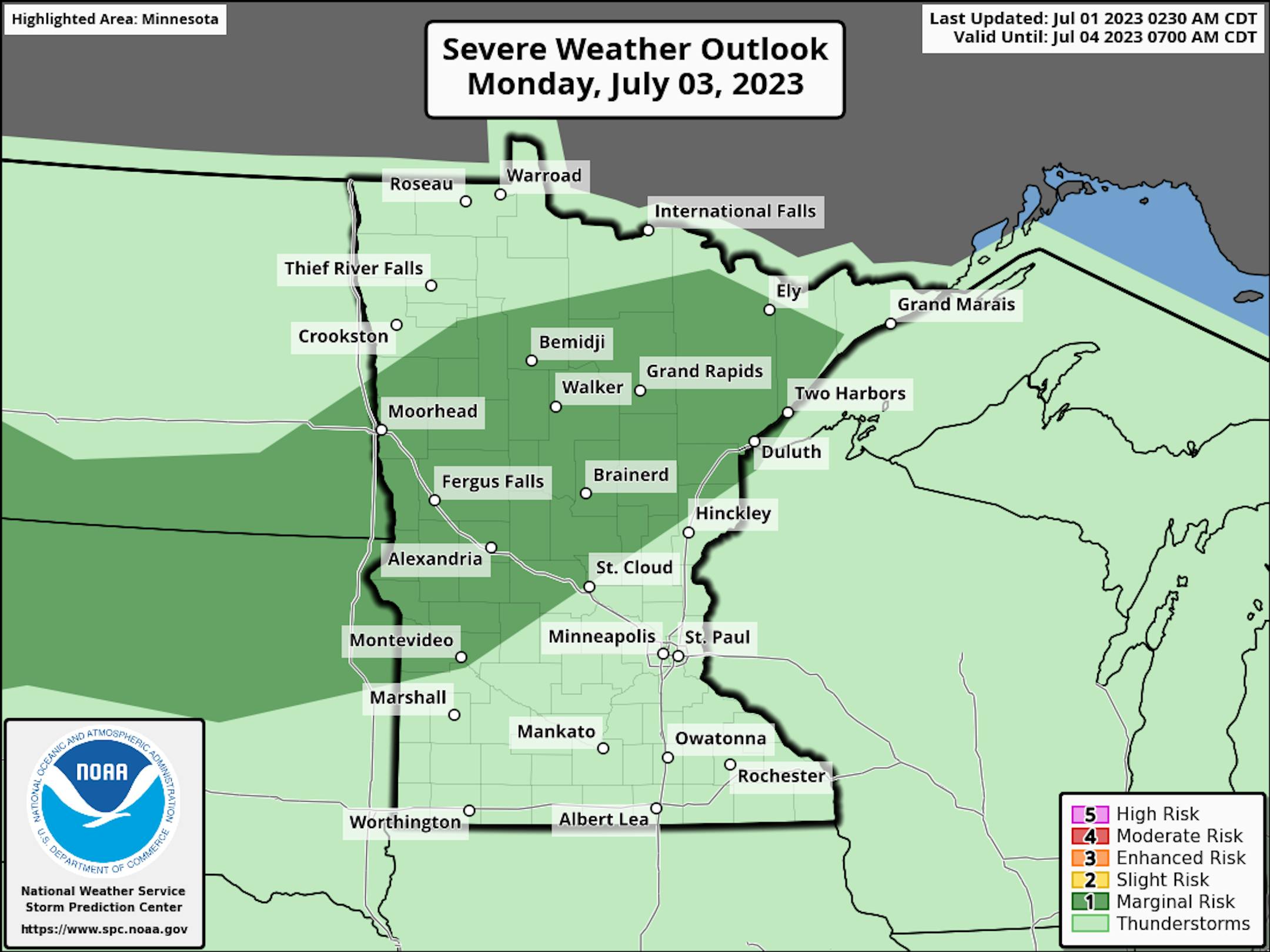 According to NOAA's Storm Prediction Center, there is a risk of strong to severe thunderstorms on Monday across parts of central and northern Minnesota. The threat remains pretty isolated at this point with the greatest risks being gusty winds and hail. Stay tuned...