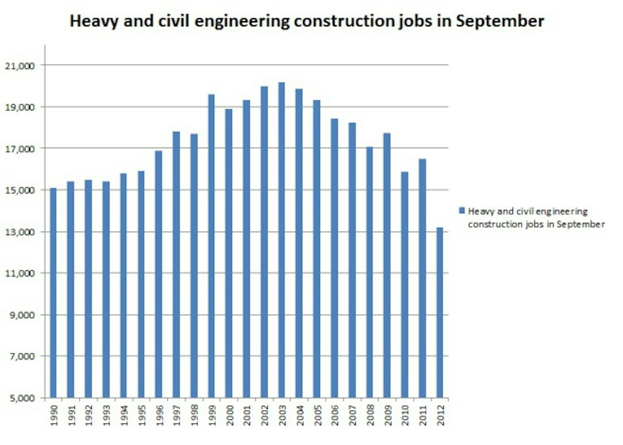 In September, 13,184 people worked in heavy and civil engineering construction in Minnesota, a 20 percent drop compared to 12 months earlier.