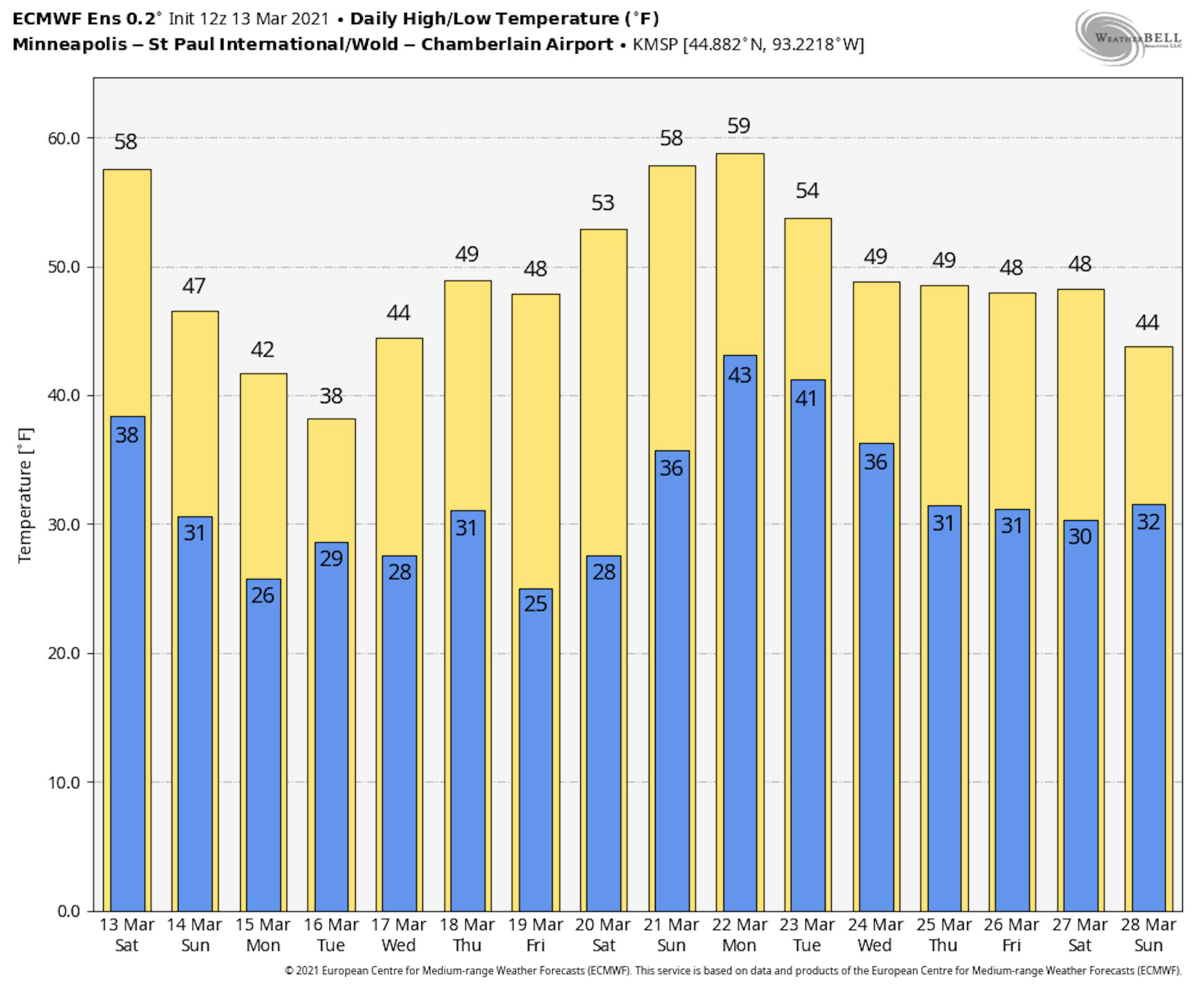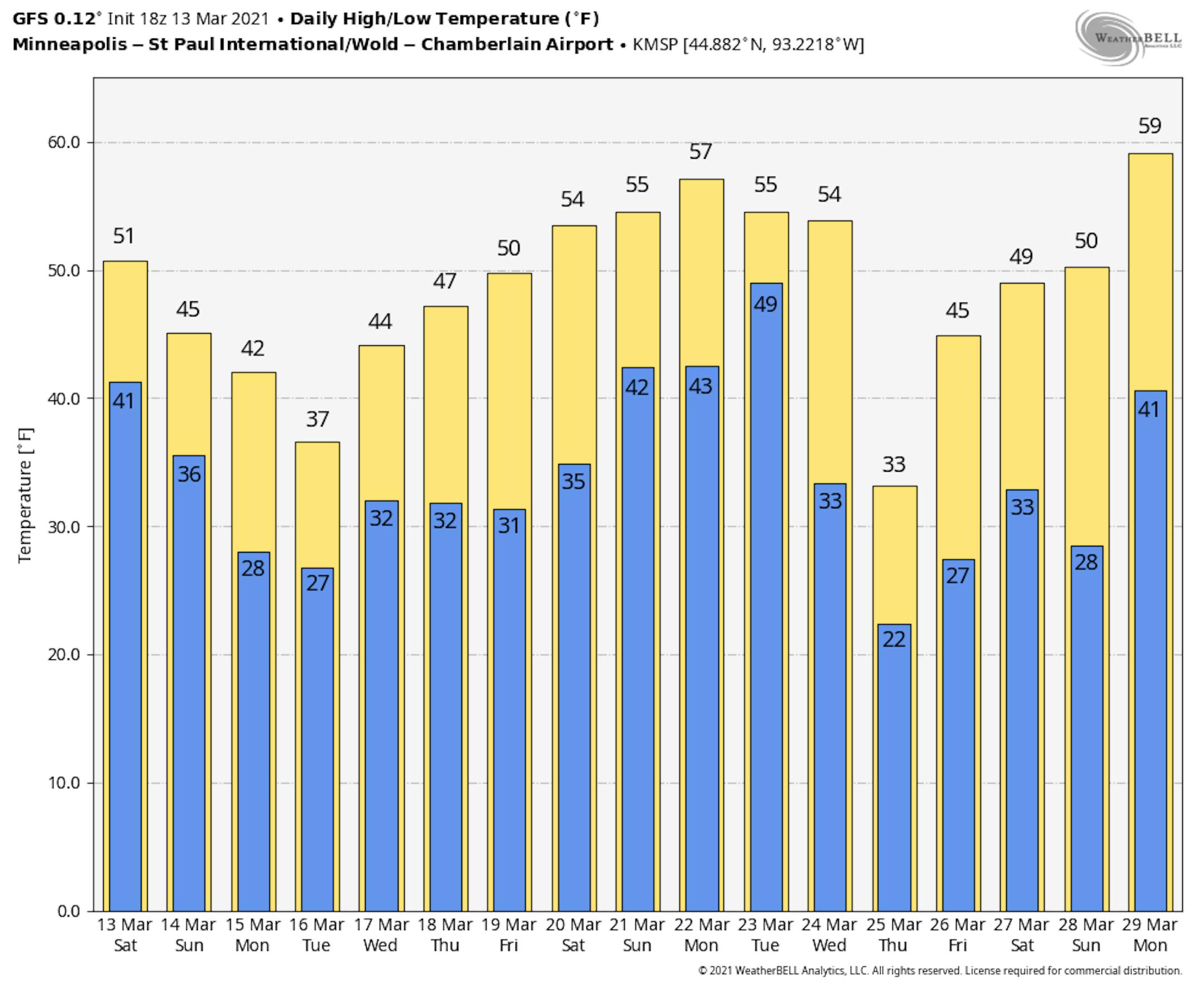 the worst of winter's wrath is generally behind us during the month of March, but it still can be snowy at times. In fact, MSP typically sees around 9" of snow during this month, but more impressively, we gain more than 3 minutes of daylight each day during the month and if you do the math, we gain about an extra 1.5 hour of daylight through the month! The sunset on March 1st is around 6PM, but by the end of the month (and thanks to the time change on March 14th) our sunset on March 31st is at 7:40PM! The official start to spring (Vernal Equinox) is on Saturday, March 20th at 4:37AM this year.