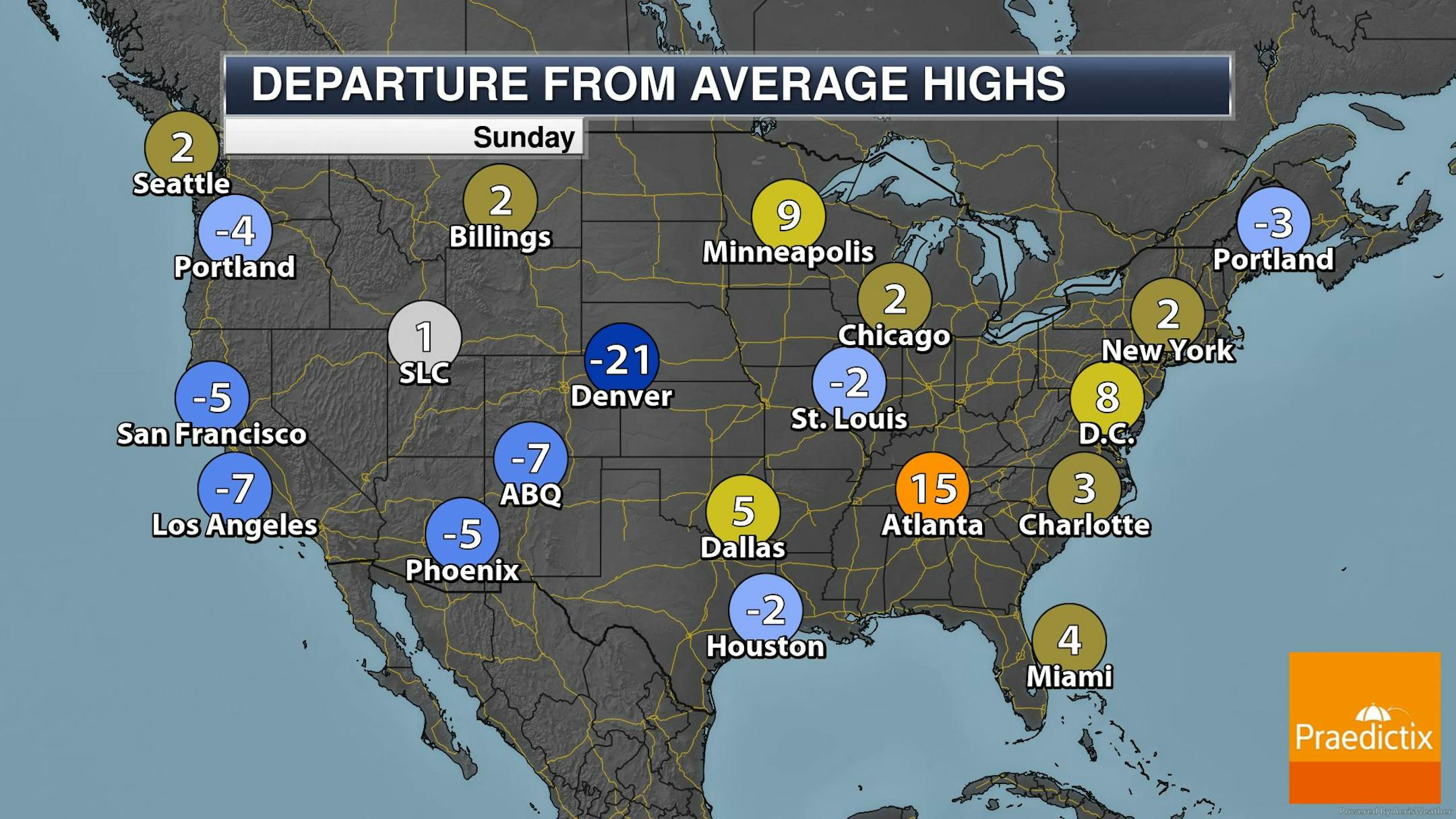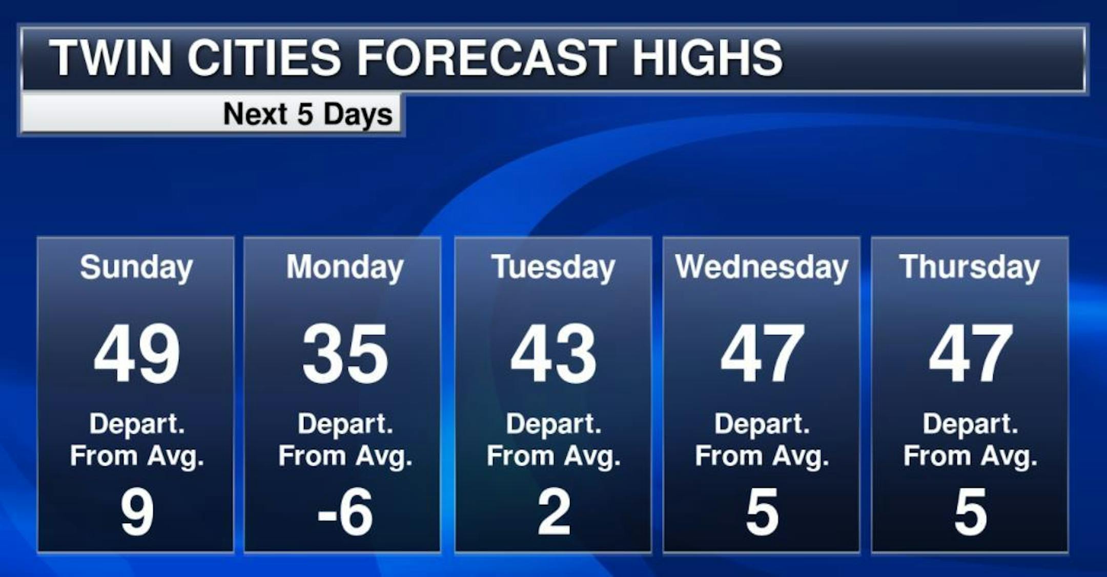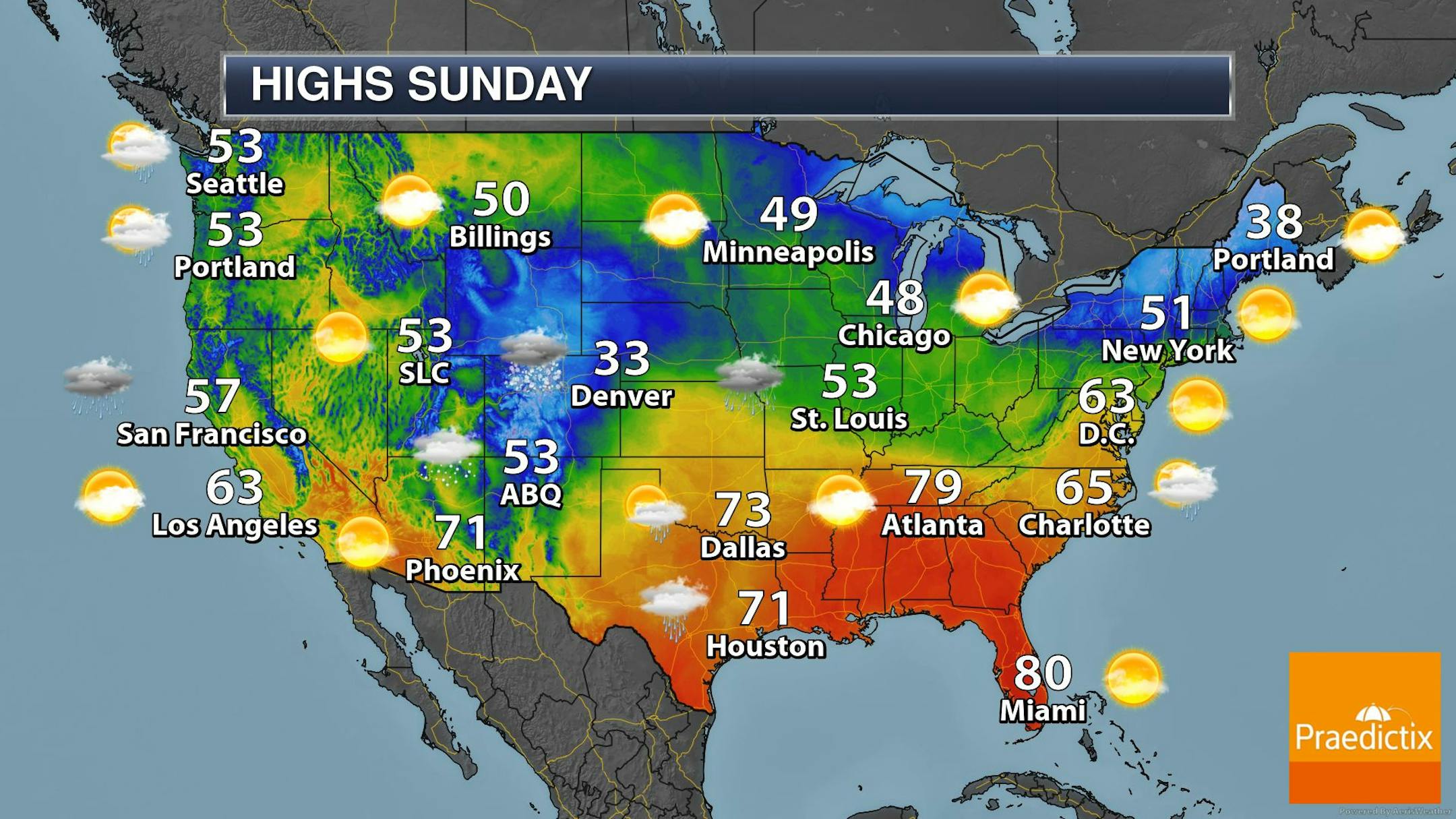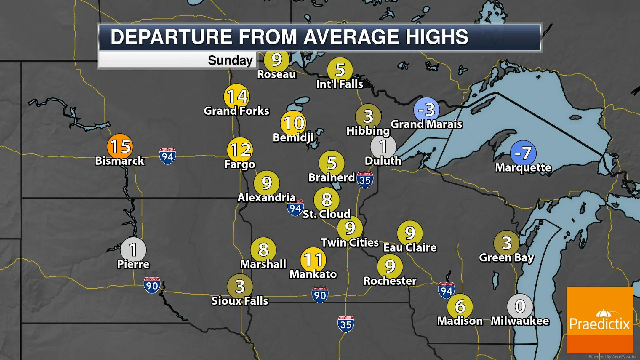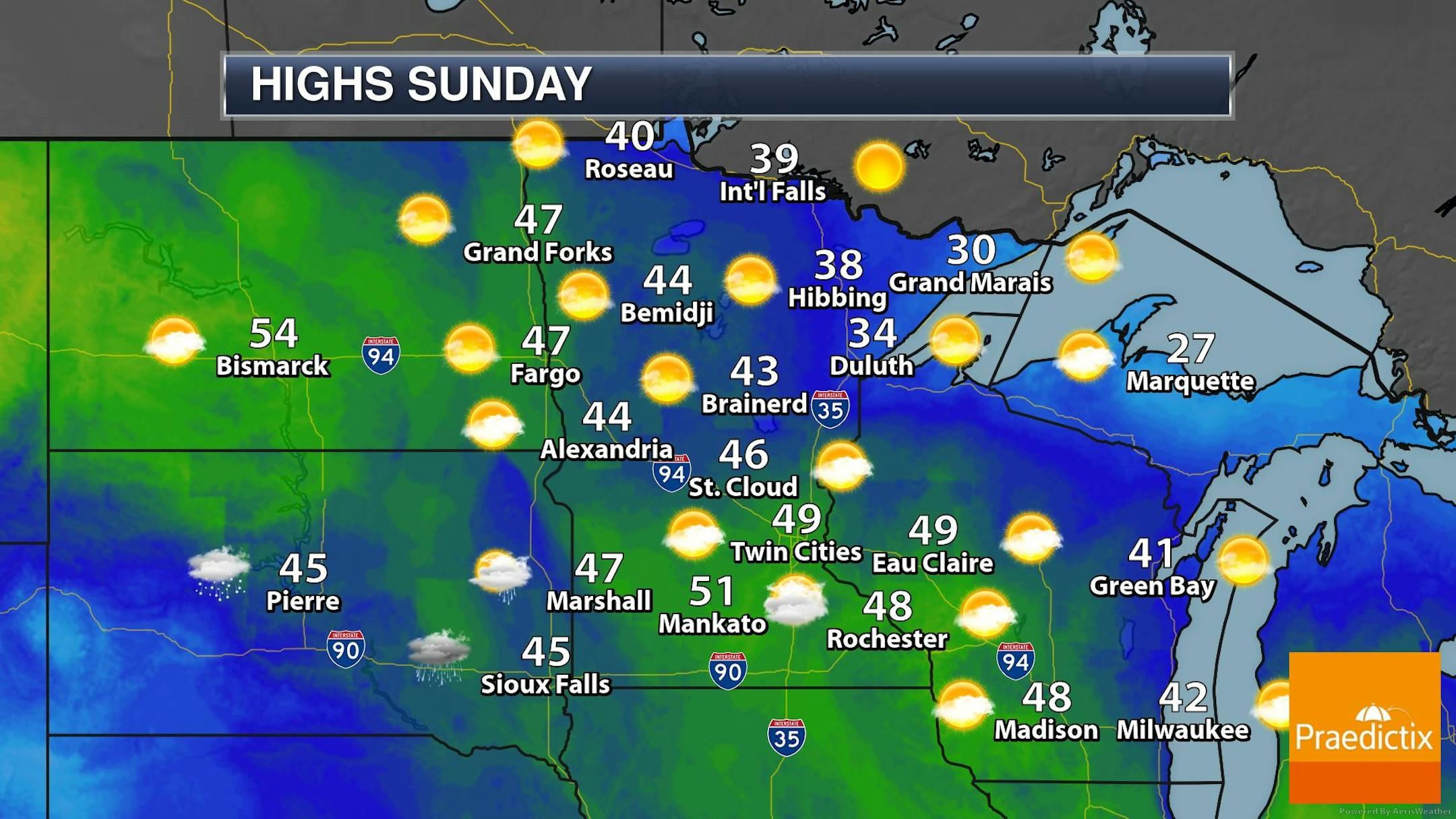 High temps across the region on Sunday will be nearly 5F to 10F above average with high temps warming into the 40s across much of the state.