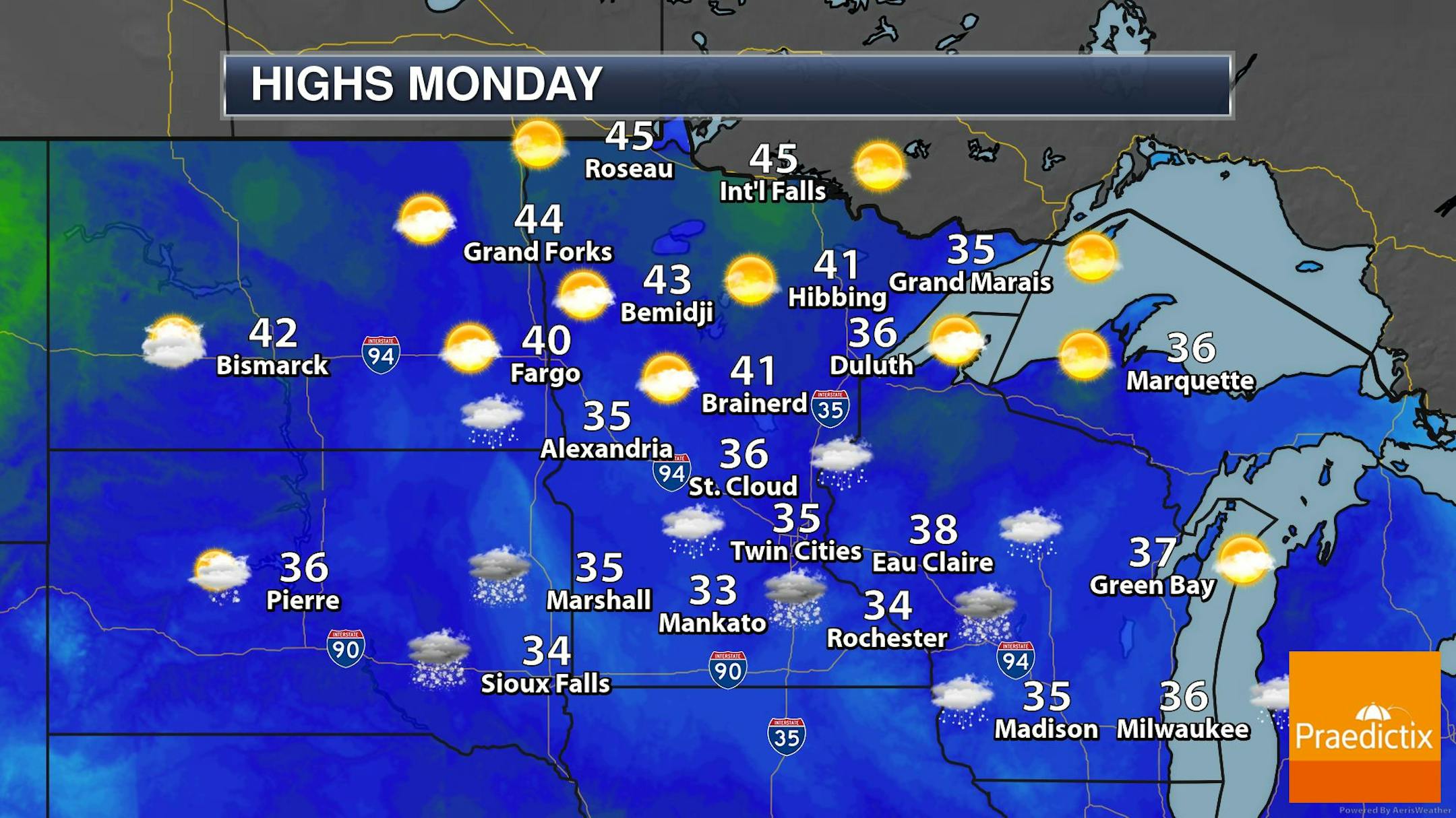 Weather conditions on Monday will be much cooler as a storm system moves into the region. Highs will only warm into the 30s across much of the state.