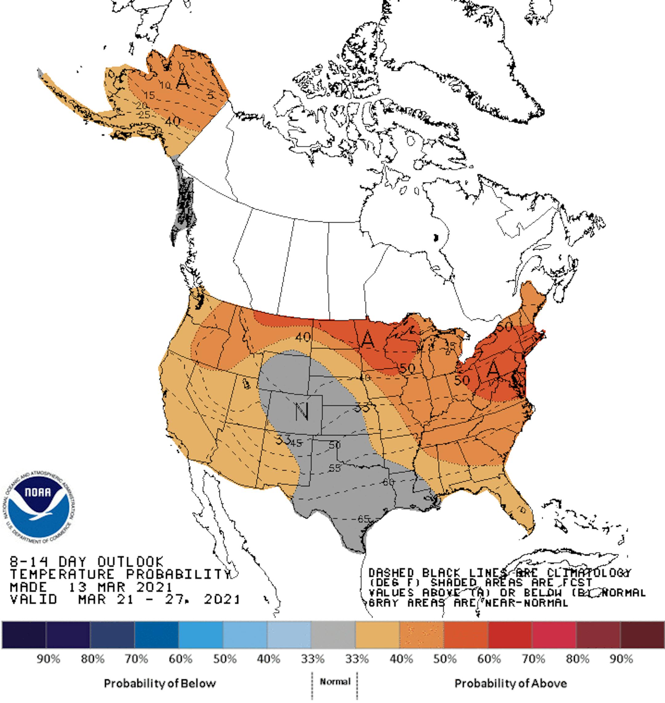 Here's the extended temperature and weather outlook over the next 5 to 7 days. High temps on Sunday will warm to near 50F, which will be nearly 10F above average for mid March. However, on Monday, it'll be cooler than average with highs only warming into the mid 30s.