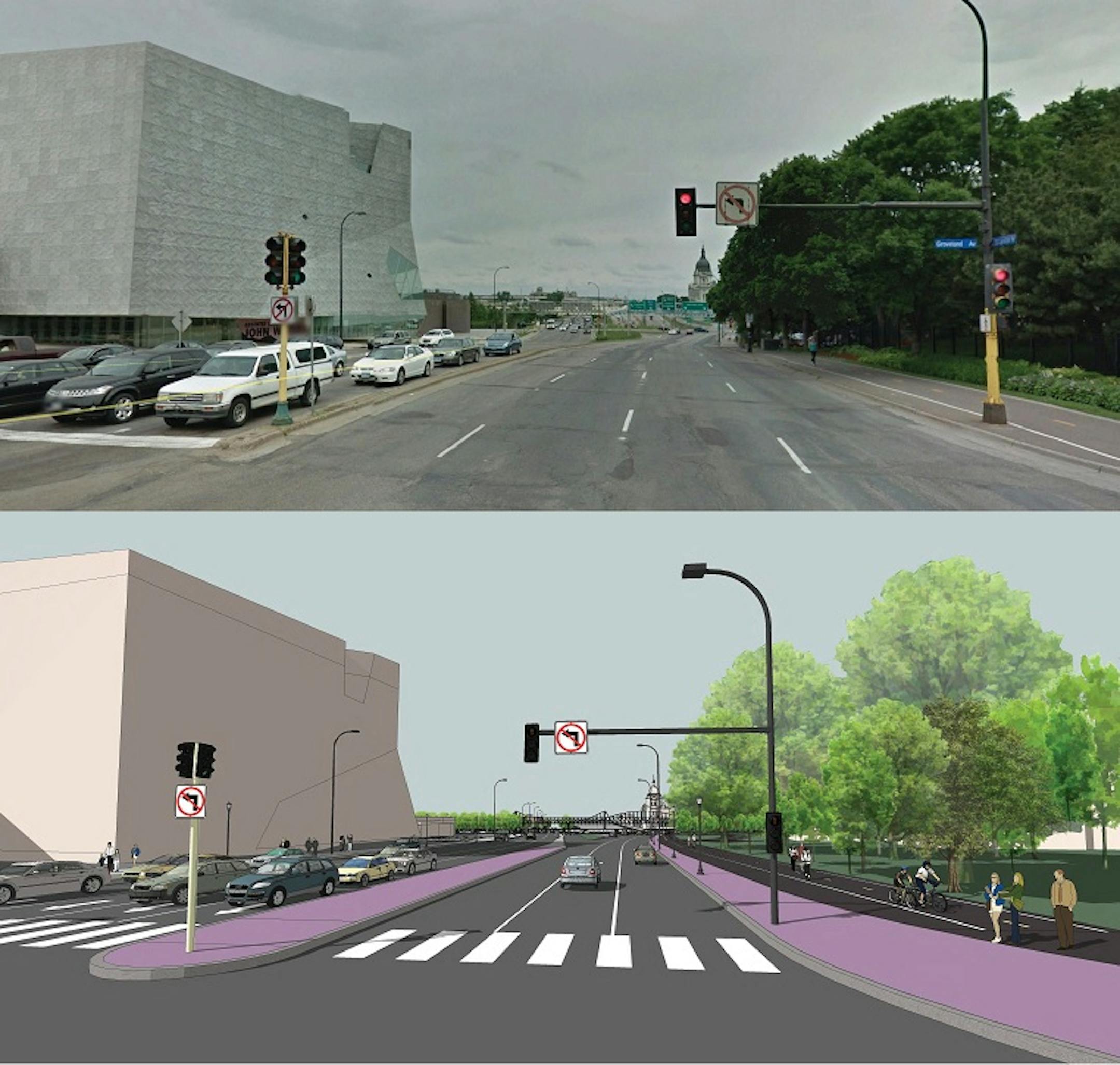 Currently, pedestrians must currently hop numerous crosswalks to get across the street and also share space with bikes that are whizzing down Lowry Hill on a protected path. The new configuration would create more direct crossings and more separated space.