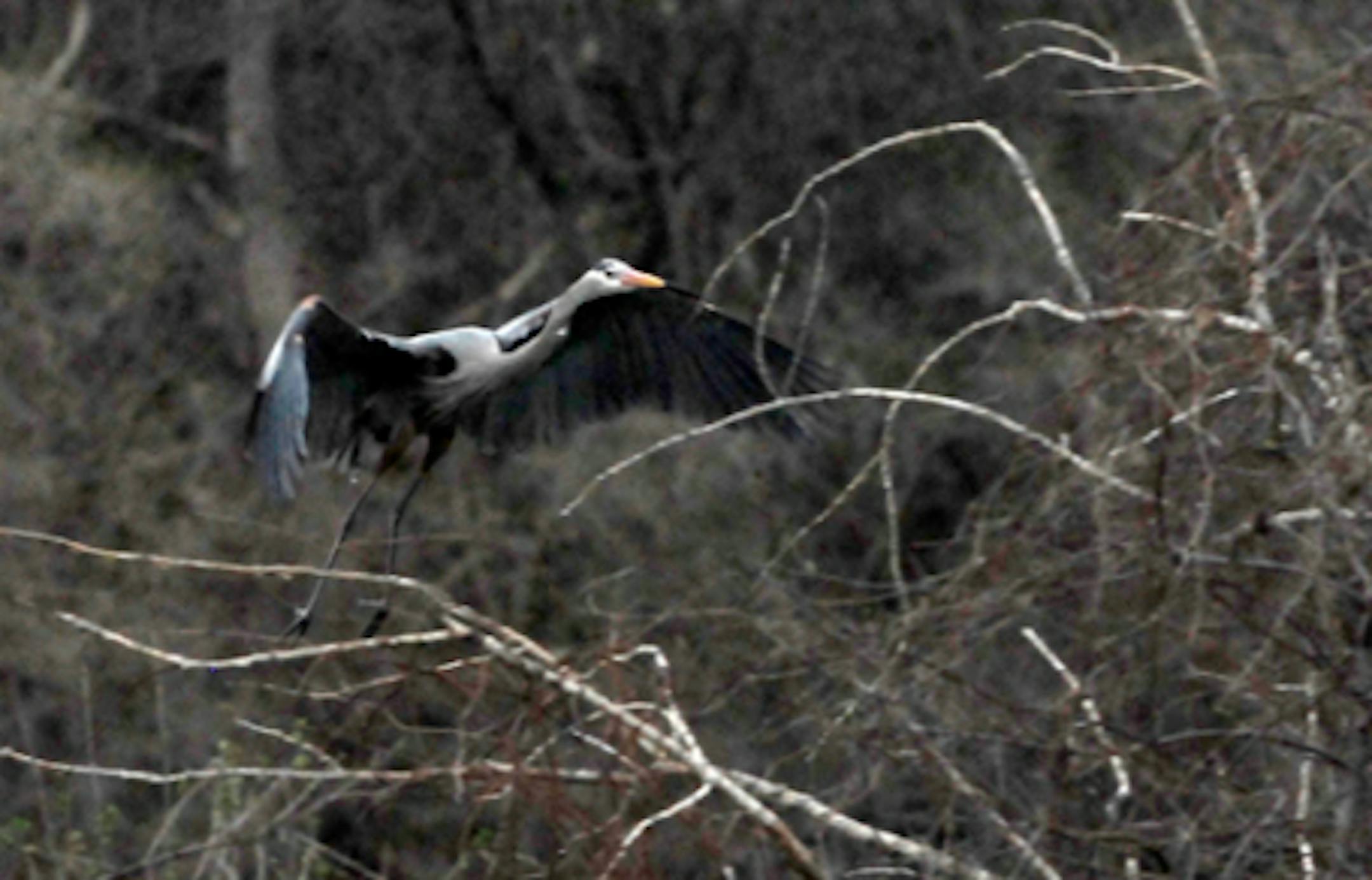 According to a friend who was photographing the birds Tuesday, one of the nest trees in use by the Great Blue Herons at North Mississippi Regional Park fell over, taking about half a dozen nests with it. The literature I have (Birds of North America monograph series) says Great Blue Herons "may build new nests if early attempt fails." Failure is not defined. There are unoccupied nests, however, so, from my non-heron standpoint it wouldn't necessarily be a start-from-scratch effort. Incubation, by the way, takes about 27 days. Number of eggs averages four, can range from three to seven. One egg is laid every two to three days. It can take from two to six days for the full clutch to hatch. Males and females share incubation, females usually on the night shift. Adults average 54 minutes per hour on eggs, turning eggs about once every two hours. Age at first flight for the chicks is about 52 days. Copulation has been underway for several days. If a final egg were laid today, for instance, eggs would hatch around May 12, and the chicks' first flight would be late in the first week of July. The park stretches along the south side of the river in the Camden area. The visitors' center is at the 49th Avenue exit off I-94 West. The rookery is a 3/8-mile walk downstream from the center. Stay on the paved paths nearest the water. The best place for viewing is handicapped-accessible, although the pathways do slope now and then. In the photo, one of the herons rises from the island ground beneath the nests.