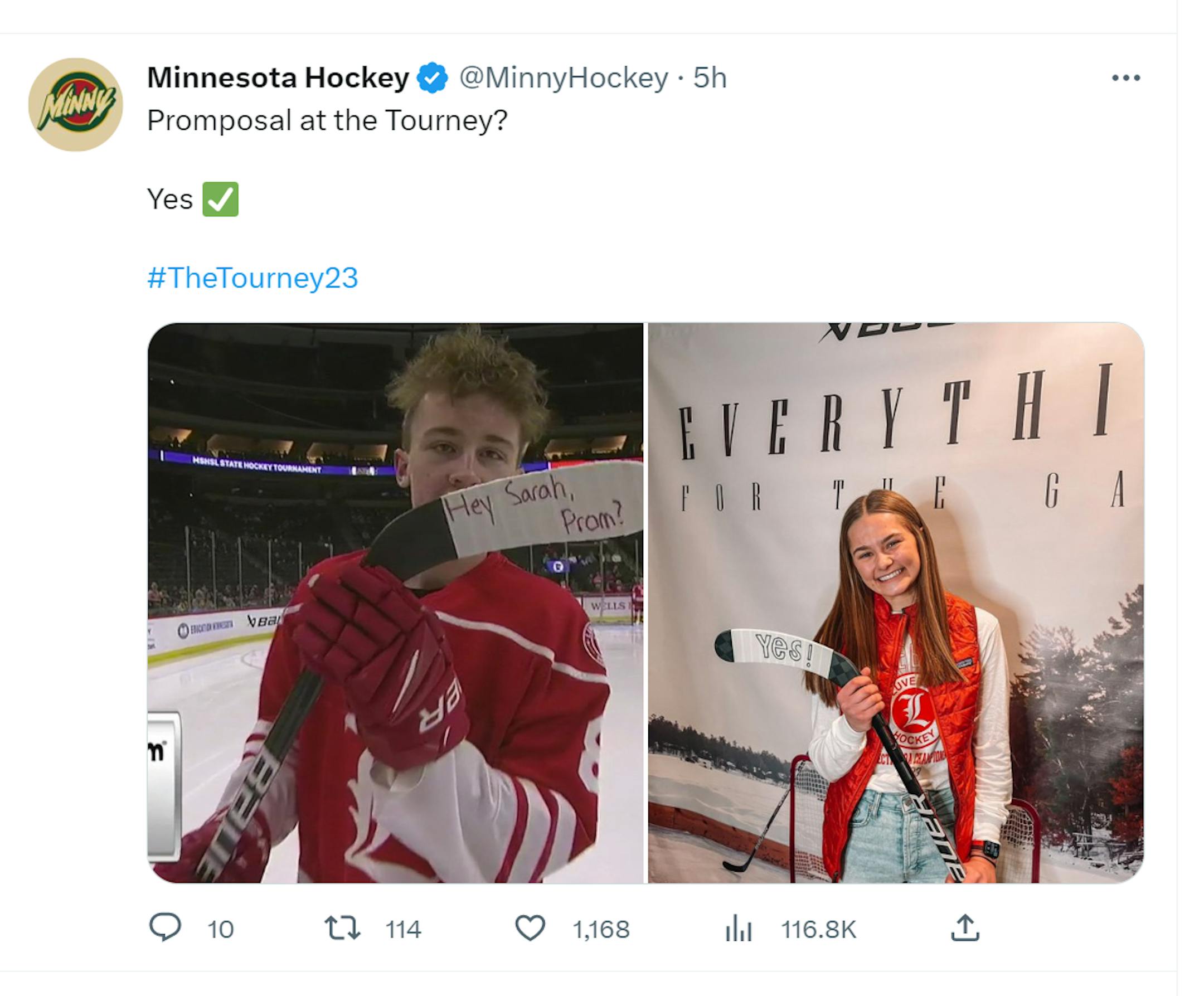 So, did he get an answer? His coach, Phillip Paquette, was curious in the postgame news conference, too. Bork found out afterward that @MinnyHockey had posted a Tweet with side-by-side photos of Bork's promposal and, presumably, Sarah's answer, "Yes!" also written on a hockey stick.