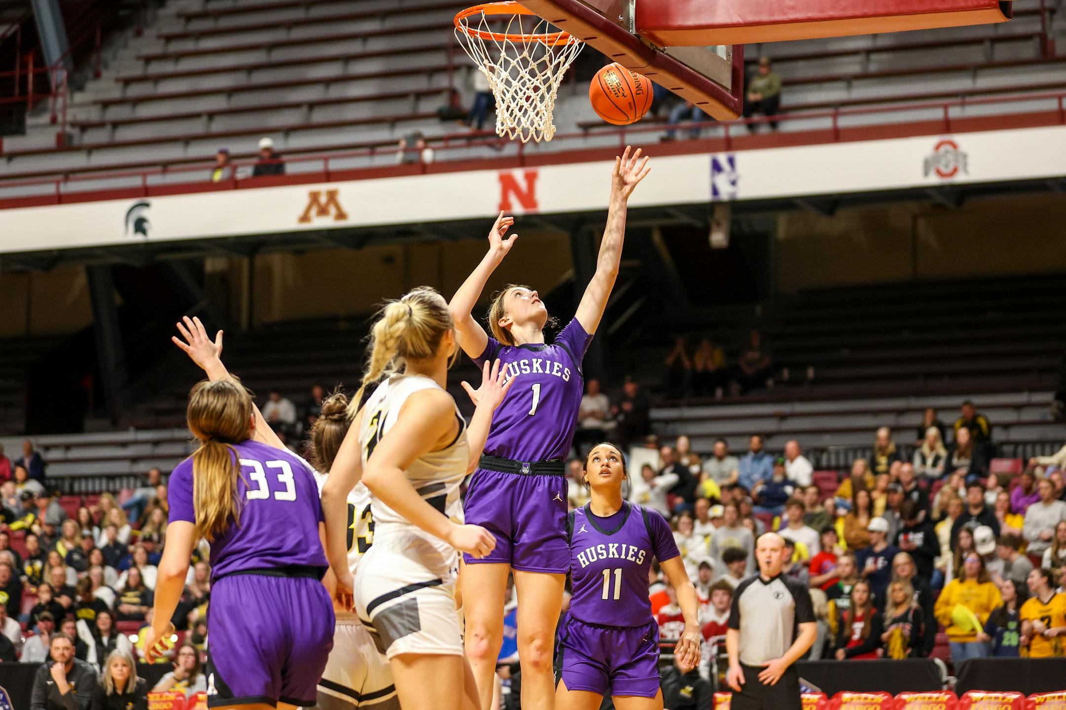 The third-seeded Huskies scored 32 points on layups. Alyssa Sand, a 6-3 junior, led the Huskies with 14 points, seven rebounds and three blocks. Fellow forward Kylan Gerads had 12 points. Gerads got the Huskies started with 10 points in the first eight minutes.