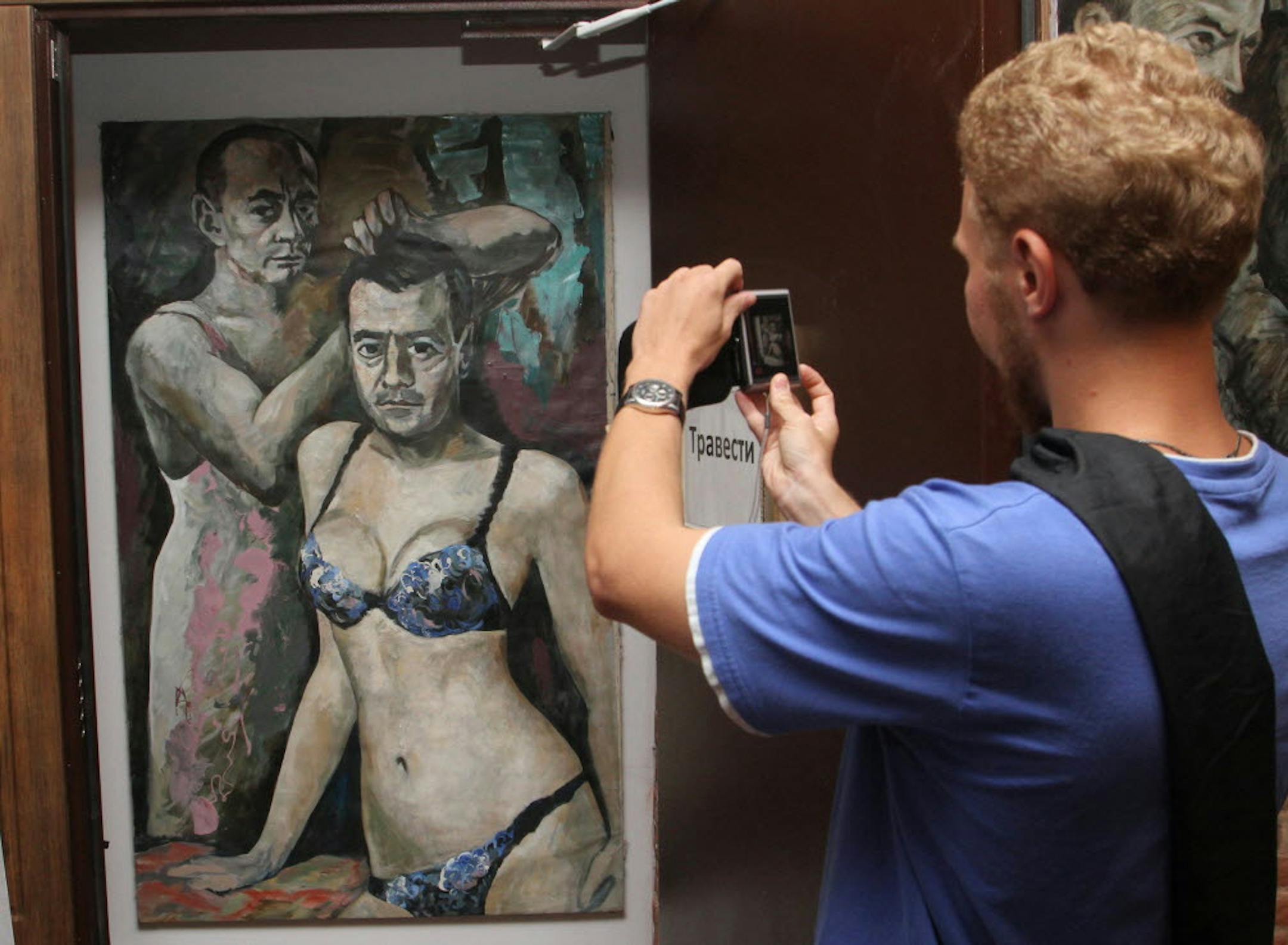 The artist who fled Russia after authorities seized his paintings depicting President Vladimir Putin and Prime Minister Dmitry Medvedev in women's underwear has begun to take steps to claim permanent asylum in France.