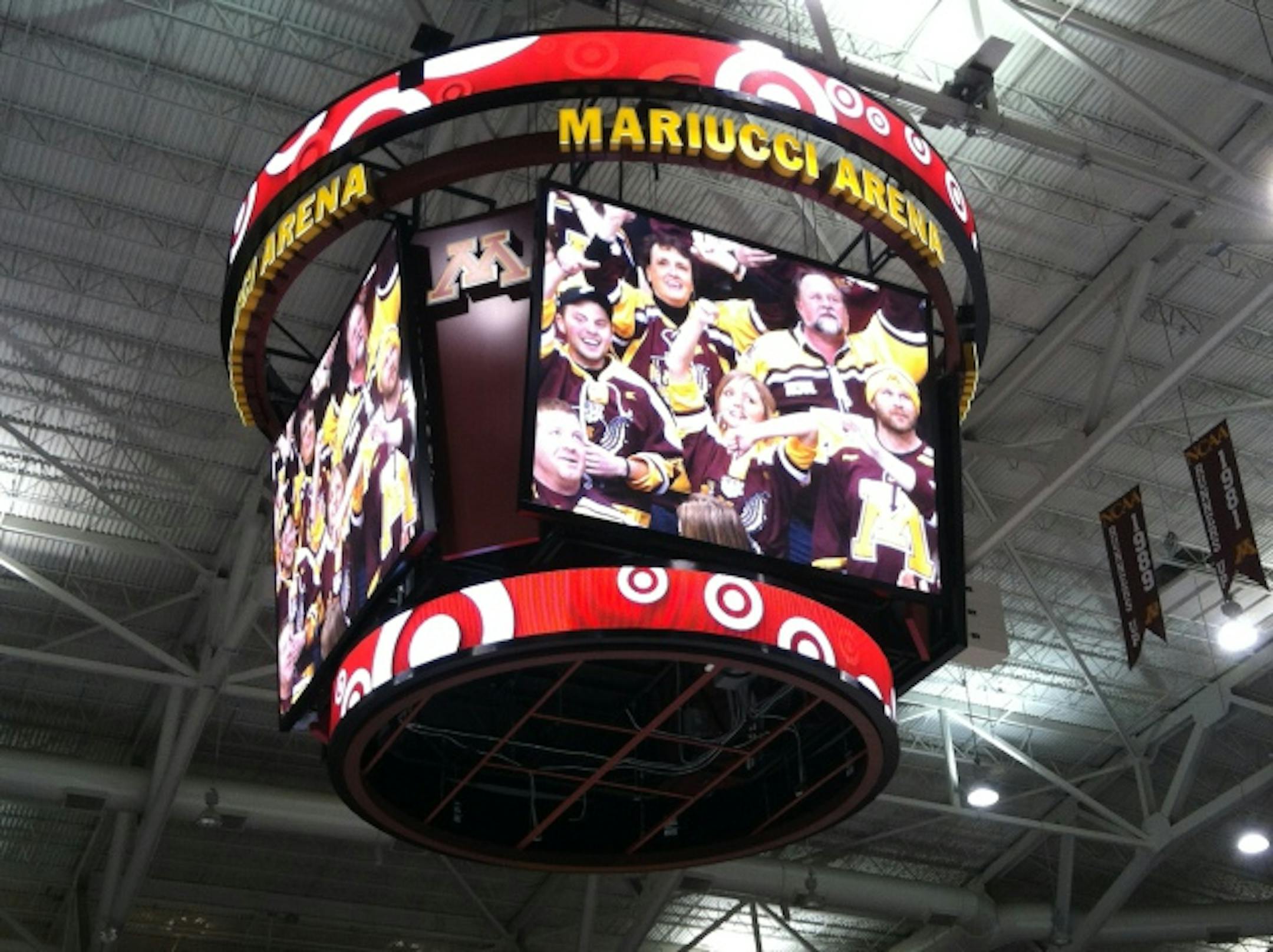 These guys work hard. On one end of the rink, Mike Guentzel worked with the defensemen, while on the other, Lucia and assistant Grant Potulny put the forwards through an incredibly physical, high-tempo battle practice. The nets are put behind the goal line along the wall, each about 15 feet from the corners. The forwards then rotate through a physical 2-on-2 game that promotes battling and in-tight stick-handling and play making vs. the 2 goalies, who Justin Johnson works with. It's as fun a game of shinny and more intense than most I've ever watched. Like I said, I'll be around the Gophers while Roman's got the Lynx and probably will help him at times throughout the NHL lockout, which could be endless. The NHL and NHLPA met for three days this past weekend, but they didn't discuss any of the issues that could possibly end the lockout. The sides plan to meet again Tuesday to discuss the definition of hockey-related revenue. Again though, while that's a critical point, that won't end the lockout. What will is deciding the share of revenue and whether players need to take immediate paycuts. So by mid-week at the latest (my guess), the NHL will announce the delay to the start of the regular season. I'm not sure how the wording will go, but I don't think it will say the start of the season is "canceled." I'm told the NHL's objective would still be to have a revamped 82-game schedule for each team if a collective bargaining agreement can somehow be finalized by mid-to-late October. That could be accomplished by condensing the schedule with an extra game a week and pushing the end of the regular season into late April. As for the highly-touted Gophers, they were tied with defending NCAA champ Boston College for first in last week's USA Today poll and were ranked second behind Boston College in today's USCHO.com poll. Below is their new scoreboard, by the way, and today the video board that goes around the circumference of Mariucci was installed.