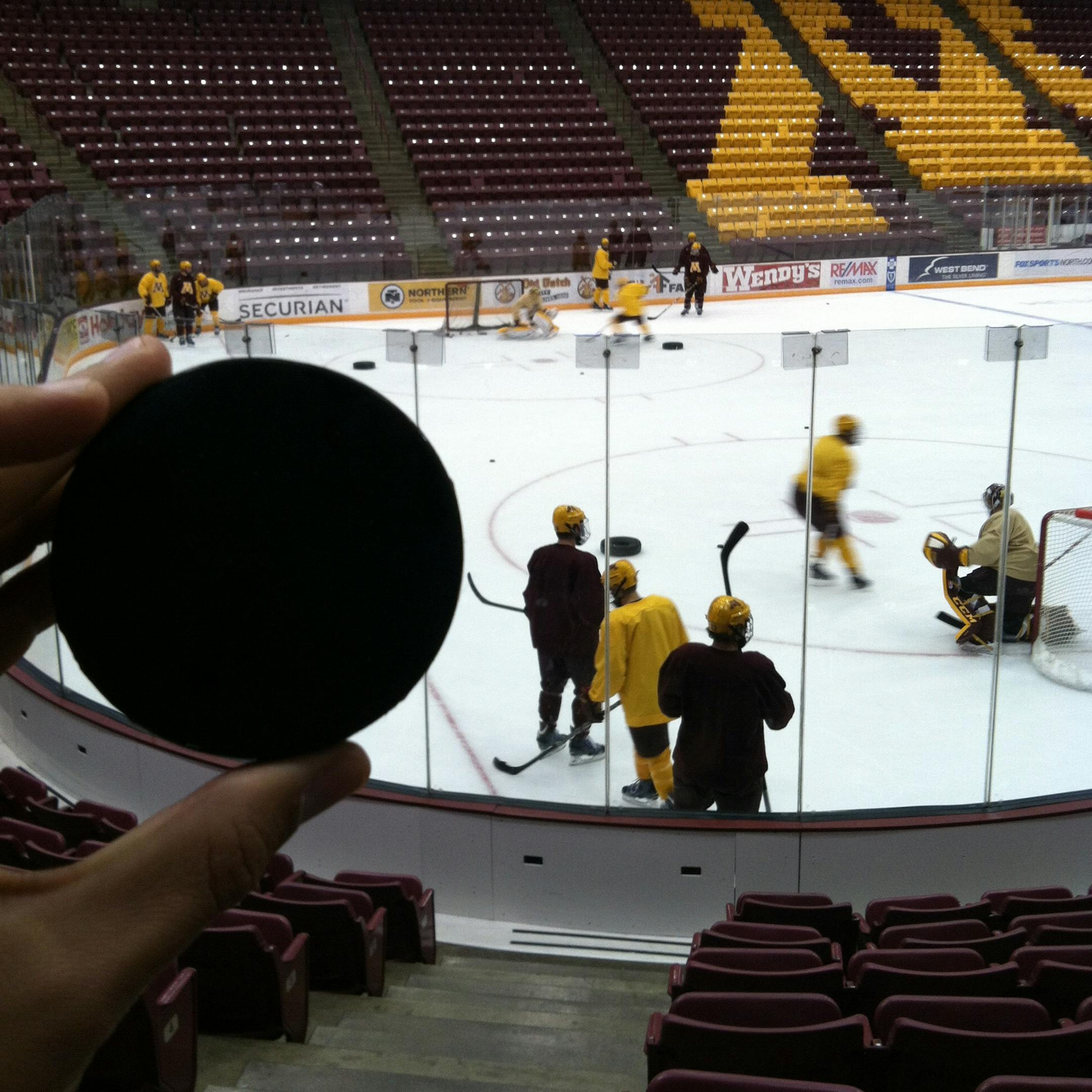 I was just getting the lay of the land because Gophers hockey beat writer Roman Augustovitz is occupied as the Lynx scribe. It was the first college practice I've ever seen, and Gophers coach Don Lucia put the team through a brisk, up-tempo session before a captain's practice. Here's the puck that nearly hit me!