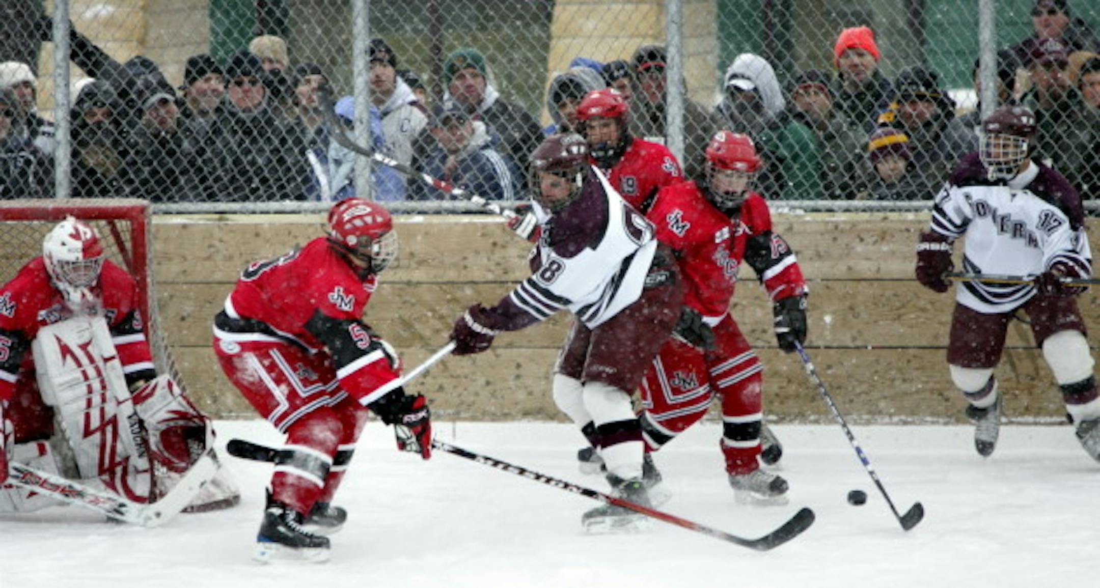 Passing on a bus trip with Blaine to Hockey Day Minnesota back in 2008 remains a big regret in my 15 years covering high school sports at the Star Tribune. Then again, the game time temperature was 7-below zero with a wind chill around 27-below on Baudette Bay, located in Way Up North Minnesota. Not sorry about missing that. Blaine lost to Roseau 1-0 as part of the second Hockey Day Minnesota festivities. A creation of Fox Sports North and the Minnesota Wild to showcase the sport, Hockey Day Minnesota drops the puck for the 14th time with a three-day event outdoors at Parade Stadium on the western edge of downtown Minneapolis. Two high school girls' games took place Thursday night, followed by a local NHL alumni game Friday, two boys' high school games Saturday and the Gopher women in the afternoon. I'll be there to capture color in and around the 9:30 a.m., game Saturday featuring the Warroad boys against host Minneapolis. My three previous HDM experiences were St. Paul (2009), Moorhead (2011) and Grand Rapids (2013). Whether in the Twin Cities or greater Minnesota, HDM brings energy to the hockey-loving host communities. The event is a Hockey Homecoming. A happening. A nod to simpler, if colder, times spent on outdoor rinks. In 2009, St. Paul Johnson players walked the half-mile from their high school to Phalen Park, where long ago the Governors played all their varsity games. Johnson topped Rochester John Marshall 4-0. The sun was unwelcome on HDM in 2011 in Moorhead. The rink went from a happening to a hazard. Unable to fix the deteriorating ice behind one of the goals, officials moved the goal several feet closer to the blue line. That shrank a playing surface already 15 feet short of regulation. Hill-Murray beat host Moorhead 3-2. Then in 2013, the wind and cold I missed by passing on the invitation from Blaine found me on Lake Pokegama in Grand Rapids. One Benilde-St. Margaret's player remarked that the starched American flag looked like it was fastened to a gymnasium wall. Grand Rapids beat the Red Knights 3-2 in overtime. Days later, I noticed the materials on the fingers of my gloves warped. Evidently I held them too close to the outdoor fire pit too often. Eagan played Hibbing/Chisholm in the earlier game, after which former Grand Rapids standout John DeCenzo tackled Eagan coach Mike Taylor into the snow and yelled to his old friend, "That's how we say hello on the Range!" Here's to another round of great memories Saturday.