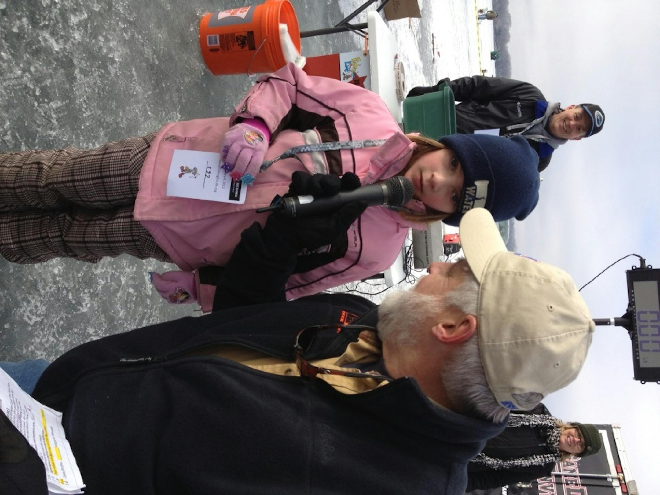 Samantha Berent, age 6, Mound, is interviewed by event emcee Mike "Cold Front" Kurre.