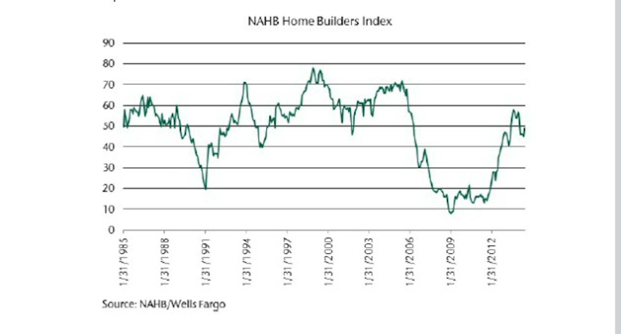 Builders rate traffic of prospective buyers as "high to very high," "average" or "low to very low." Scores for various components are used to calculate a seasonally adjusted index where any number over 50 indicates that more builders view conditions as good than poor.