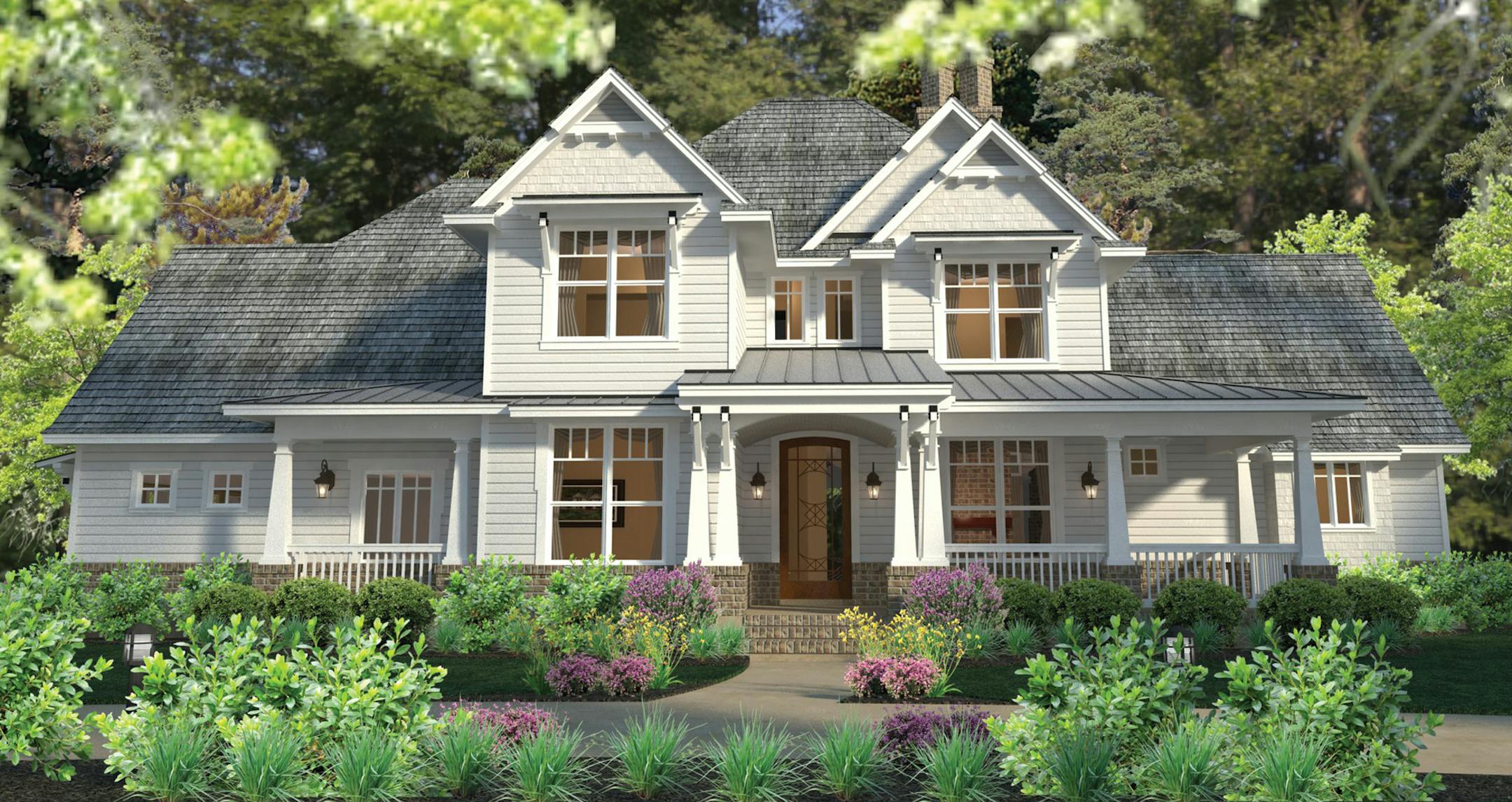 A traditional wraparound porch accentuates this welcoming farmhouse exterior. Inside, classic style meets modern functionality. The open family room has a see-through fireplace, shared with the dining room, that visually expands the space. Double doors lead outside onto the expansive covered patio, where another fireplace creates cozy evenings. The kitchen offers plenty of room for cooking, snacking and just hanging out. A main-floor master suite boasts a large walk-in closet, a bathroom, window seat and direct access to the back porch. Upstairs, two additional bedrooms share a full bath with two sinks. Two large bonus areas can be used for future expansion.