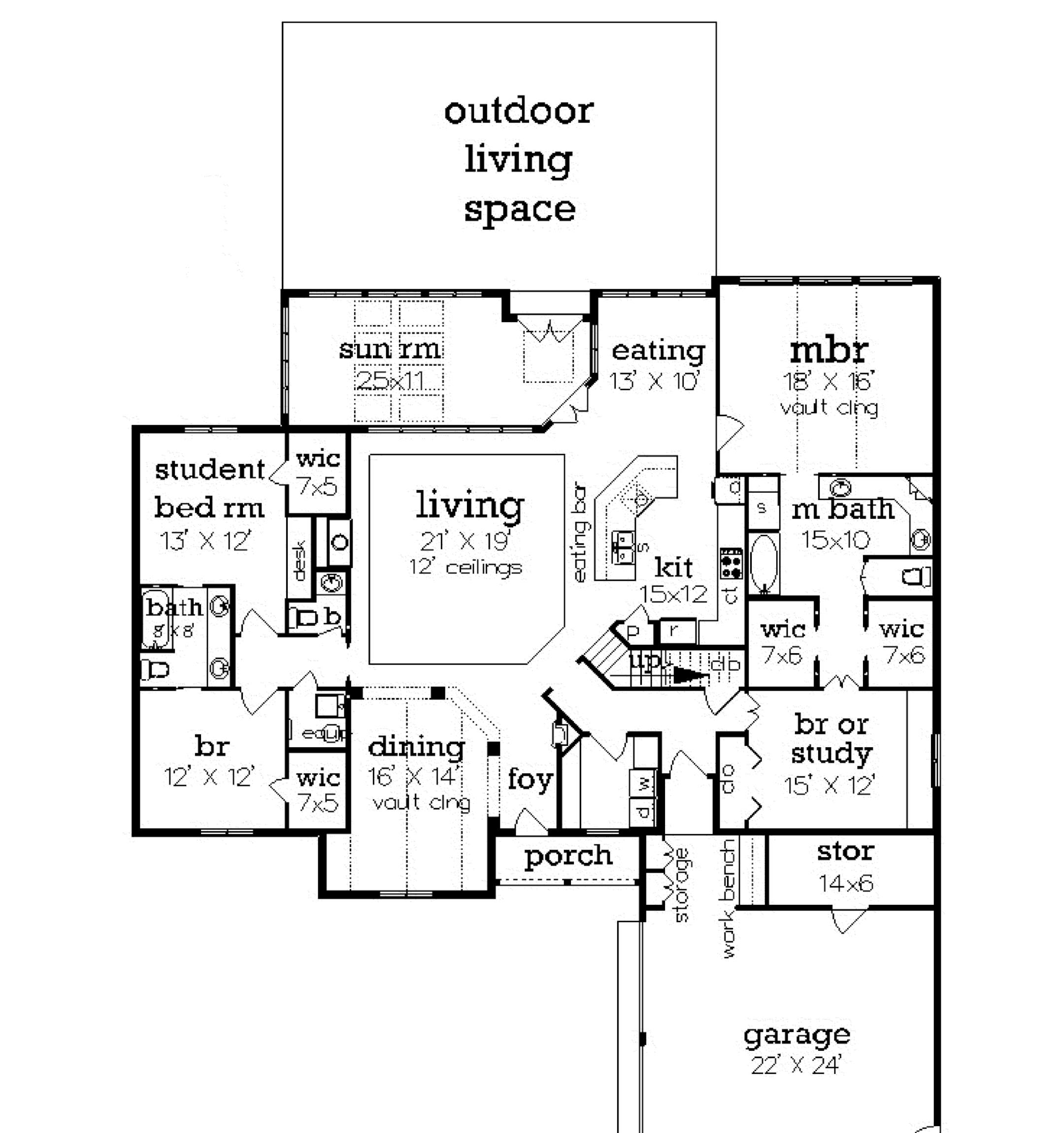 This cottage-style plan is designed with many options, including a bonus space above the garage that can be converted for a variety of functions with the potential of an additional private bath. Walls of windows draw natural light into the sunroom, breakfast nook and master bedroom. The master suite also features a vaulted ceiling, a bath with twin walk-in closets and access to the adjoining study. The living room features 12-foot ceilings, a fireplace and windows that look into the skylit sunroom. The dining room also has a cathedral ceiling and a niche for a china hutch. The two secondary bedrooms offer walk-in closets and shared bath. There's extra storage space in the garage, including room for a golf cart and work bench.