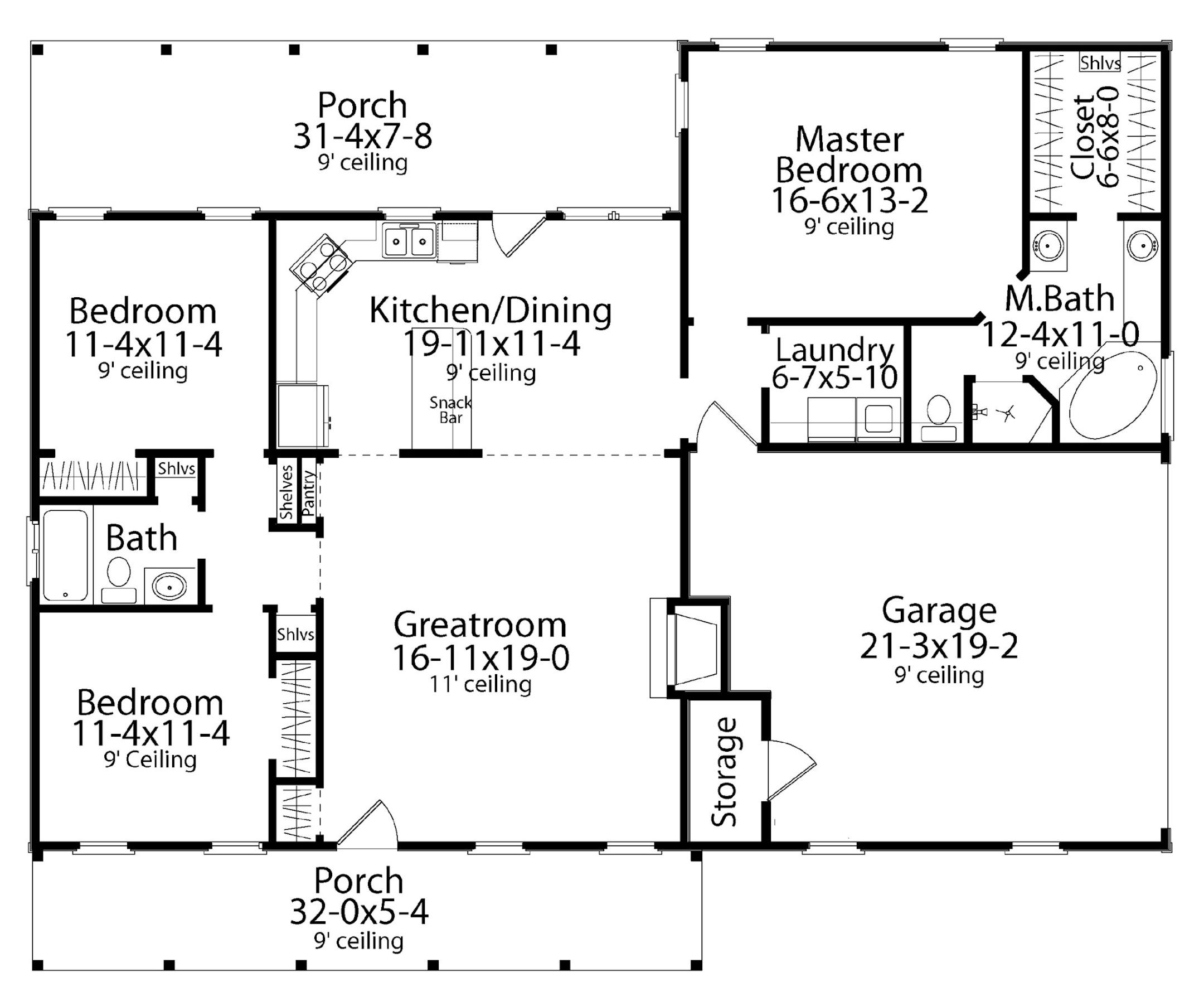 This modest, graceful design has a surprising amount of living space. A front porch opens immediately to the great room, which features a fireplace and 11-foot ceilings for added volume. The kitchen offers several places to dine: a casual snack bar, dining nook, or — in season — out back on the wide porch. In addition to a corner tub and large shower, the master suite has a walk-in closet and easy access to the laundry room. Two more bedrooms share a full hall bath on the other side of the house. There's also extra storage space in the garage.