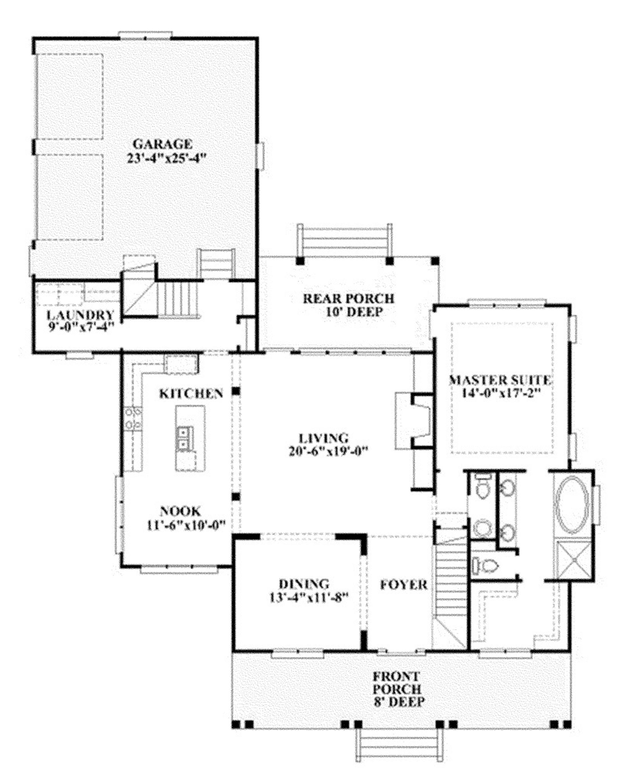 This home beautifully combines traditional and updated elements with its classic Cape Cod exterior and modern open layout. The island kitchen flows into the large living room on one side and the bright breakfast nook on the other. The dining room partly opens to the living room and foyer. The main-floor master suite is appointed with a walk-in closet with a window, a double-sink vanity in the bathroom and access to the rear porch. Two more bedrooms share a large bathroom upstairs, with the option for a 177-square-foot playroom. For more space, a 385-square-foot bonus room can be finished above the garage.