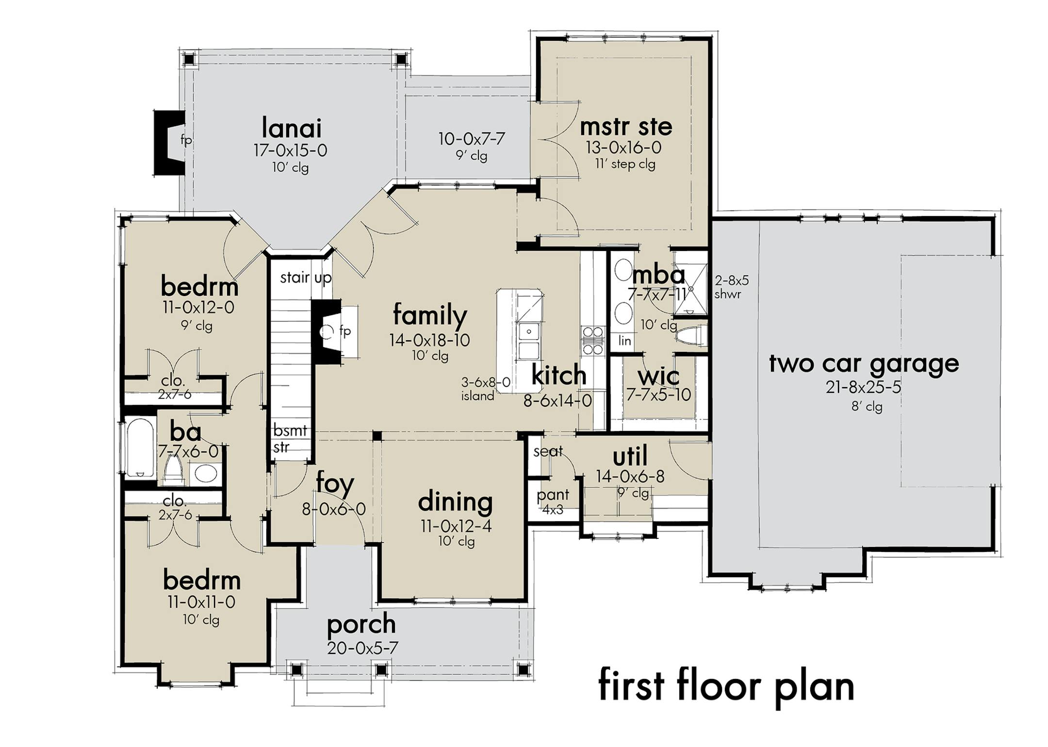 An open layout between the main living areas and features like a fireplace in the family room make this stylish design live large at under 1,500 square feet. The open gathering areas feature French doors to the back lanai, complete with a fireplace. The master suite and one of the secondary bedrooms also open to the lanai. Other features include a well-organized utility area on the way in from the garage and versatile bonus spaces upstairs.
