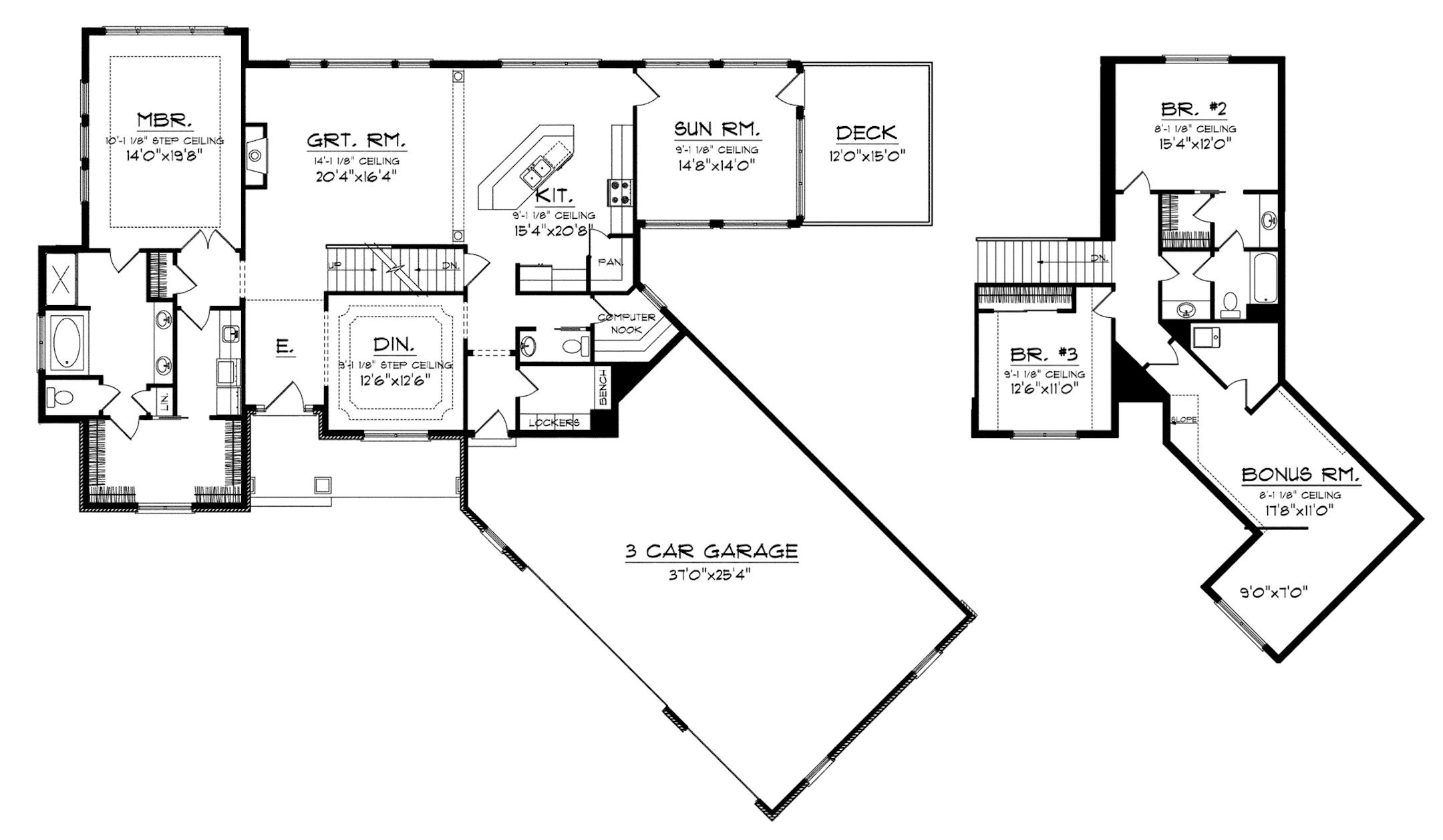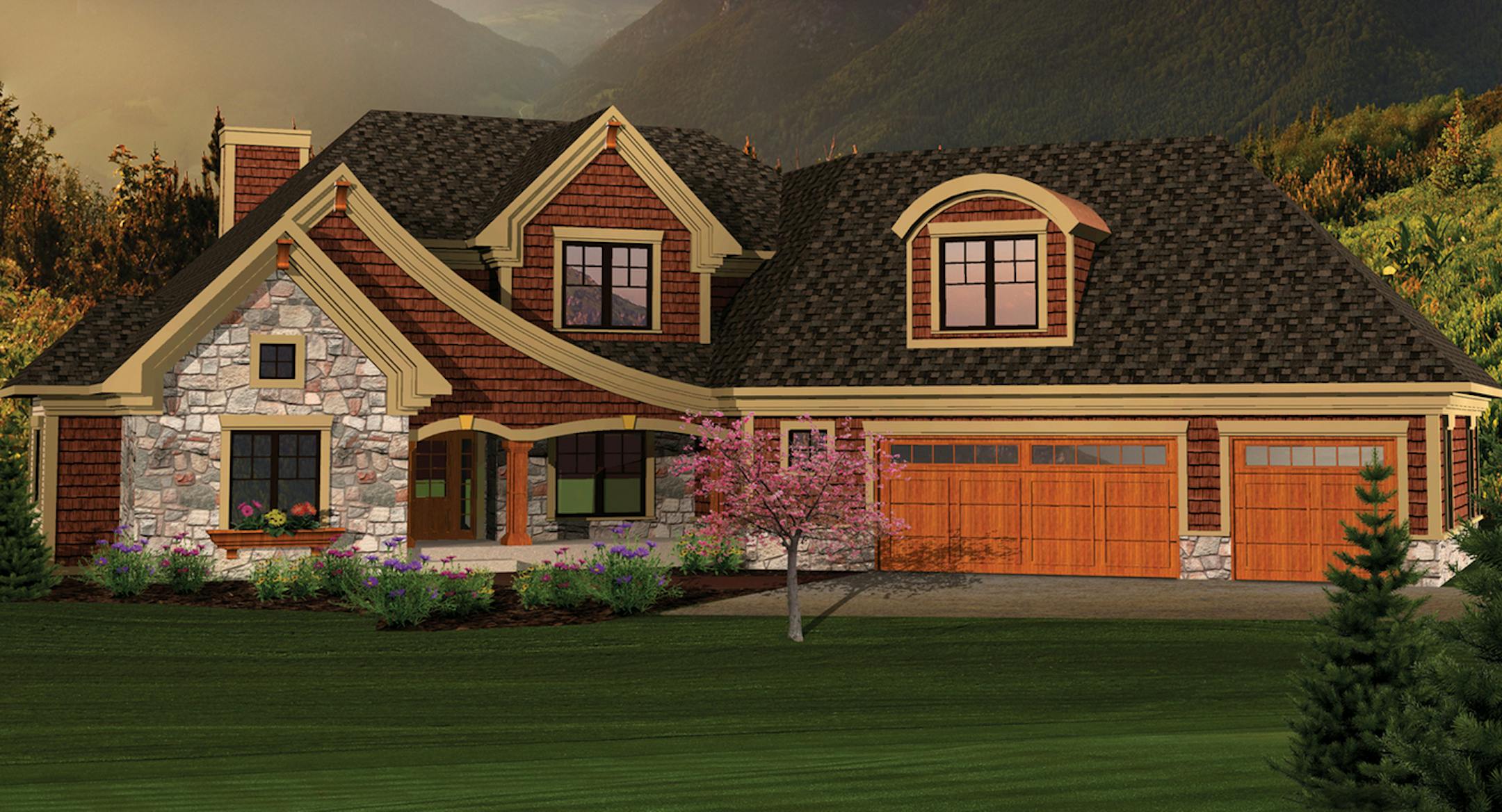 This design features a gracefully curving roofline, a copper barrel dormer roof, angled garage and wooden pillars. The formal dining room is accented with a unique step ceiling. The great room's wall of windows draws in abundant natural light. The adjacent kitchen is defined by columns and features an angled island with extra seating for guests. The sunroom offers access to an adjoining deck. The main-floor master suite is appointed with a step ceiling, big walk-in closet and roomy bathroom with a garden tub. Two additional bedrooms and a large bonus room are on the second floor.