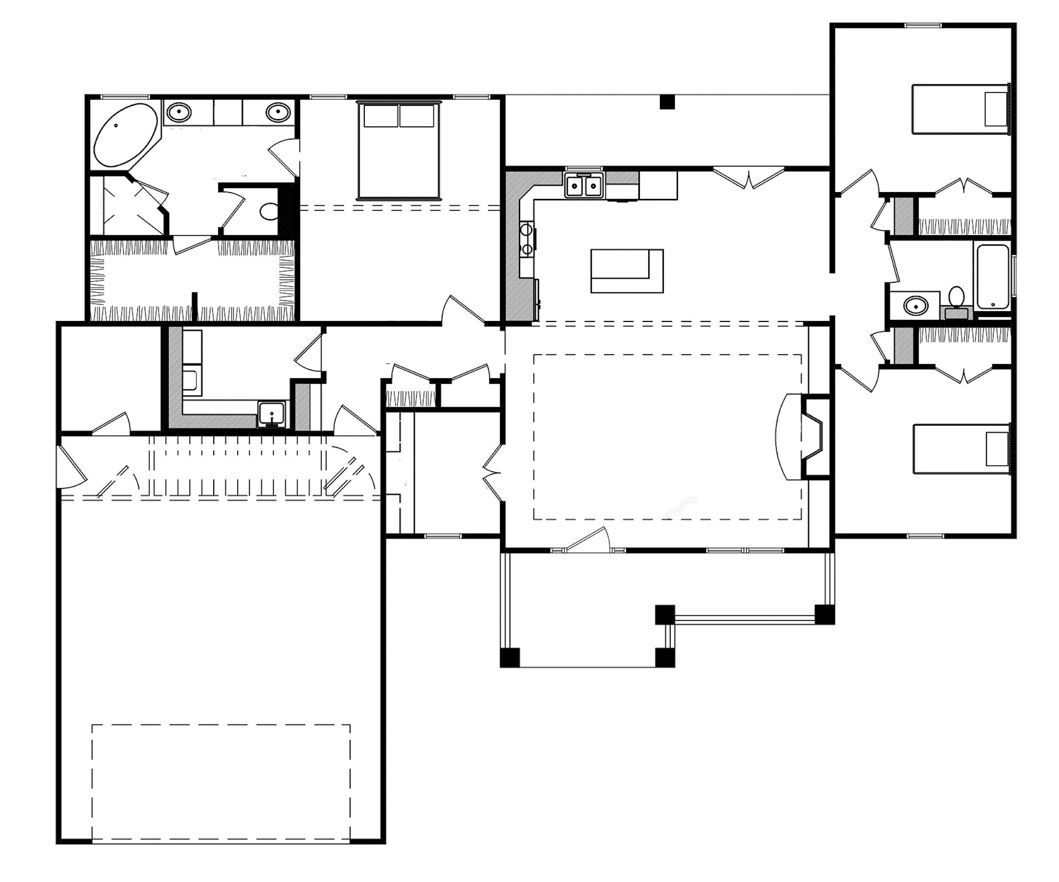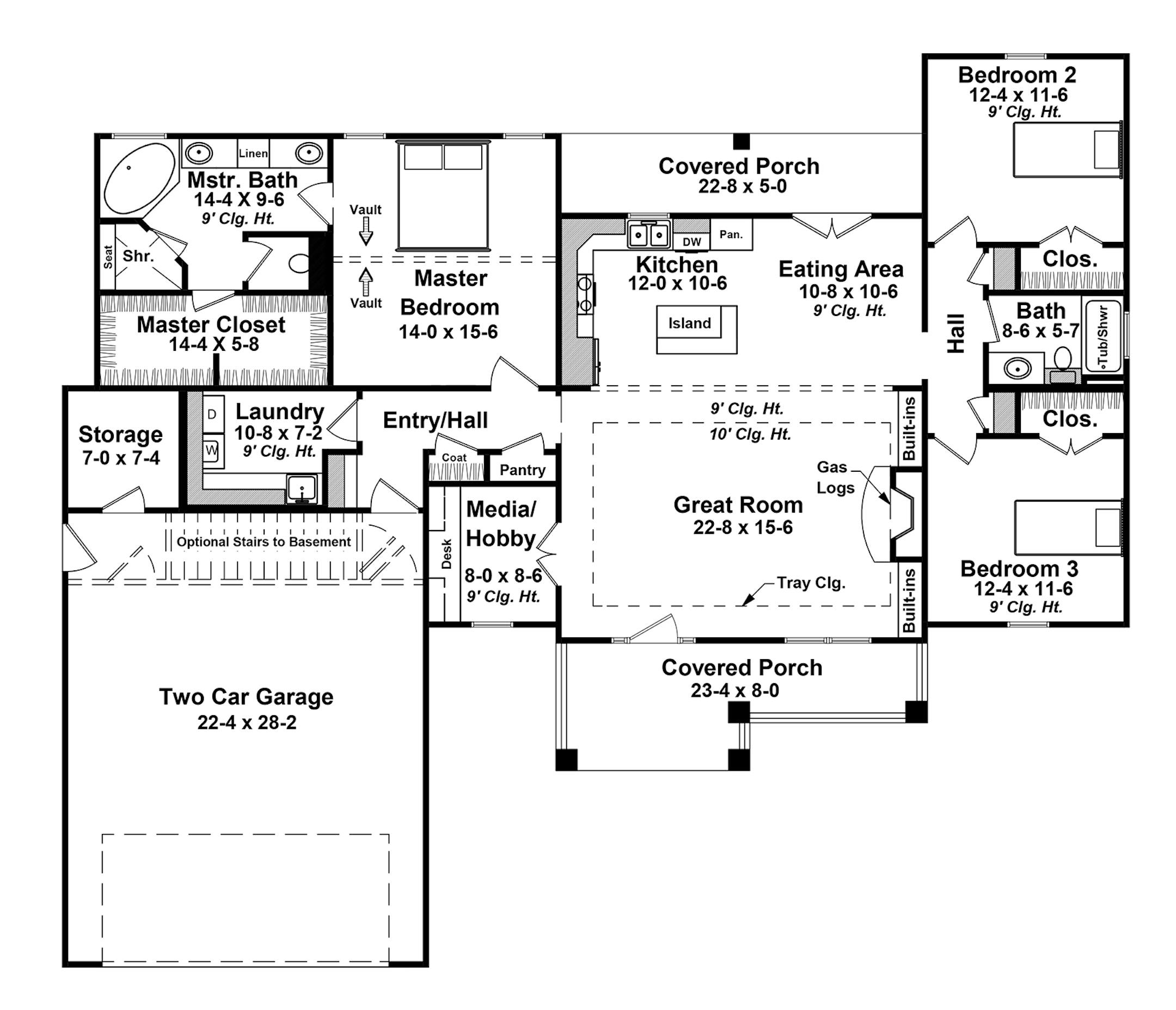 A series of gables draws the eye along the front of this one-level ranch home, while the tapered porch columns add a bit of Craftsman flair. The flexible one-story layout features a hobby/media room that can also serve as a pocket office or homework zone. With an open floor plan, guests can gather at the kitchen island before dinner, enjoy a meal in the open dining room, and then sit around the fireplace in the great room. In the master suite, a spalike bathroom and divided walk-in closet create a relaxing retreat. There's extra storage in the spacious laundry room and in the garage. Covered porches in front and back extend the living spaces to the outdoors.