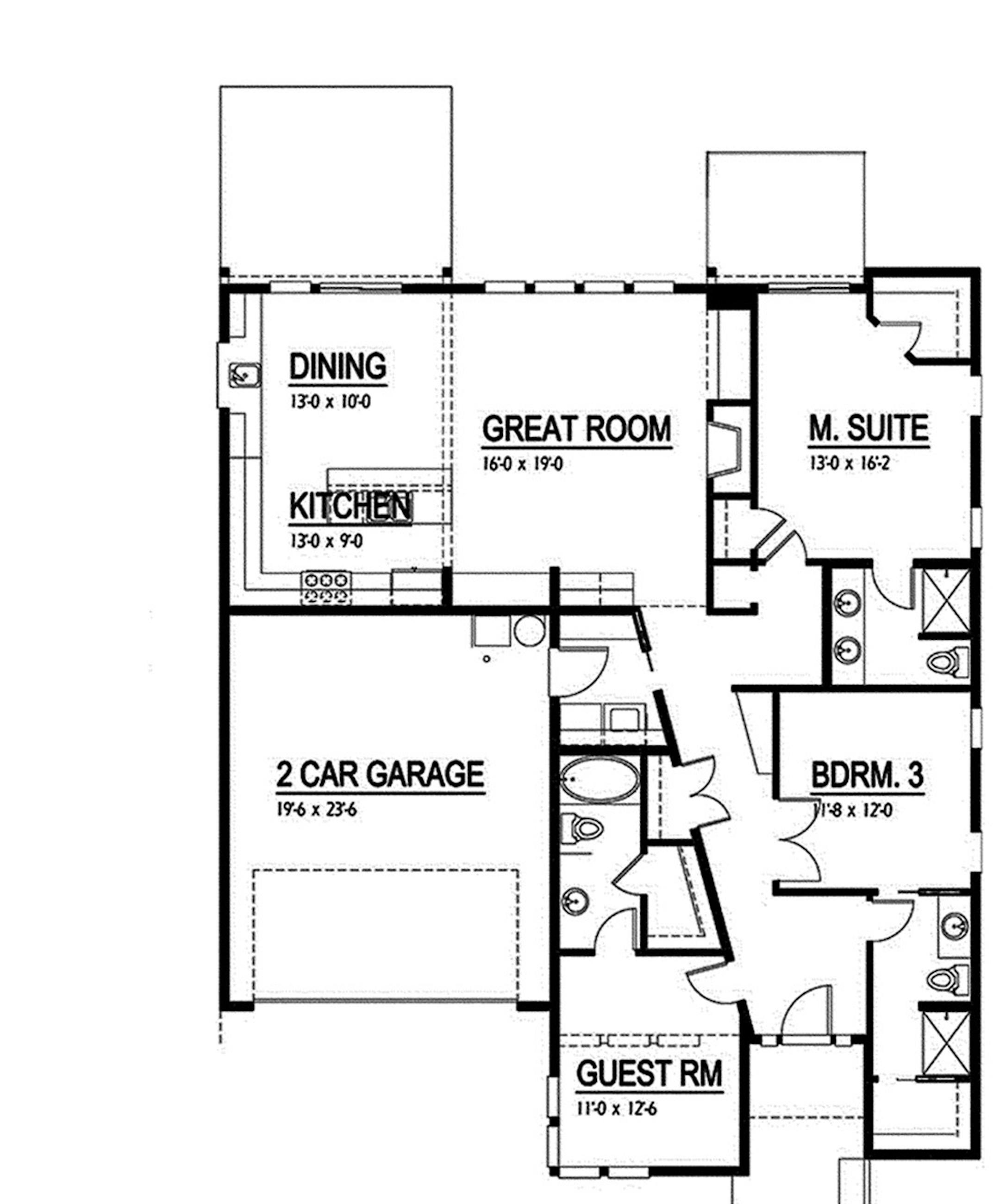 With its playful shed roofline and eye-catching windows, this cool contemporary home makes a bold style statement. The smart one-story layout fits four bedrooms, a study and a media room within a relatively modest footprint. The main living spaces feature a view of the backyard, with a fireplace on the side wall. A large island provides plenty of prep space in the open kitchen. Corner windows bring light into the guest room, which can double as a home office. Each of the three bedrooms has its own bathroom and walk-in closet, and the master suite opens up to the backyard.