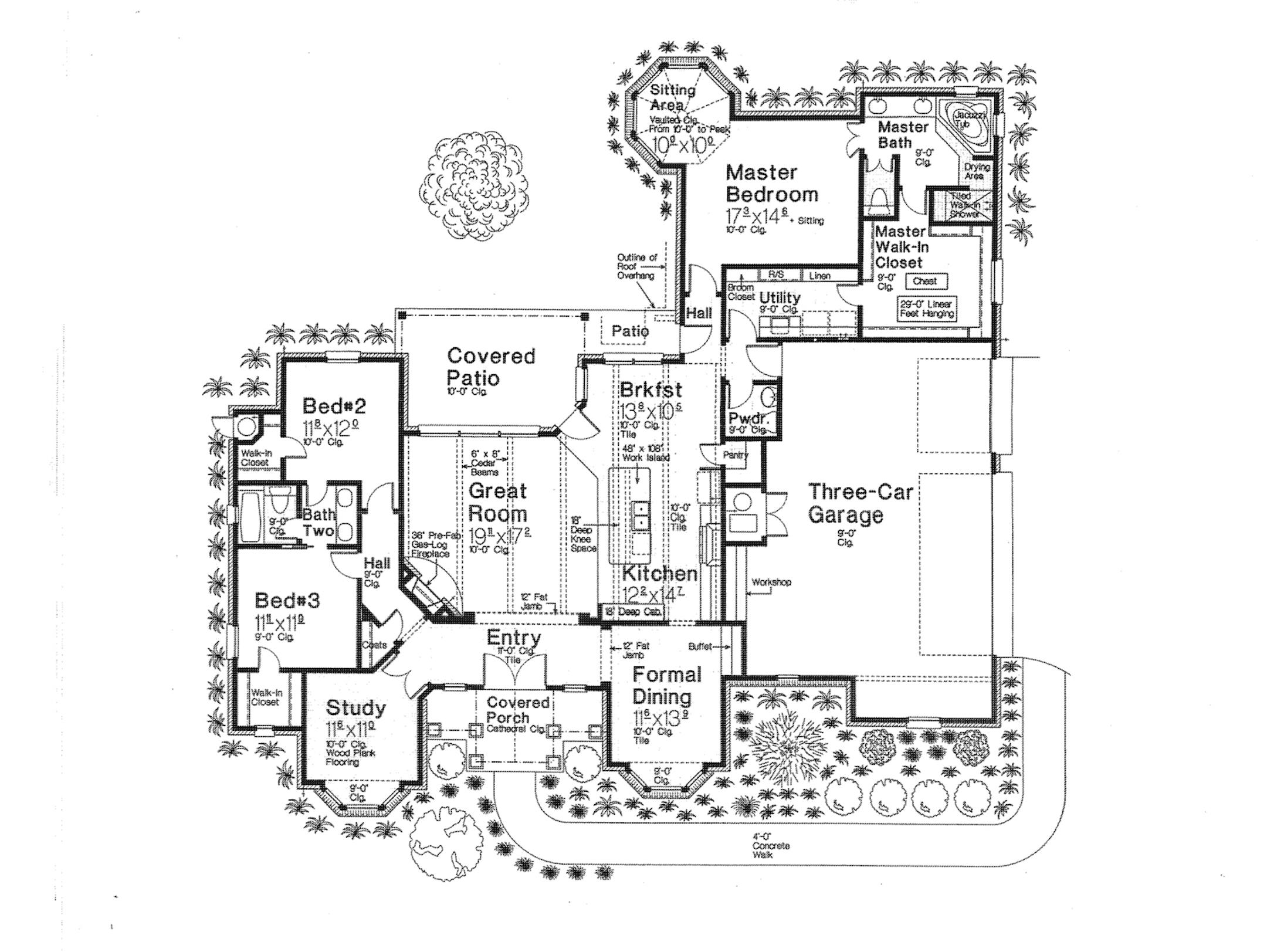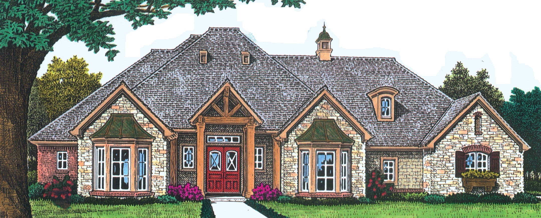 A towering truss and twin bay windows add a rustic touch to this stone-covered home. Inside, the layout has a luxurious-yet-relaxed vibe, with an island kitchen open to the great room, which is accented with exposed beams overhead. The master suite features a bumped-out glass-surrounded sitting area facing the backyard. A large walk-in closet opens to the handy laundry room. Two more bedrooms with walk-in closets, a study and a dining room complete the plan.
