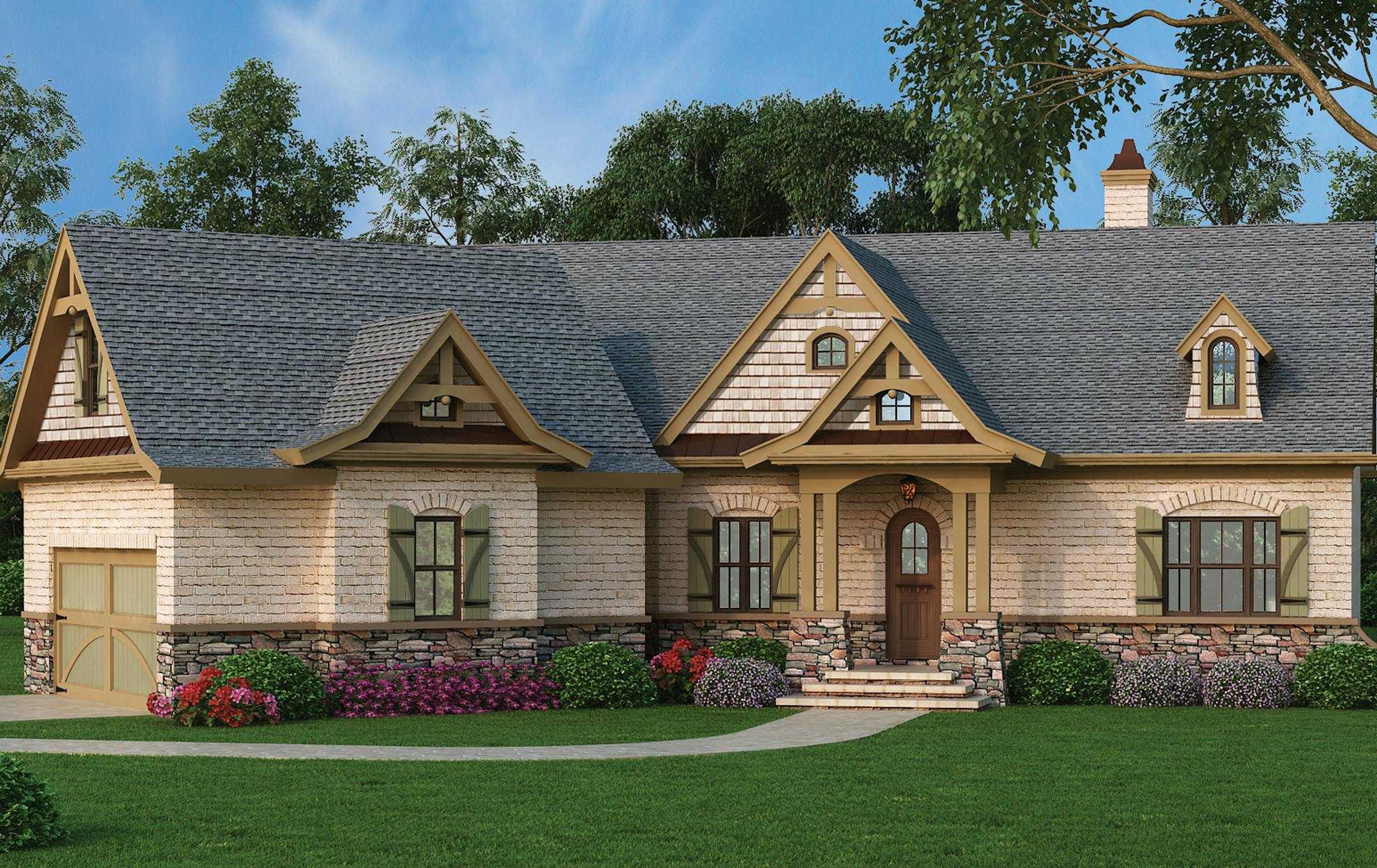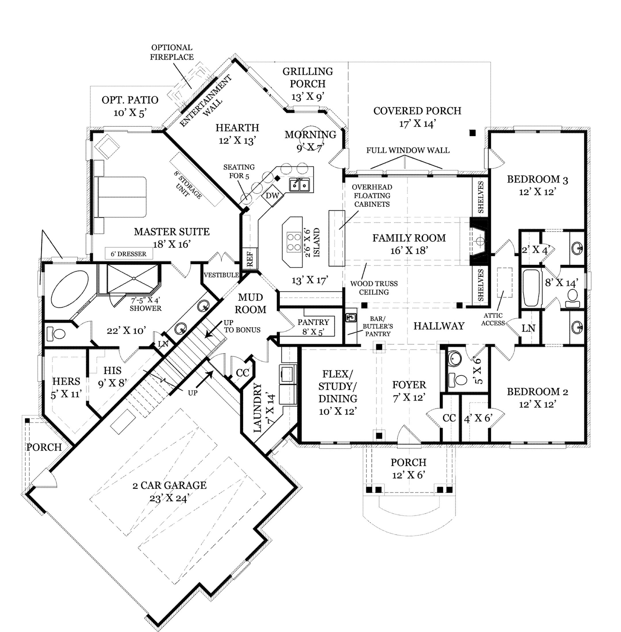 This one-story ranch home features 2,404 square feet full of amenities. Decorative trusses and rugged materials add a Craftsman style. Practical spaces include a mud room and walk-in pantry located at the garage entrance. The spacious kitchen offers eating for five at the counter, plus a cooktop island in the middle and overhead floating cabinets. Adjacent to the kitchen, the hearth room is appointed with an optional fireplace and bright morning nook. The family room features a window wall for terrific views, and the wood truss ceiling and defining columns establish a cozy ambience. Nearby, a wet bar/butler's pantry is ideal for entertaining. The luxurious master suite includes a large bedroom, two walk-in closets and a bathroom with a corner tub and large separate shower. Two additional bedrooms use a Jack-and-Jill bath on the other side of the home. The optional second floor offers plenty of room for future expansion.