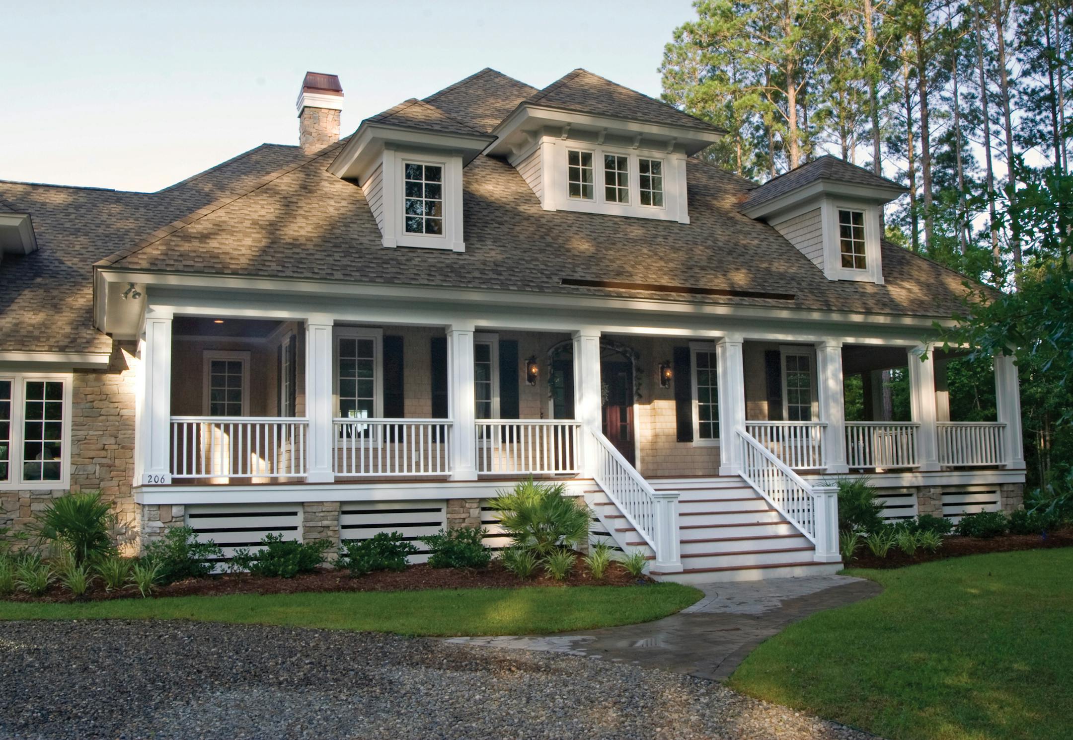 Decorative columns frame the covered porch of this farmhouse-style home. Each room offers views of the surrounding property. Upgraded amenities include scores of built-in cabinets, desks and shelves and striking ceiling treatments. The great room features a wet bar and fireplace. Second-floor bedrooms give access to an upper-level deck. A bonus room above the garage offers space for expansion.