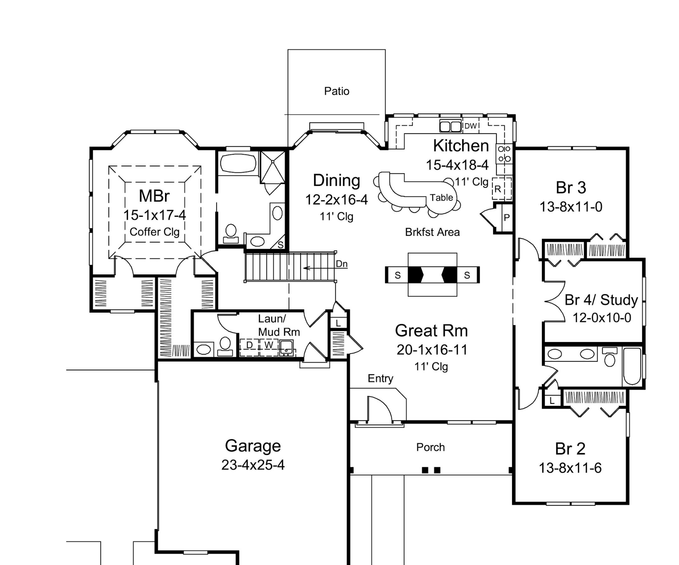 Large windows, twin dormers and a discreet side-entry garage give this design big curb appeal. The kitchen island is one-of-a-kind with a curving organic shape, table extension and seating for seven people. A two-way fireplace connects the kitchen with the great room and provides a focal point. On the right side of the home, three bedrooms share a hall bath outfitted with two sinks. One of the bedrooms is set up to function as a study if needed. The master suite has privacy on the opposite side of the floor plan, and boasts a bay window, tray ceiling and two walk-in closets.