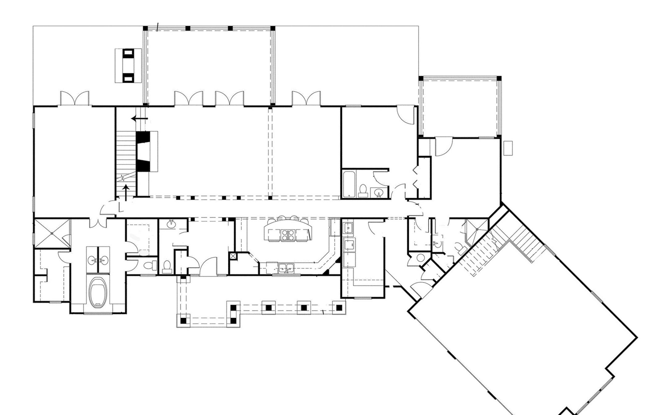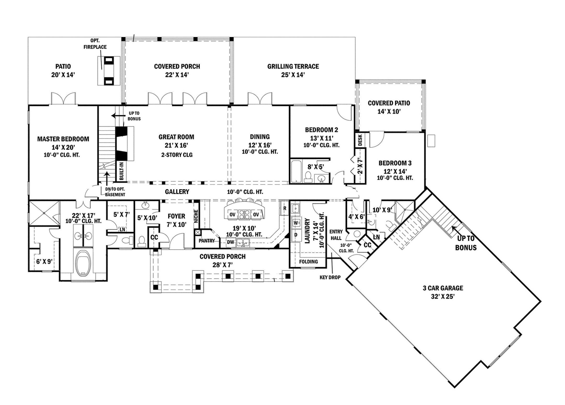 A full front porch opens to this ranch-style home, which features an open layout of the great room, casual dining room and extensive kitchen, with an 8- by 4-foot island. The central area boasts a two-story fireplace with floating wood beams in the vaulted ceiling. Situated for privacy, the master suite features a bathroom appointed with back-to-back vanities and a soaking tub. The suite also has plenty of closet space and direct access to a patio. In the rear of the home, there's a porch, terrace and a second patio, as well as a spot for an optional fireplace. Two additional bedrooms with private baths also access the outdoor living spaces. The large laundry room includes a counter for folding clothing. Two separate bonus spaces upstairs include a full guest apartment with a kitchen over the garage and another bedroom suite in the main house.