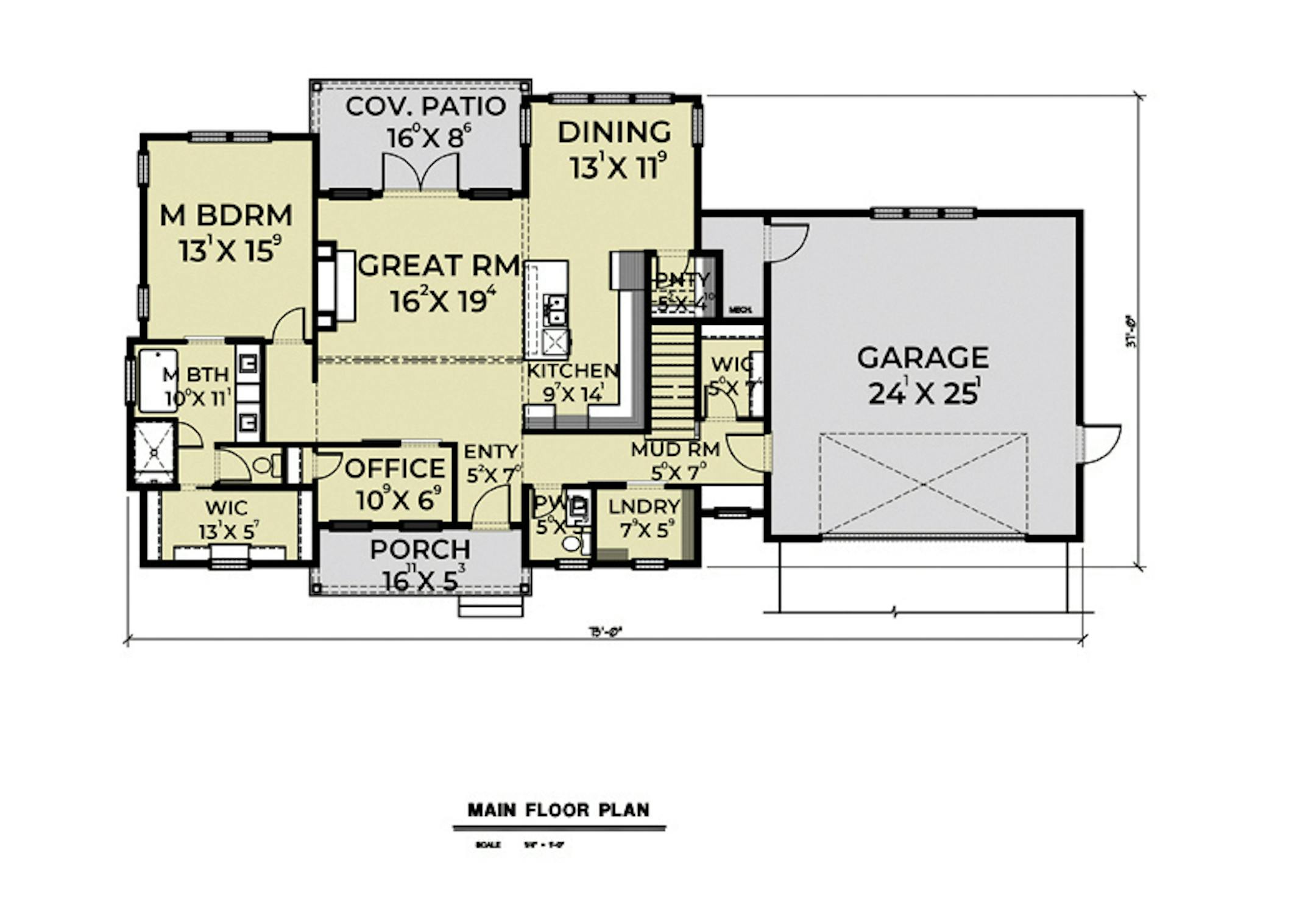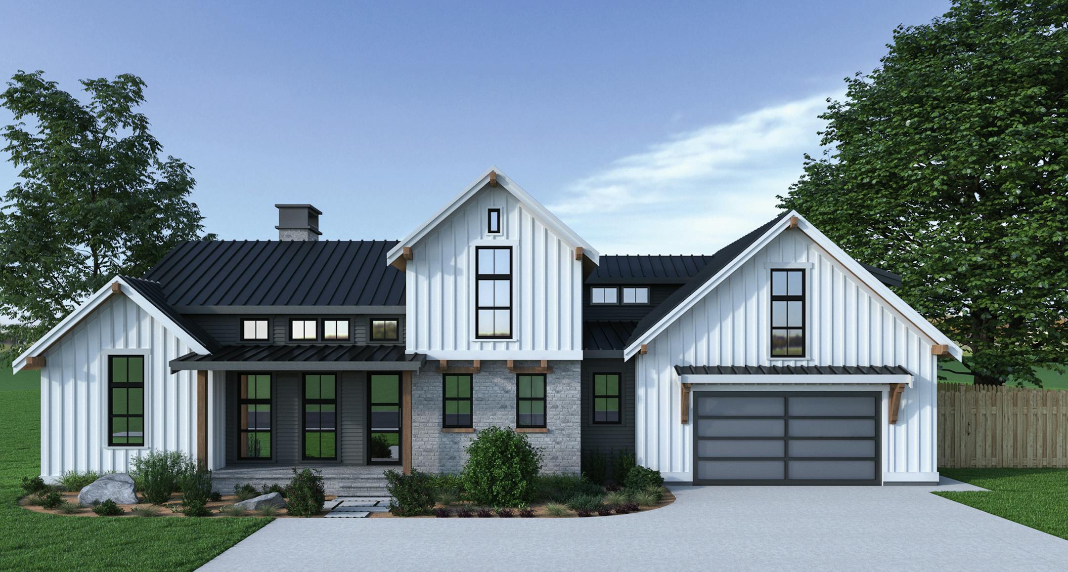 Stylish curb appeal meets a relaxed, modern layout in this striking home. The master suite is easy to reach on the main floor and gives you a large walk-in closet, five-piece bathroom and a view to the backyard. There's lots of room to spread out, from the kitchen island to the vaulted ceiling in the spacious great room. Board-and-batten siding and a front porch give it a taste of country charm.