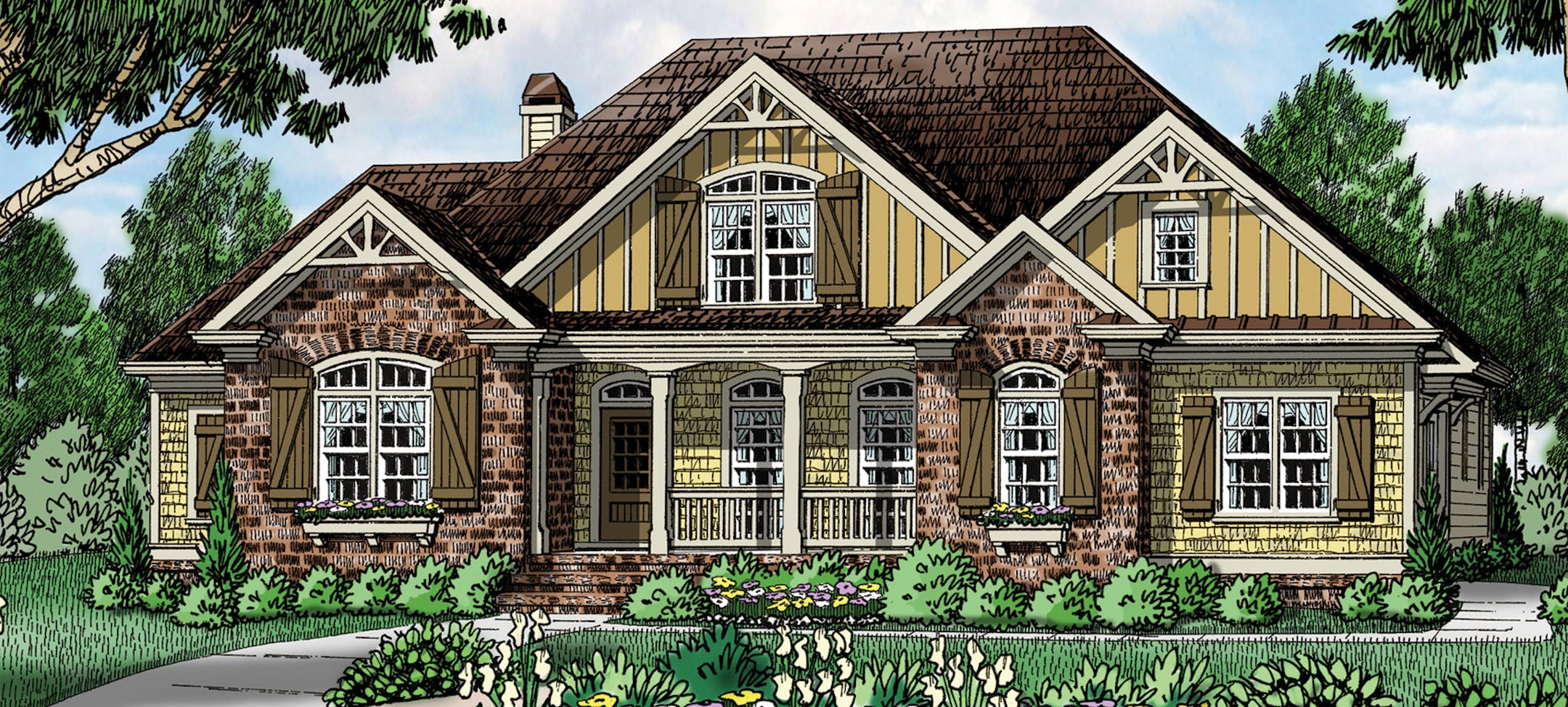 A mix of exterior materials, including brick, add personality and charm to this English cottage-style home. Inside, decorative ceiling treatments crown the vaulted great room and the master suite. The kitchen features an island and a breakfast nook. A vaulted rear porch and deck provide outdoor living. The split-bedroom layout gives privacy to the master suite, which features a walk-in closet and dual-sink bathroom. The second level offers a retreat for a teenager or a live-in relative, with a spacious bedroom, a full bathroom and even a study area.