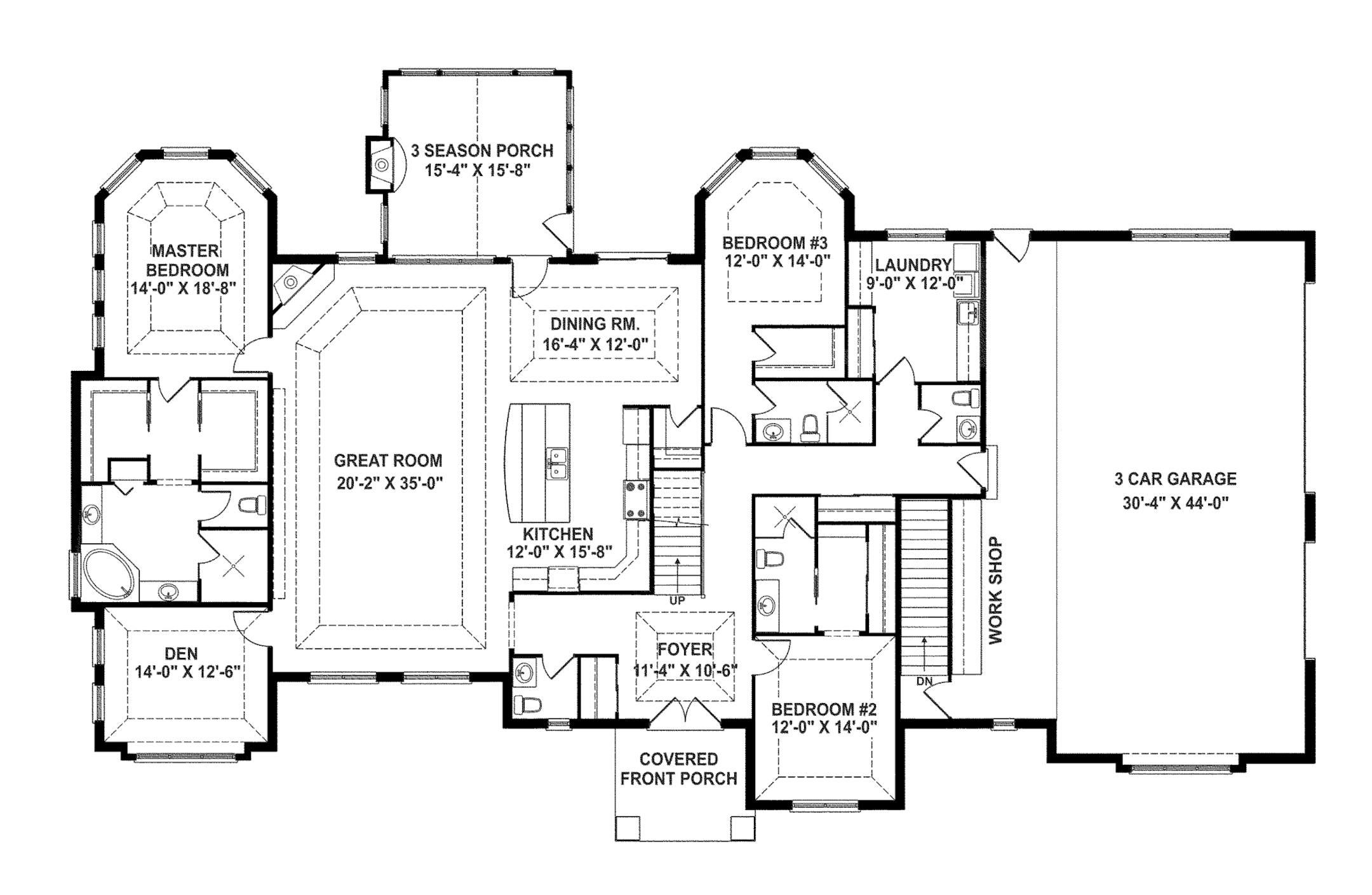 PLAN HOTW130038 • Total finished sq. ft.: 3,554 • Bed/bathrooms: 3/ 5 • Stories: 1 • Garage bays: 3 • Foundation: Unfinished basement