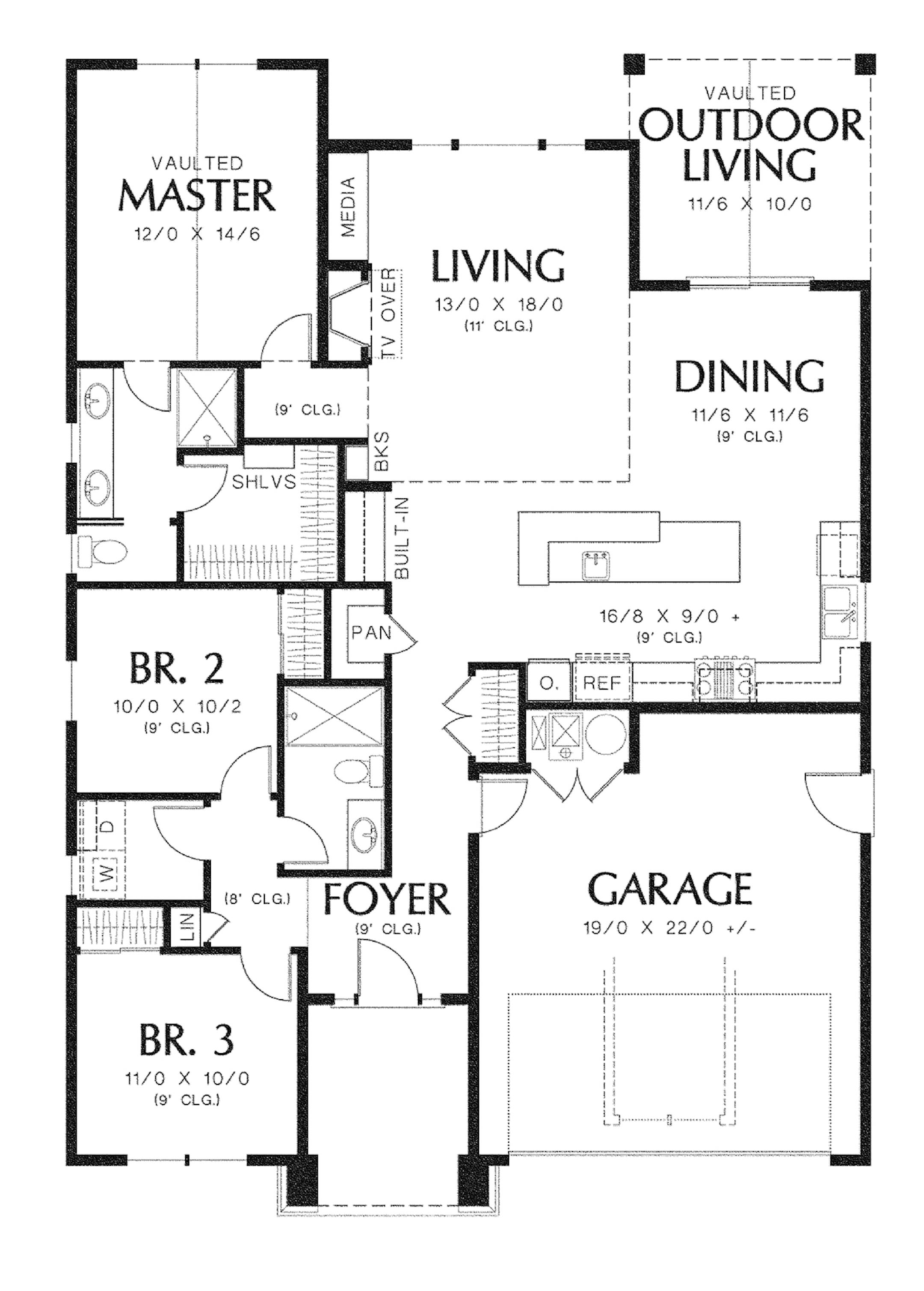 This one-story ranch with Craftsman detailing brings a modern twist with an emphasis on open spaces. The layout includes three bedrooms, two full bathrooms, and other amenities that make this home efficient for smaller households. The wide kitchen island — complete with a snack bar and vegetable sink — is an unexpected feature in a 1,529-square-foot home. Nearby, the open living and dining spaces flow into one another. The master suite features a foyer to screen the bedroom from view of public spaces and a walk-in closet. Two more bedrooms share a bathroom and easy access to the laundry room near the front. The dining area opens to a vaulted outdoor living room for entertaining.