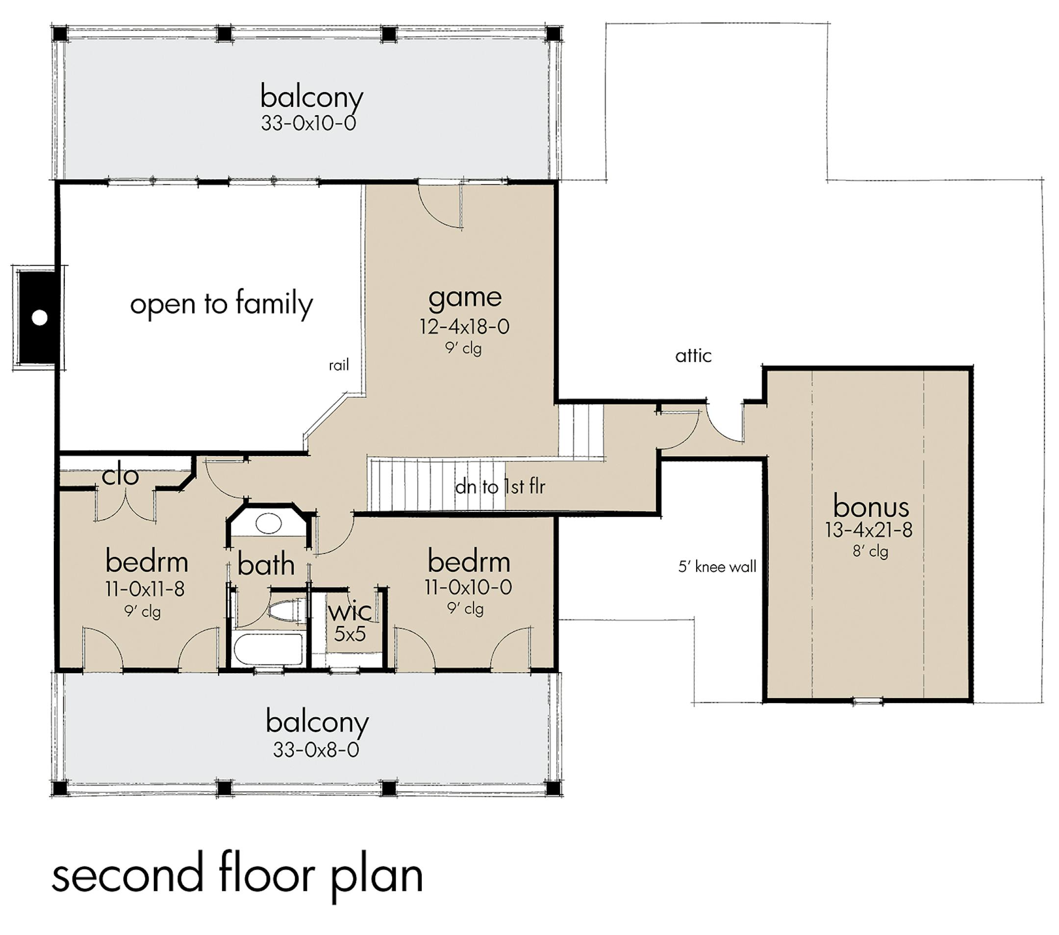 A large front porch and metal roof add Southern style to this plan. A spacious open layout between the family room and kitchen make this home feel clean and contemporary. The well-equipped kitchen provides plenty of counter space and features a big walk-in pantry, while a dining room off to the side is for formal meals. A secluded main-level master suite is tucked away to the rear of the floor plan. Upstairs are two additional bedrooms and a game room that could be used as a home office. Another bedroom can be added inside the bonus space above the garage. There are abundant outdoor living areas on the verandas or balcony.