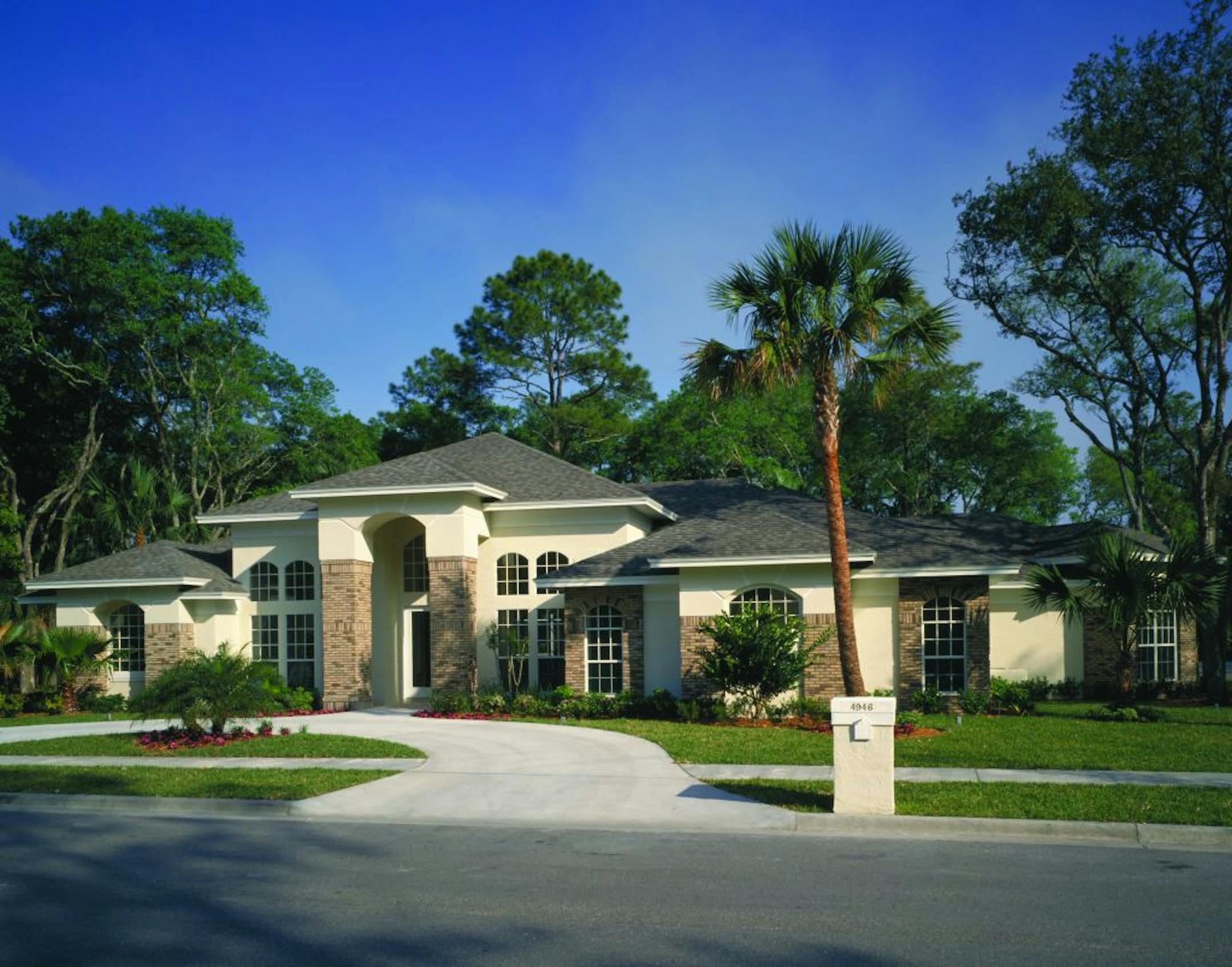 Soaring brick columns create an impressive front entry. The angle design creates unlimited views and spaces that appear larger. The master suite retreat is appointed with his-and-her walk-in closets and double vanity sinks. The den/study can be used for a home office or guest suite. The family room features a built-in media center and fireplace. Island kitchen has a view of the nook and family spaces and includes a big walk-in pantry. Second bedrooms share privacy and quiet at front of house. Rear-entry garage is easily converted to a side entry.