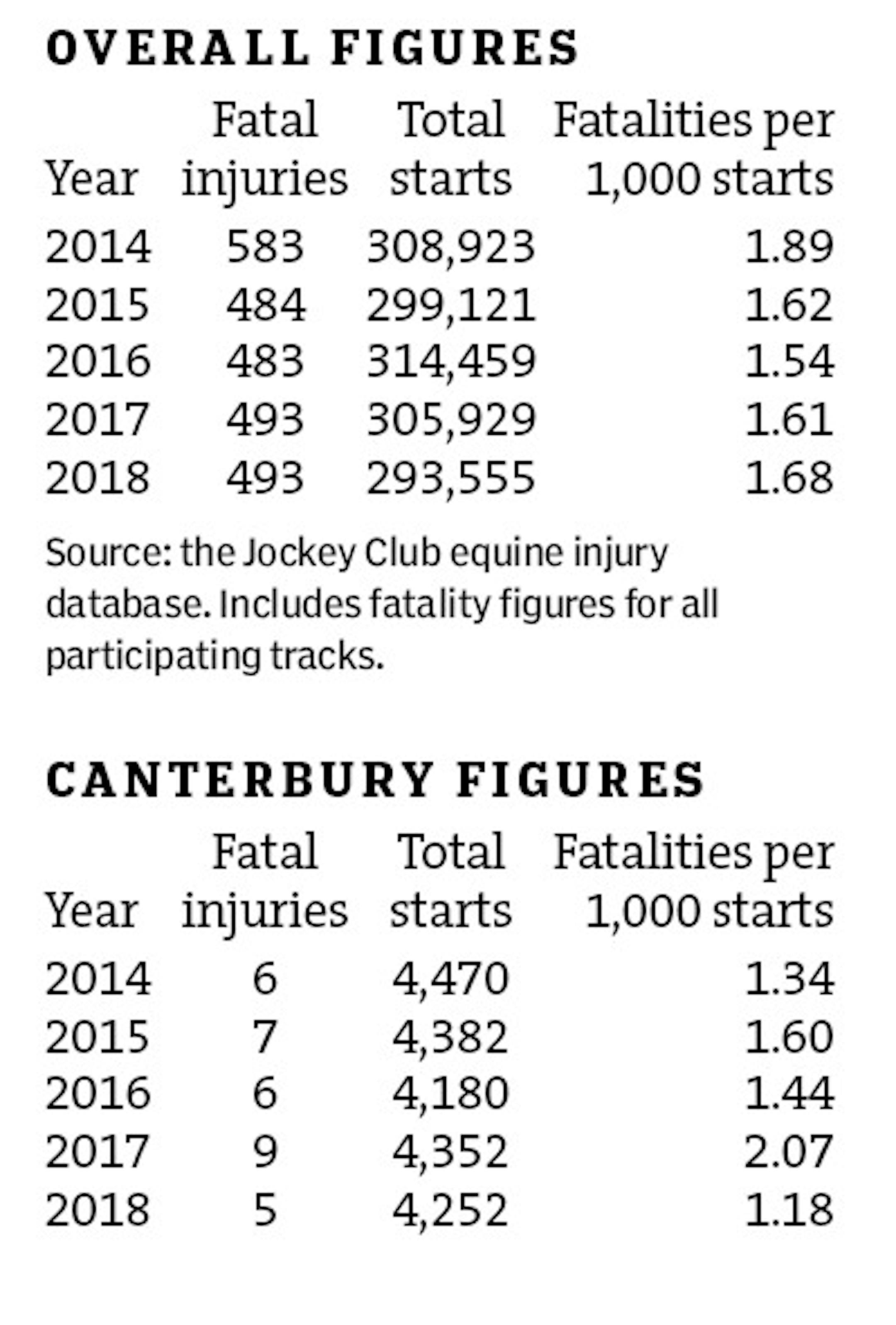 In 2008, the Jockey Club created the Equine Injury Database to collect info on fatal racing injuries to thoroughbreds. The group hopes the data will shed more light on breakdowns. Canterbury Park is among the 113 North American tracks included in the database. The first chart shows racing fatality figures for all participating tracks from 2014-2018. The second shows figures for Canterbury Park.