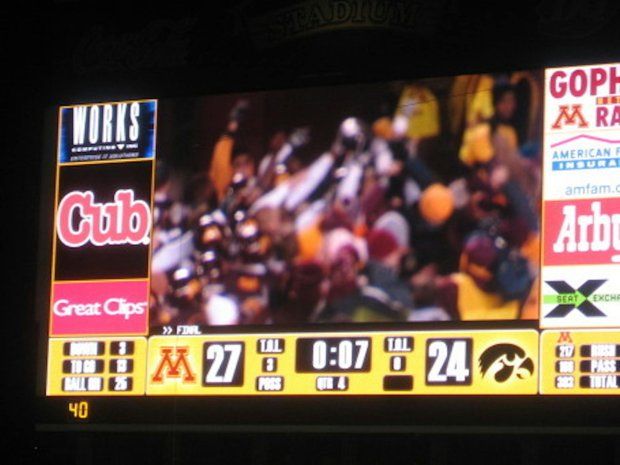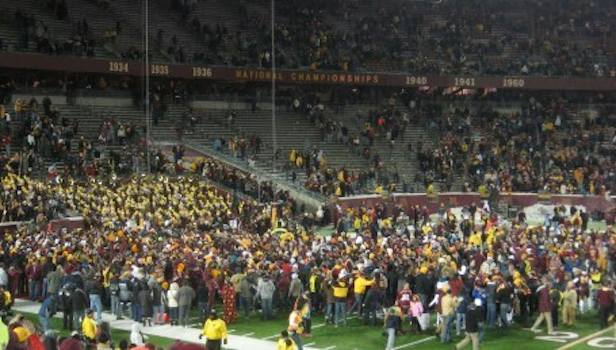I will be the first to admit, I thought this was a lost season. I asked Coach Horton at his press conference before Illinois why he wasn't playing MarQueis Gray at Quarterback. I said all people care about now is building on what we have to be in a good position next year. I have absolutely nothing against Adam Weber, but he wasn't going to be winning games for us next year. Horton replied that he needs to give this team the best chance to win, and put the best combination out there, and boy, did he ever. Weber won that Illinois game for us, and it finally clicked for me – this wasn't a lost season. That win felt so good, the players felt good, the coaches felt good, I didn't think one win, this late in the season would have that much meaning. After the bye week came the Iowa game today, and I don't think more than 1% of the world thought we would win this game. I thought we could play them tough, I thought we could walk away with a moral victory, but we walked away with Floyd of Rosedale! What this means to the fans and team is really indescribable. None of the players on the roster had won a Trophy game at Minnesota, with our last trophy win (Floyd of Rosedale) coming in 2006. This is the first trophy win in 11 games, and first win against ranked opponent in 18 games. Over the past 4 years, there have been many ups and downs, but this was just about the best win you could hope for. Not only is this a cause for celebration, but this is now a building block to go into next year. I know many people around the country will not understand how a 2-9 football team and fans can be so elated to win their 3rd game, but there's really no way to describe the feeling, and how special this win was to all of us.