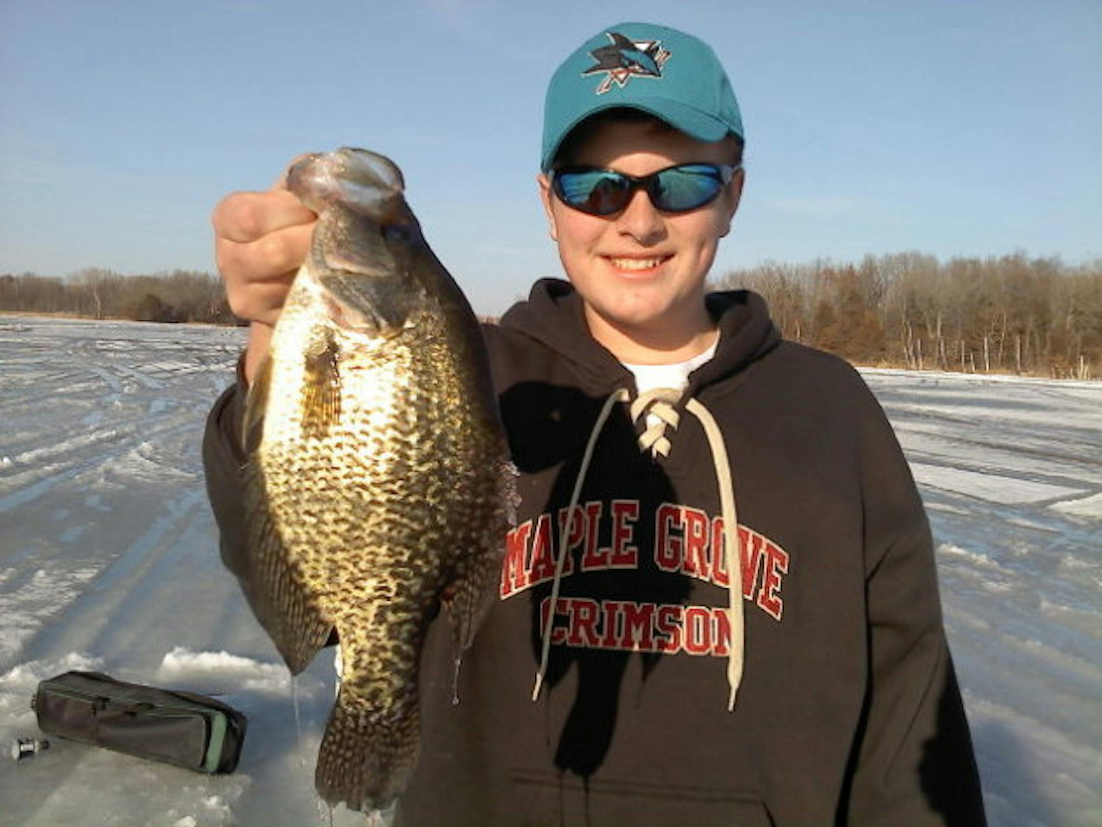 It's hard to believe I was standing on the ice in a black t-shirt thinking about taking it off because of the heat. With 12" of ice left on the small lake my boys and I were standing on (actually lost 3" since Monday), 10" was solid, the top two inches--Junk. But still plenty to walk on. Plus the fish are hittin' good just under the ice.