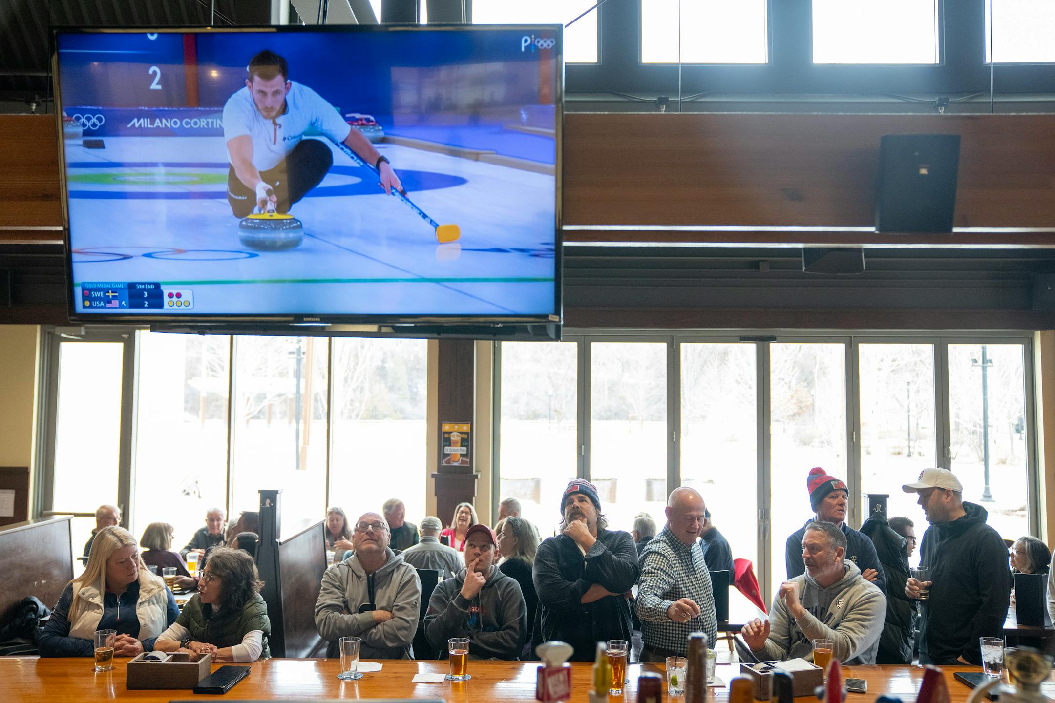 People walk around the indoor track above a basketball court inside the Chaska Community Center on Feb. 10. Community members, including David Christian, a member of the 1980 Olympic USA hockey team, enjoy food and drinks during a watch party for the Olympic curling mixed doubles gold medal match at the Crooked Pint inside the Chaska Curling Center on Feb. 10.