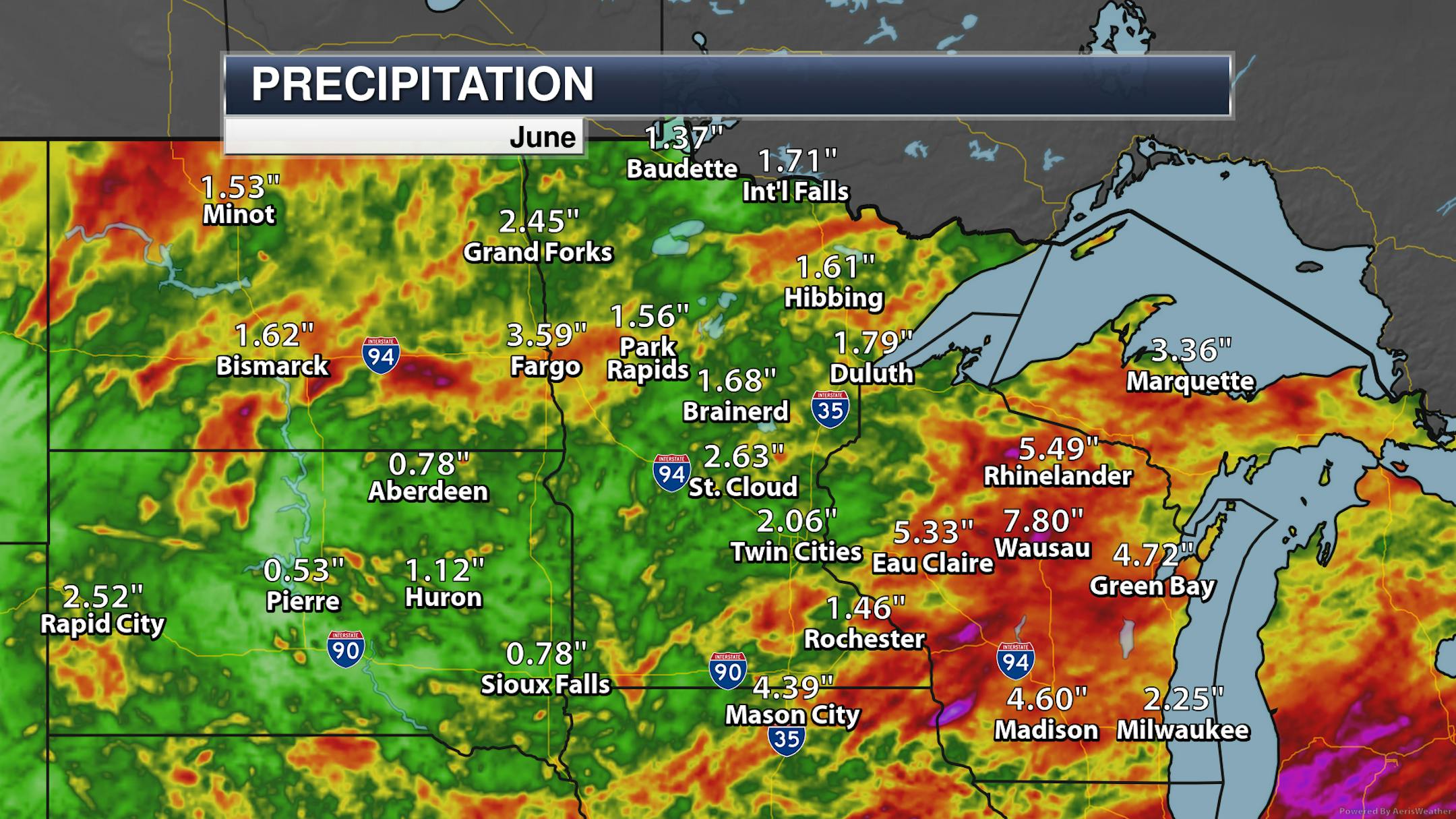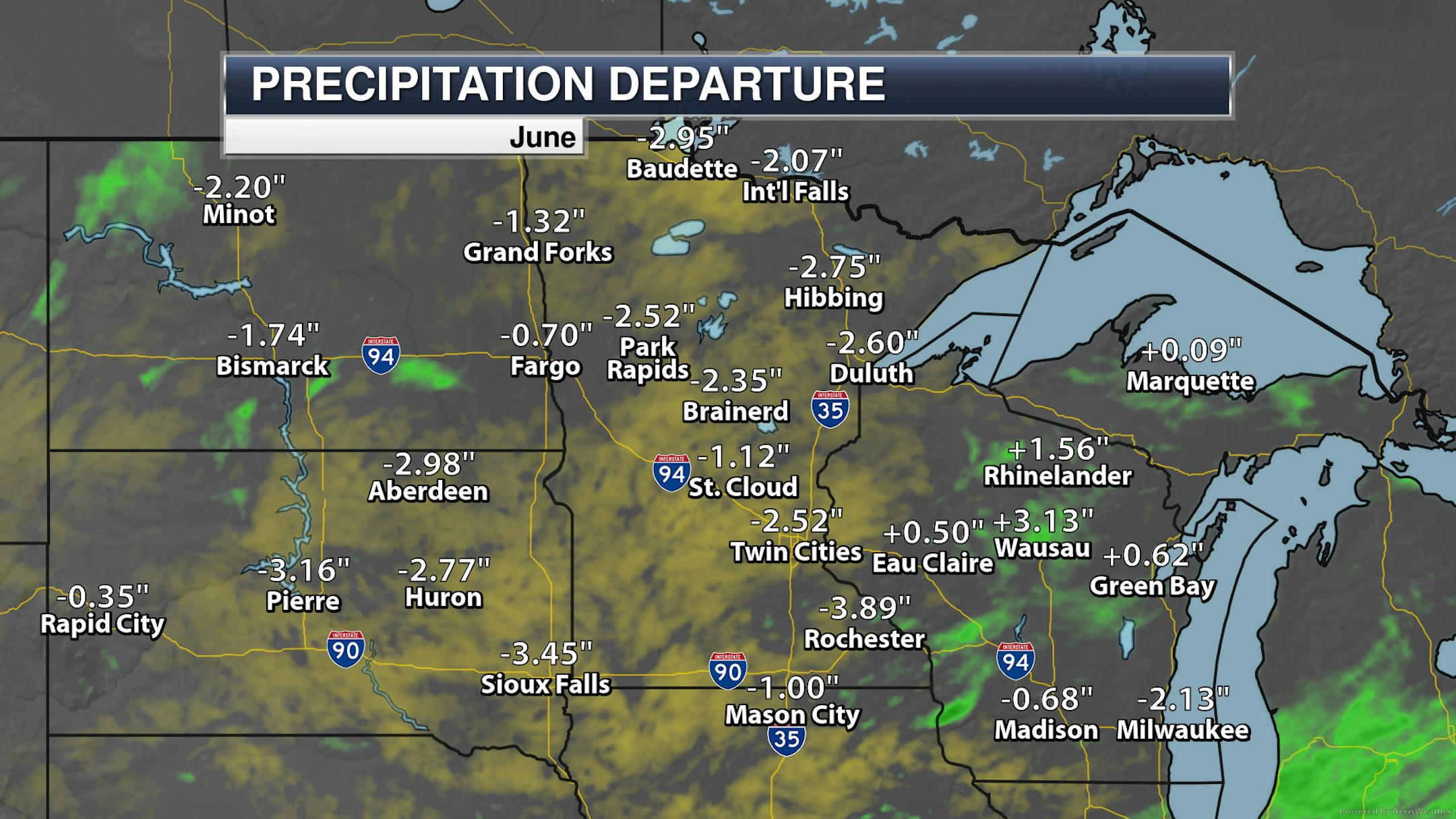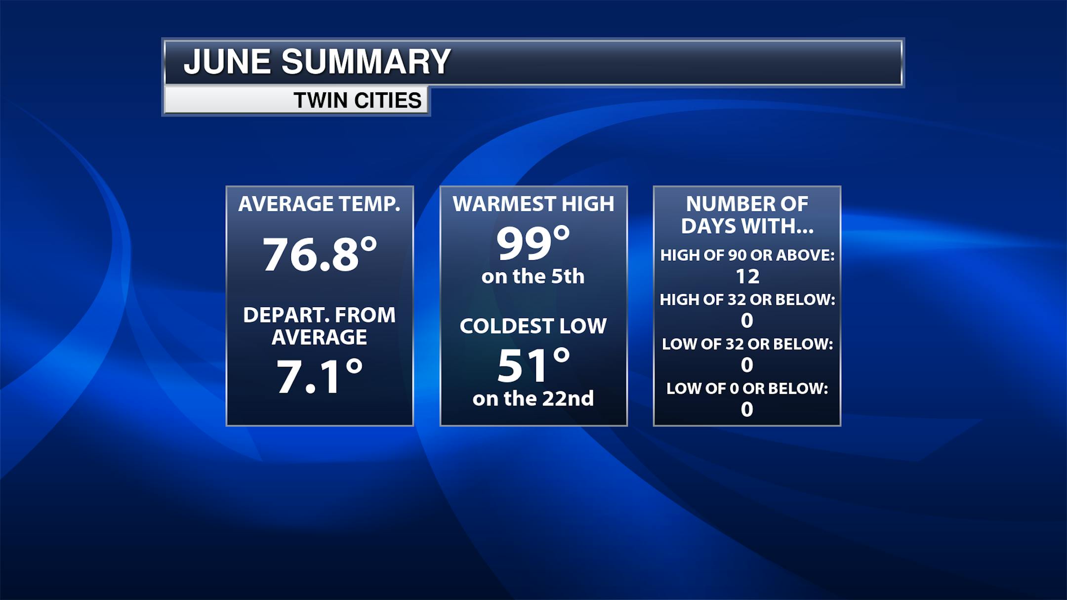 The month will also be remembered for being quite dry across the state, with all climate sites reporting below average values between 1" to 3" from the normal. In the Twin Cities, it was the 25th driest June on record.