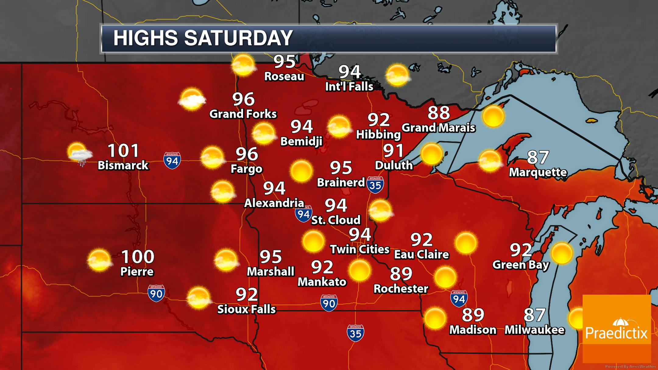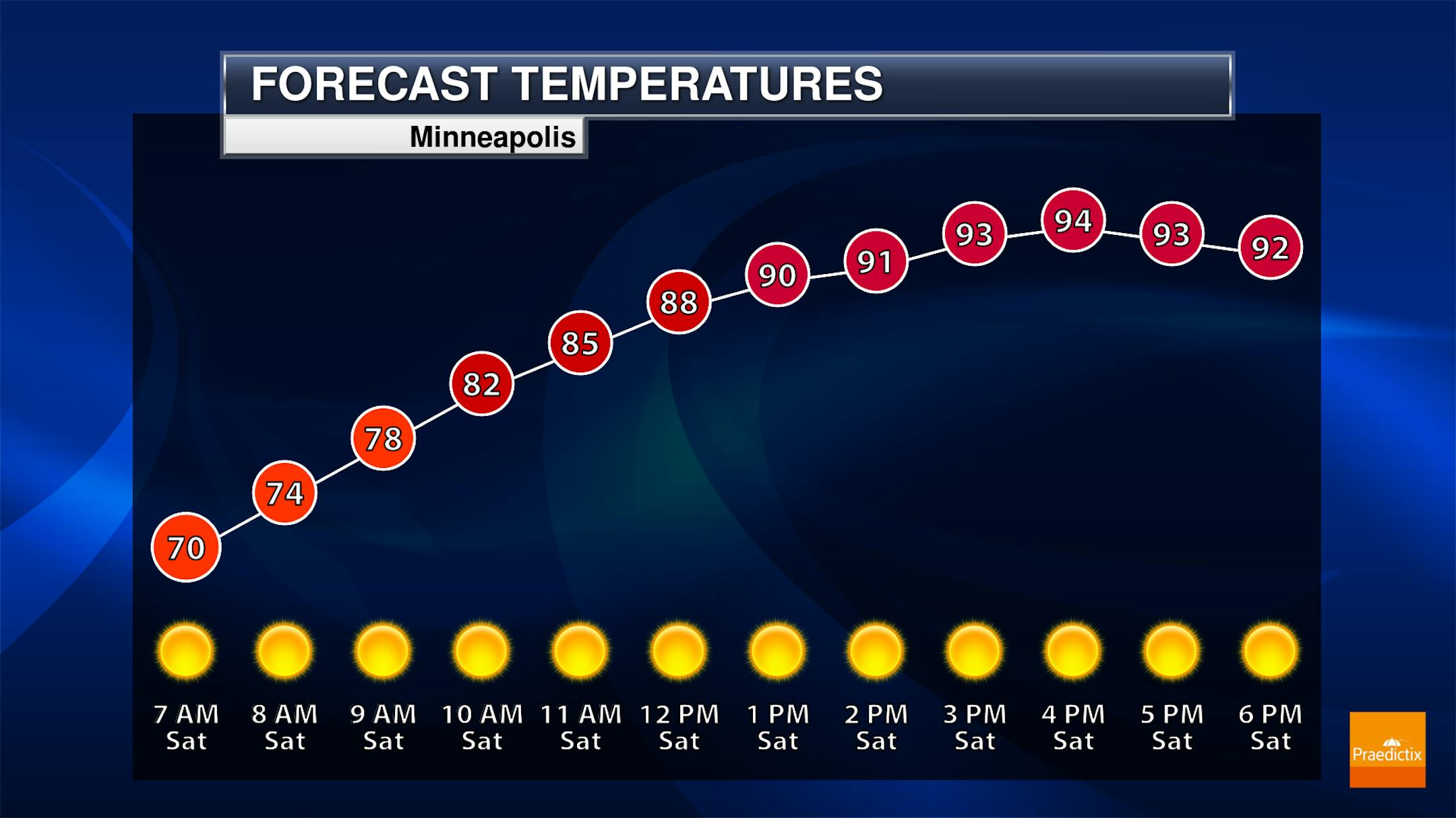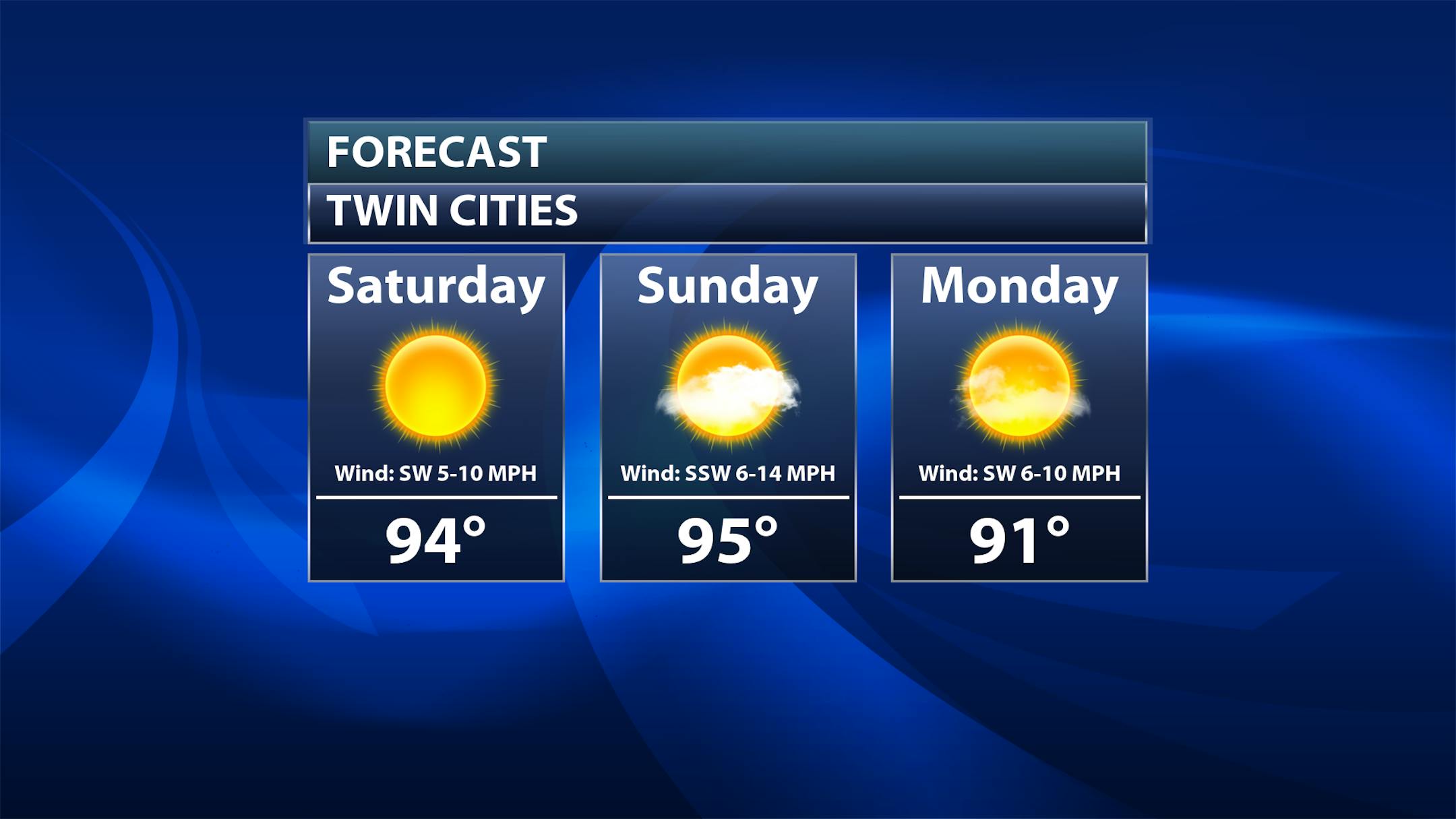 As we look at the Twin Cities, once again we'll see mainly sunny conditions this weekend with hot weather in place. I can't rule out an isolated storm potentially making its way into the Twin Cities late Sunday afternoon, but a better chance of storms will potentially occur into the overnight hours. However, we are still going to be hot on Monday with highs in the 90s once again.