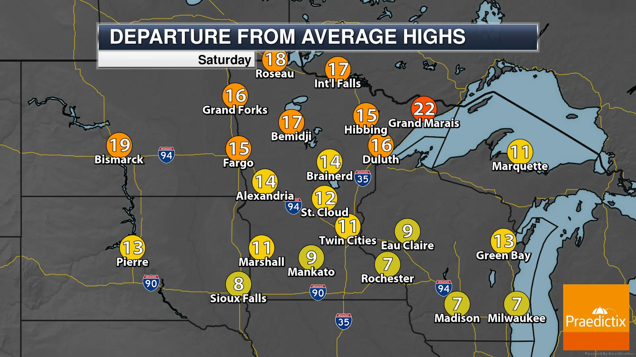 Many areas of the state will reach the 90s for highs on Independence Day Sunday, the exception being along the North Shore where highs will be "stuck" in the 80s. A few locations out in southwestern Minnesota may even approach 100F! As a cold front slowly starts to sag southward on Sunday, a few showers and storms will be possible during the daytime hours across the northern half of the state.