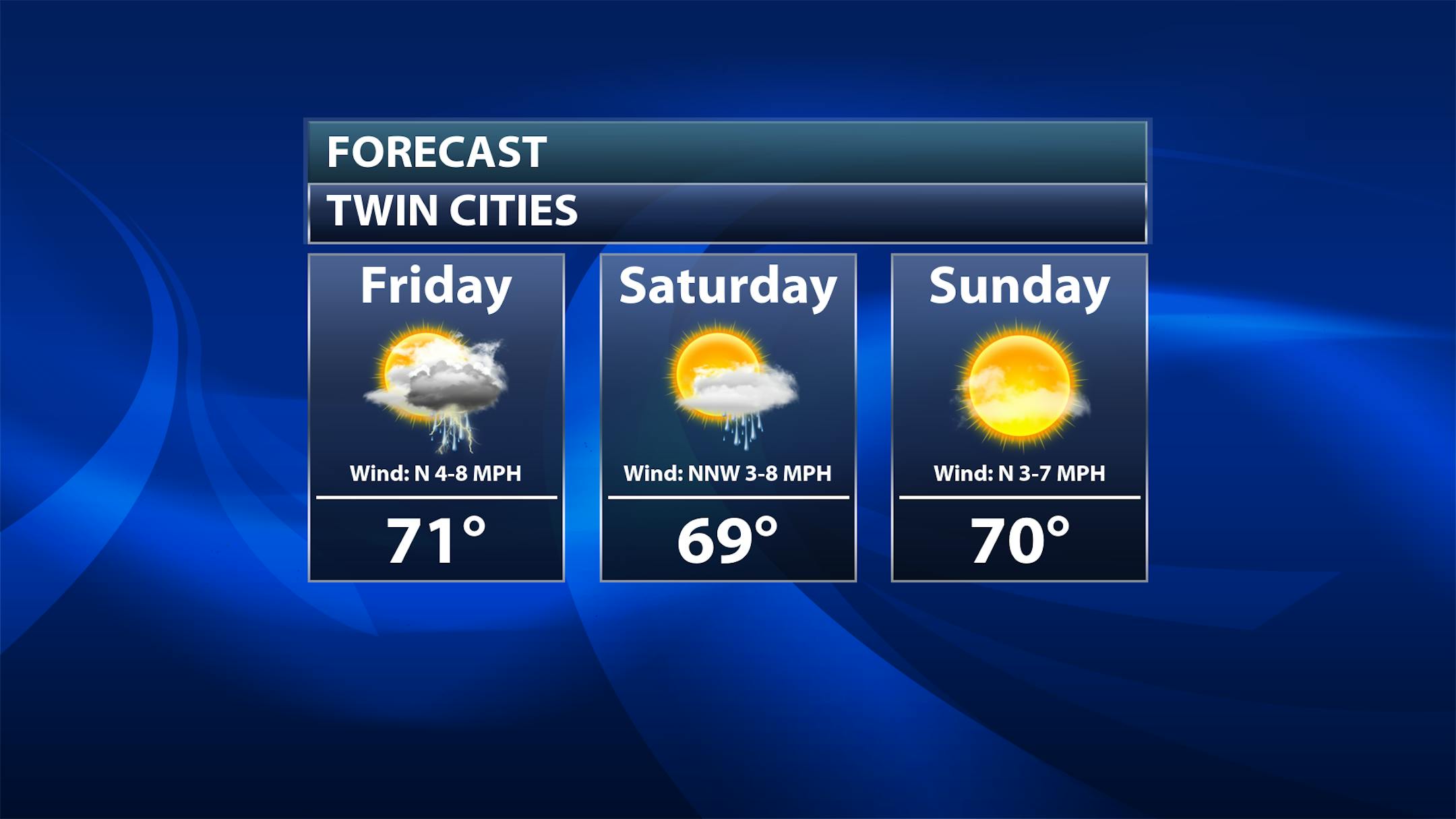 Some of the better chances of showers in northern Minnesota will be later in the day, expanding across western Minnesota into the evening and overnight hours as well. A few of the storms from Alexandria and St. Cloud northeastward into the Arrowhead could be on the strong side with a Marginal Risk of severe weather in place. Hail and wind are the greatest threats.