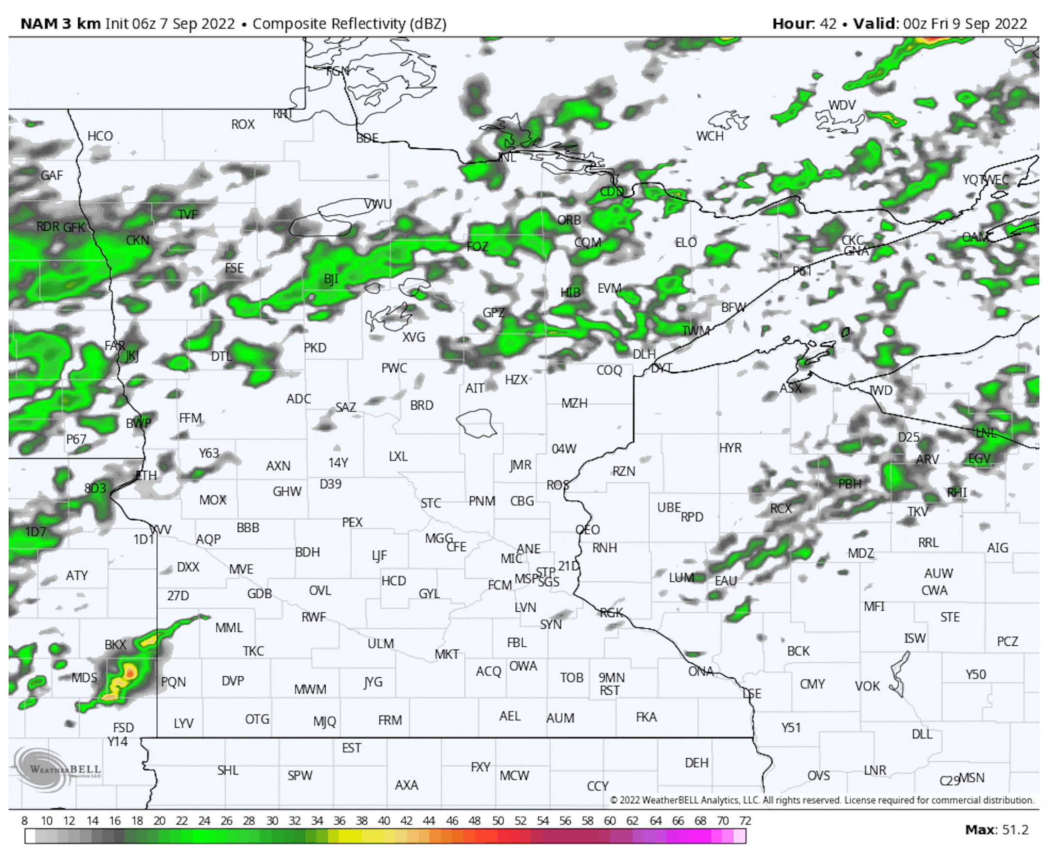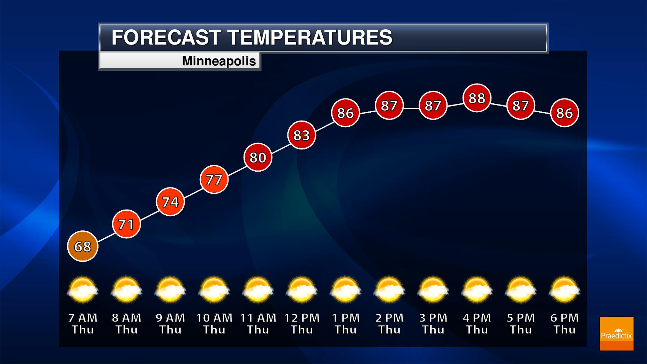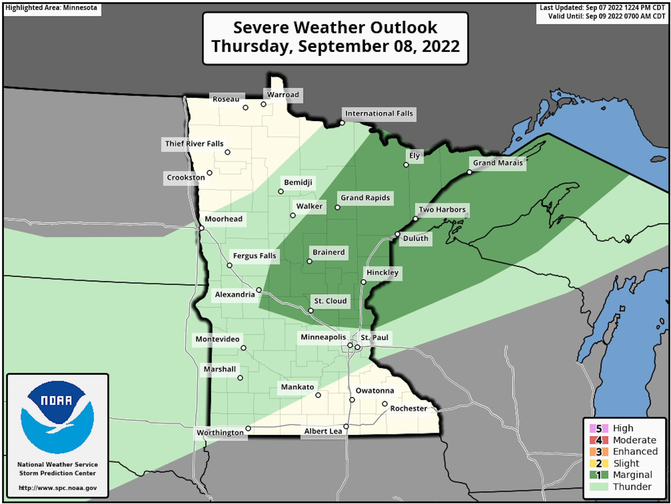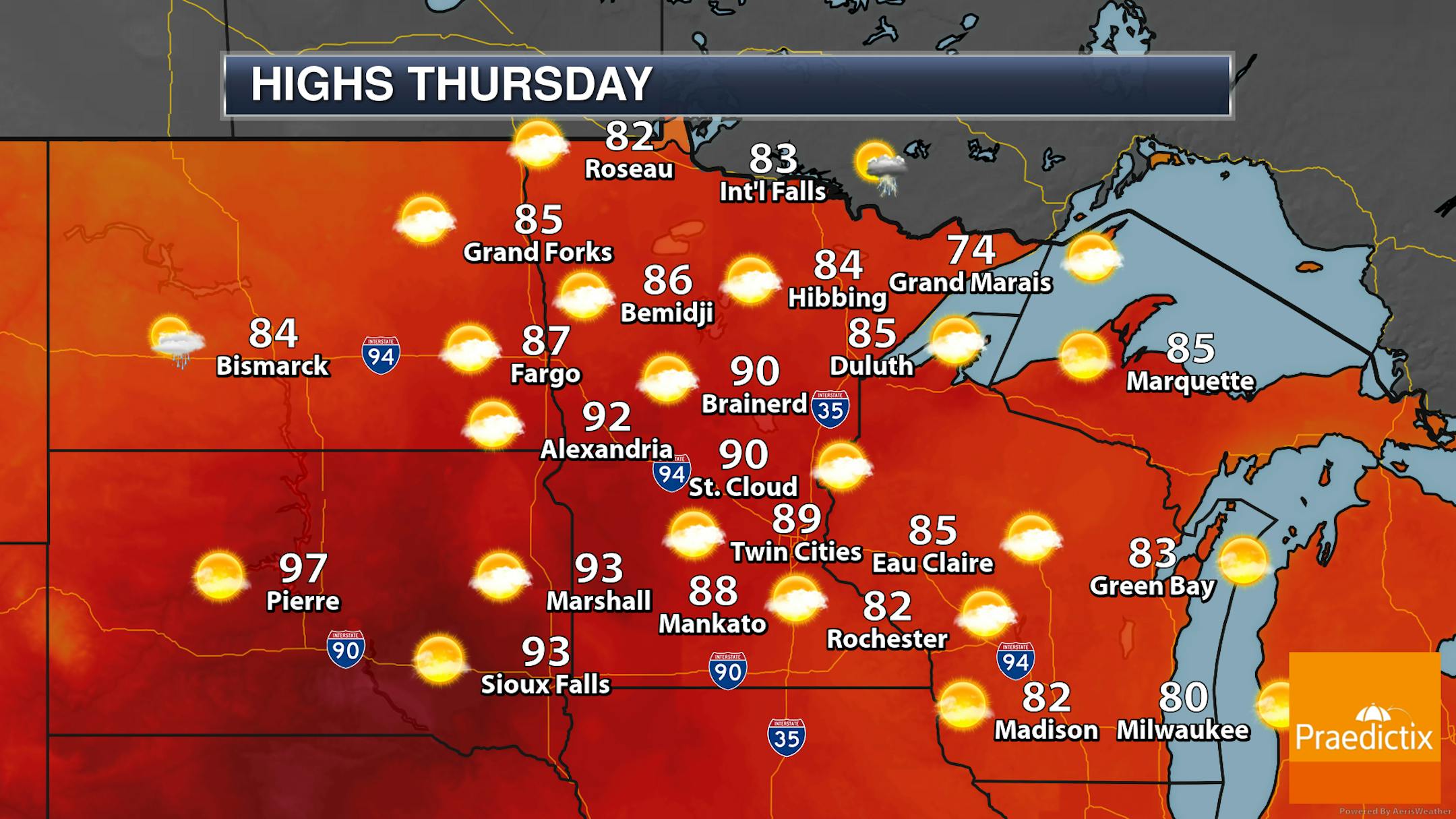 Hot enough for ya? Most of the state will climb into the 80s and 90s on Thursday (except areas of the Arrowhead/North Shore), which will be 10-20F degrees above average for the first third of September. Sunnier skies are expected in southern Minnesota, but there will be at least a slight chance of passing showers at times during the day in northern portions.