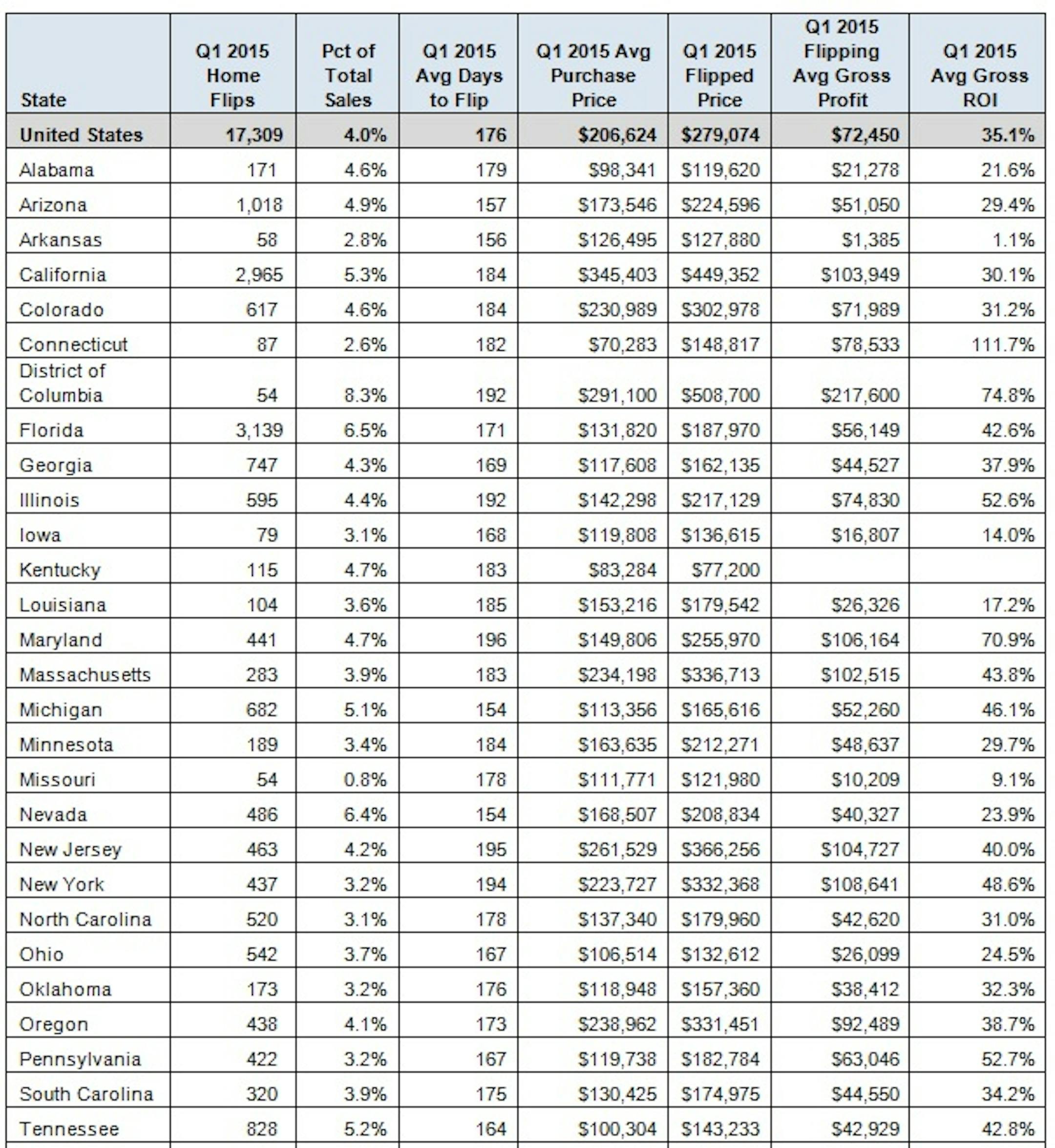 Flipping activity has slowed to the lowest level since the second quarter 2011, but when the average gross return on investment (ROI) — average gross profit as a percentage of the average original purchase price — was 35.1 percent. In Minnesota, there were just 189 flips or 3.4 percent of all sales. Here's a look at flipping activity by state: