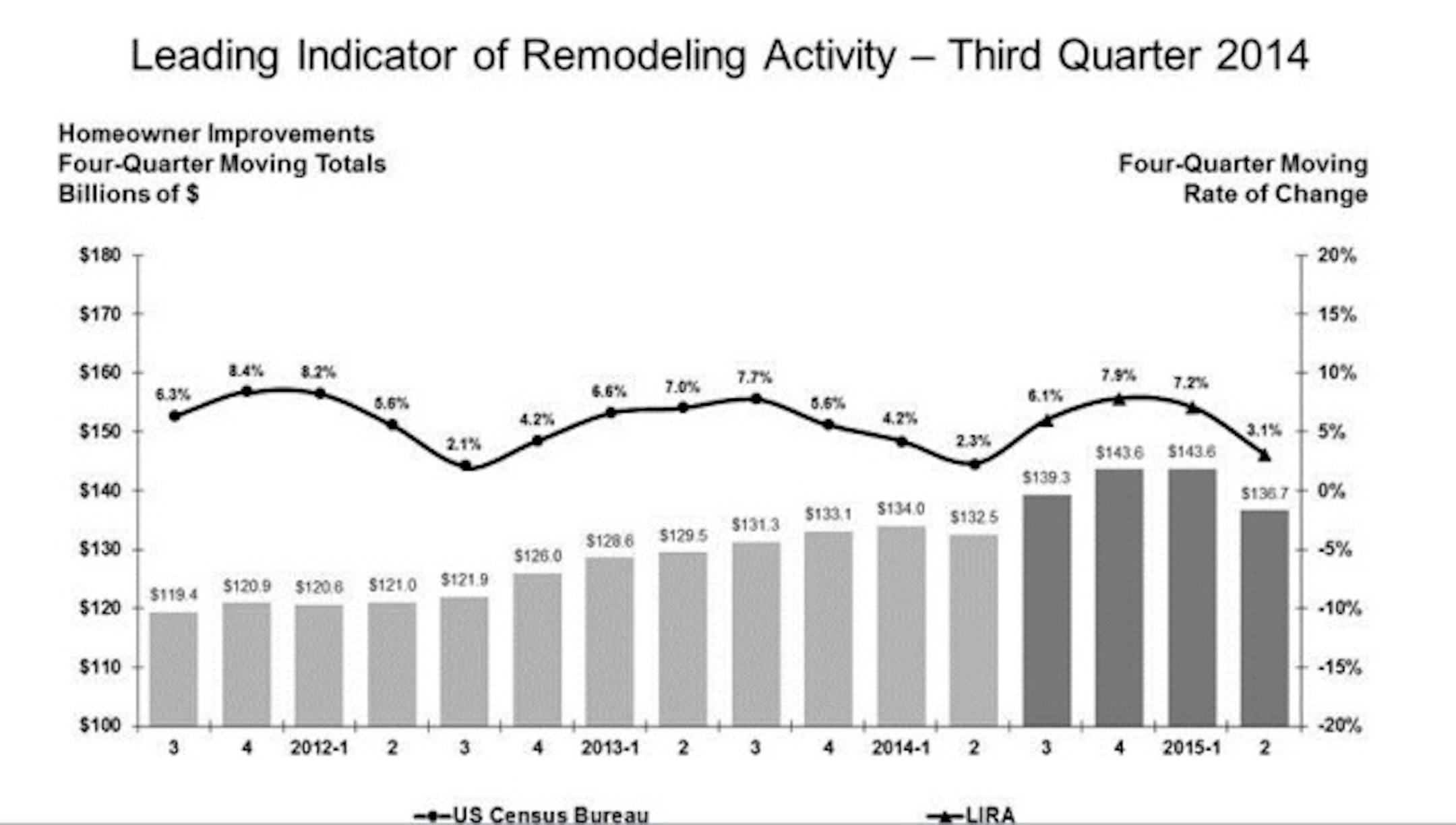 "Stronger gains in remodeling activity are unlikely given the recent slowdowns we've seen in housing starts, sales, and house price gains," says Chris Herbert, acting managing director at the Joint Center. "While the continued recovery in employment should ultimately keep the market on an upward trajectory, remodeling is likely to see slower growth rates moving into 2015."