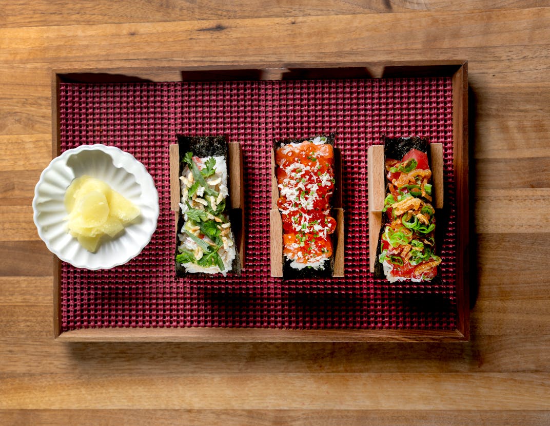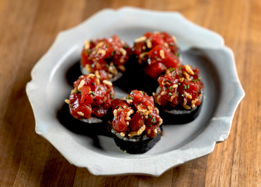 Take the bluefin tuna gimbap, a dish that takes the humble Korean rice roll and transforms it into something entirely new. Unlike traditional gimbap, aka kimbap, where the ingredients are tightly rolled, Watson tosses luxurious diced bluefin tuna with fermented chili alongside toasted rice for texture, and then places it on top of gimbap pieces, creating more of a deconstructed tartare than conventional roll. Not only is it a clever rebalancing of a familiar form, but it’s also a vibrant dish, joyfully bursting with flavors and textures.